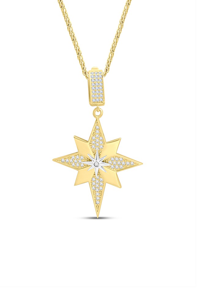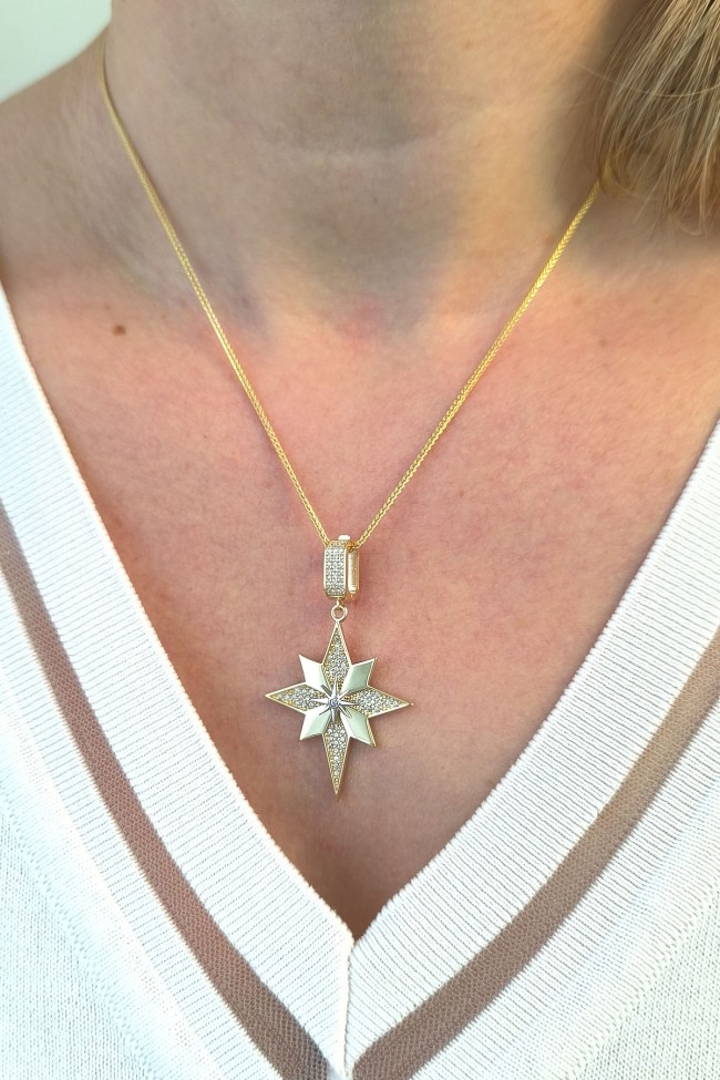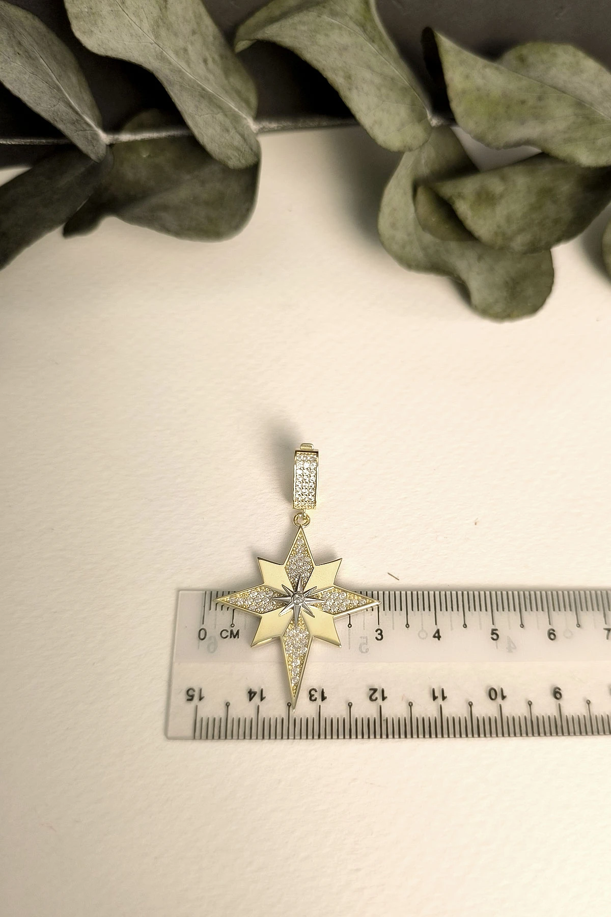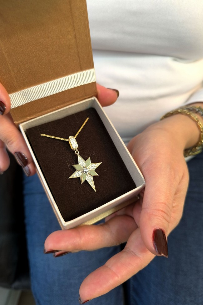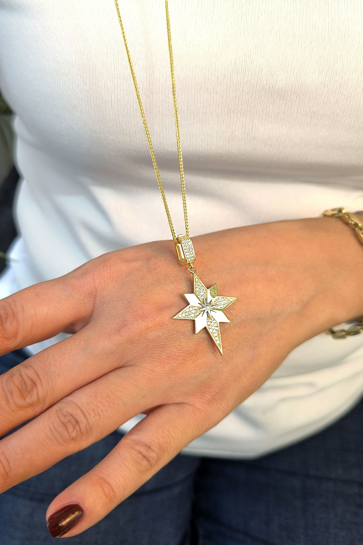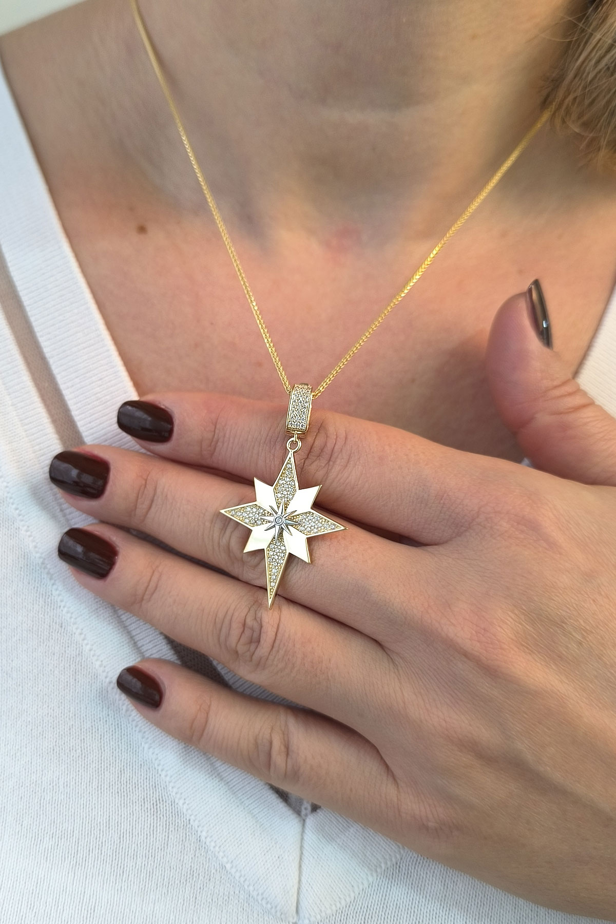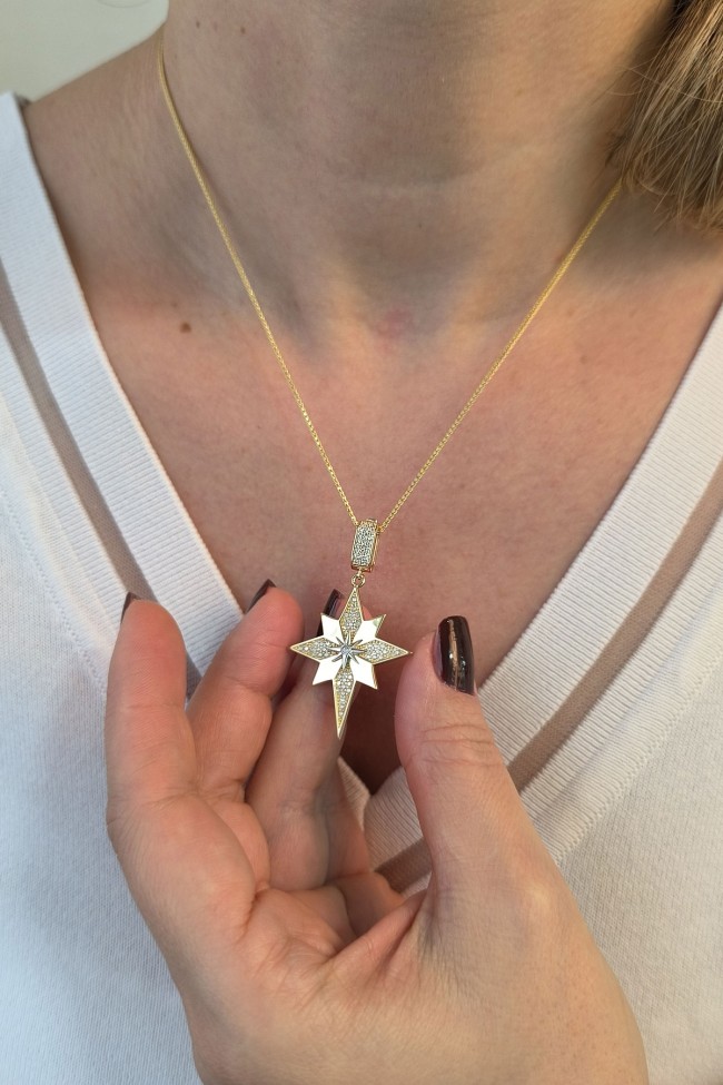 7.00 gr. 4.5 cm boyutunda zirkon taşlı model 14 ayar altın kuzey yıldızı charm kilit kolye. Farklı kolyelerinizle bir arada kombine olarak kullanabileceğiniz harika ve gösterişli bir model.