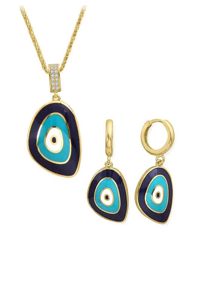 14 Ayar Altın Lacivert Ve Mavi Mineli 12.50 Gr Ağırlığında Charm Kilitli Göz Kolye Küpe Takım.