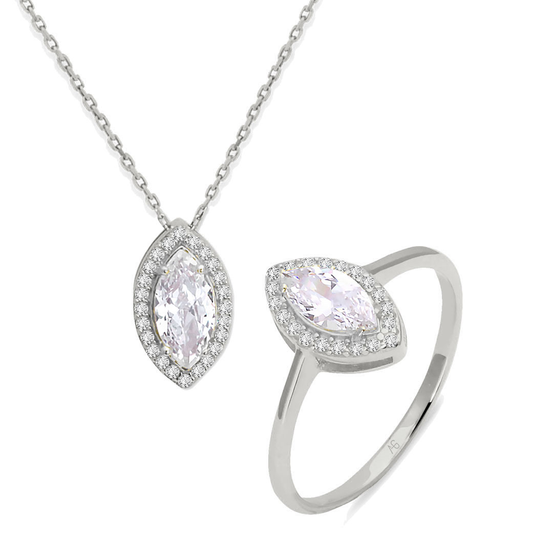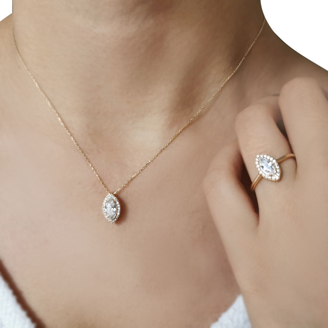 Günlük kullanıma uygun her sezonun modası markiz taşlı tasarımı ile her zaman boynunuzda kolyesiyle kombin olarak takacağınız minimal şık yüzüğüyle size çok yakışacak 14 ayar 4.05 gr ağırlığında altın ikili takım.