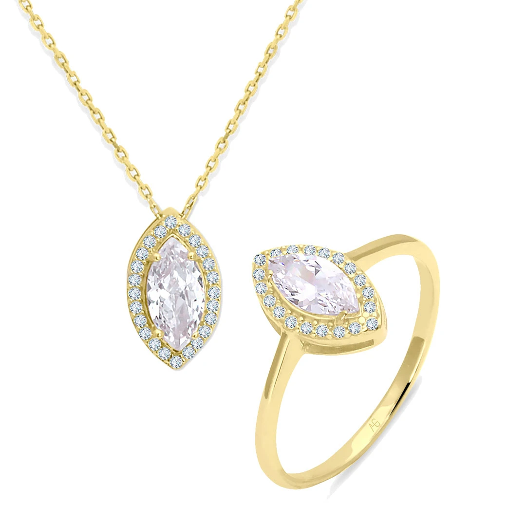 Günlük kullanıma uygun her sezonun modası markiz taşlı tasarımı ile her zaman boynunuzda kolyesiyle kombin olarak takacağınız minimal şık yüzüğüyle size çok yakışacak 14 ayar 4.05 gr ağırlığında altın ikili takım. *Ürünlerimiz faturalıdır güvenle satın alabilirsiniz, özel hediye kutusunda ücretsiz kargo ile gönderilecektir.
