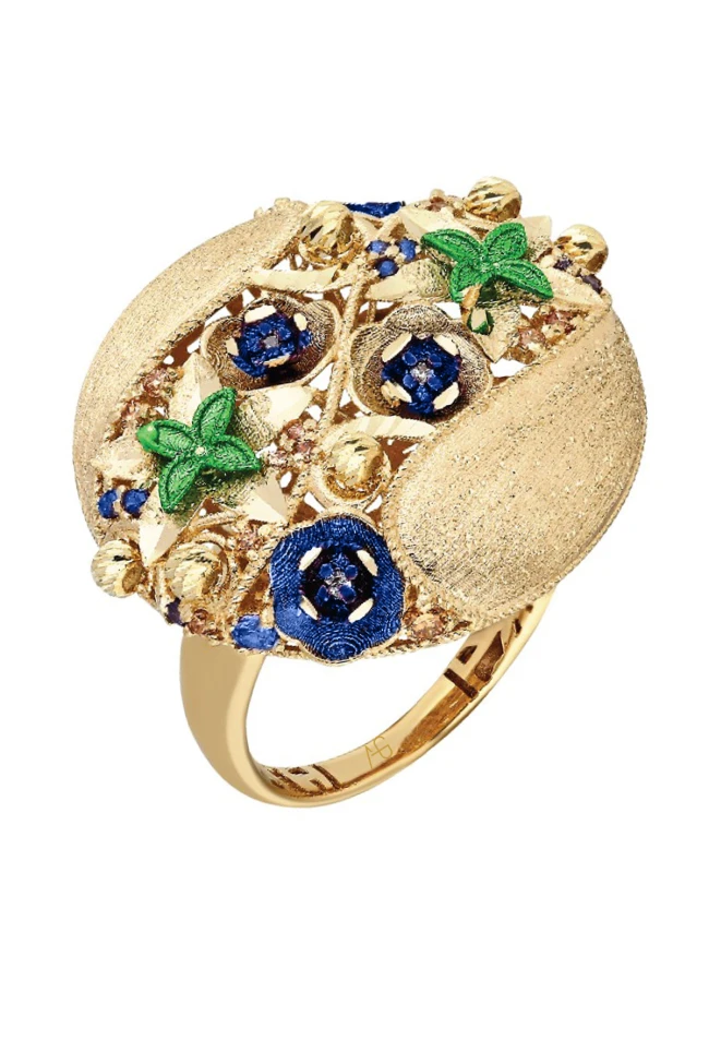 İtalyan tasarım mavi gül modelle işlenmiş zarafetini parmağınıza taşıyan bu 14 ayar altın yüzük, her detayıyla bir hikâye anlatır. El işçiliğinin inceliğiyle hayat bulan gül motifleri, doğanın en saf ve renkli anlarını altınla buluşturur. Renkli sıcak tonların uyumu; güçlü, özgün ve stil sahibi kadınların ruhunu yansıtır.