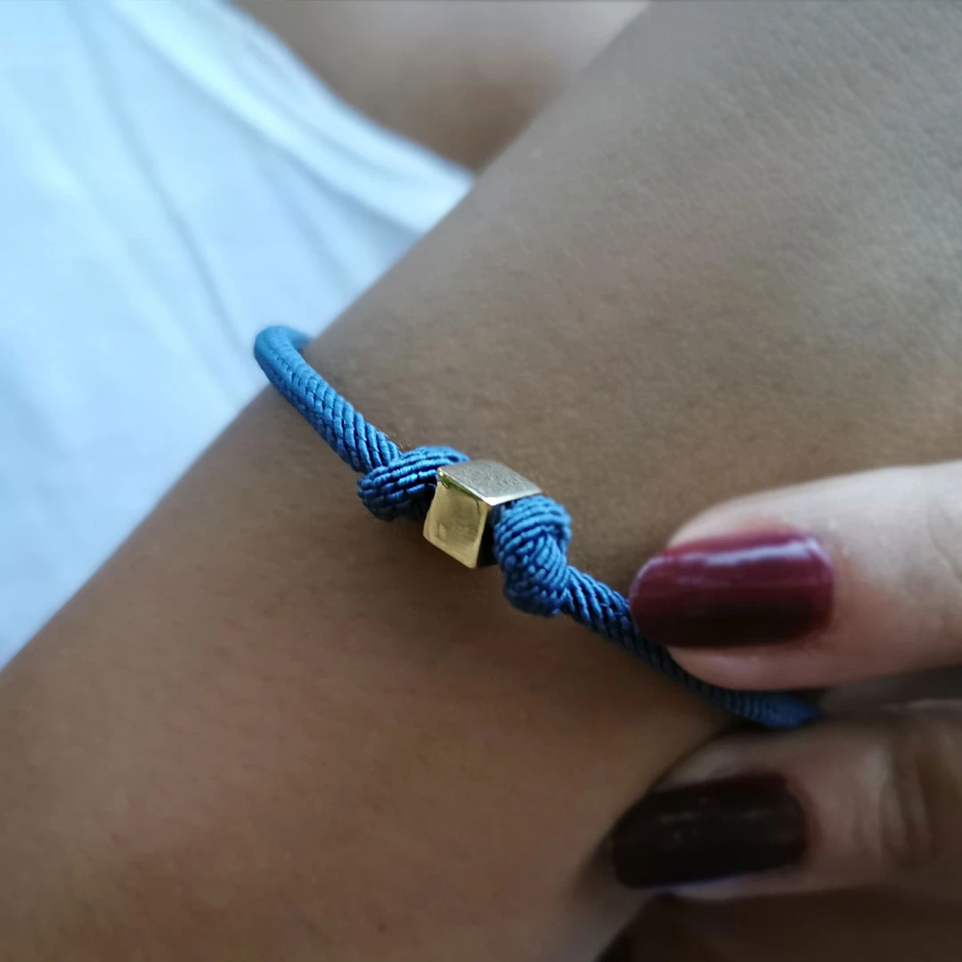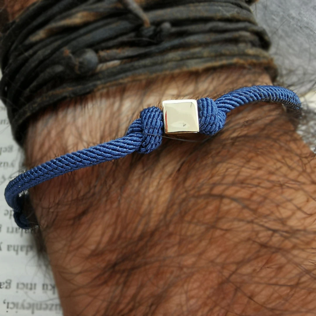 Küp detaylı tasarımı ile günlük olarak da kullanabileceğiniz, özel günlerinde sevdiklerinize şık bir hediye seçeneği olacak 0.40 gr ağırlığında 14 ayar altın taşsız mavi özel örgü ip detaylı unisex kullanıma uygun spor bileklik.