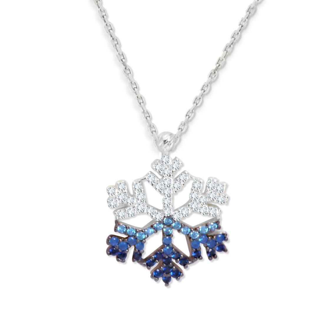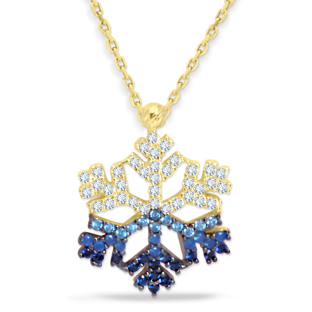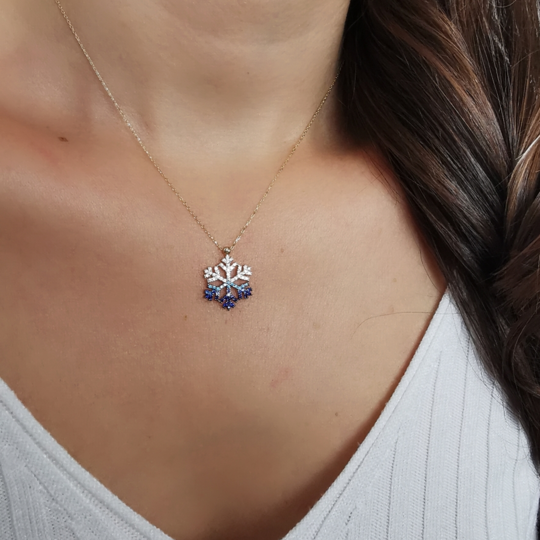 14 Ayar altın 2.25 gram ağırlığında mavi beyaz taş kombinasyonu tasarımıyla yaz kış severek kullanacağınız, spor giyim tarzınıza muhteşem uyum sağlayacak kar tanesi kolye.