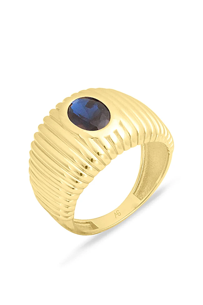 14 Ayar şık estetik modeliyle oldukça zarif ve aynı zamanda havalı duruşa sahip 3.00 gram ağırlığında bombe model altın mavi taşlı yüzük.