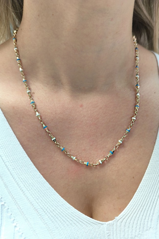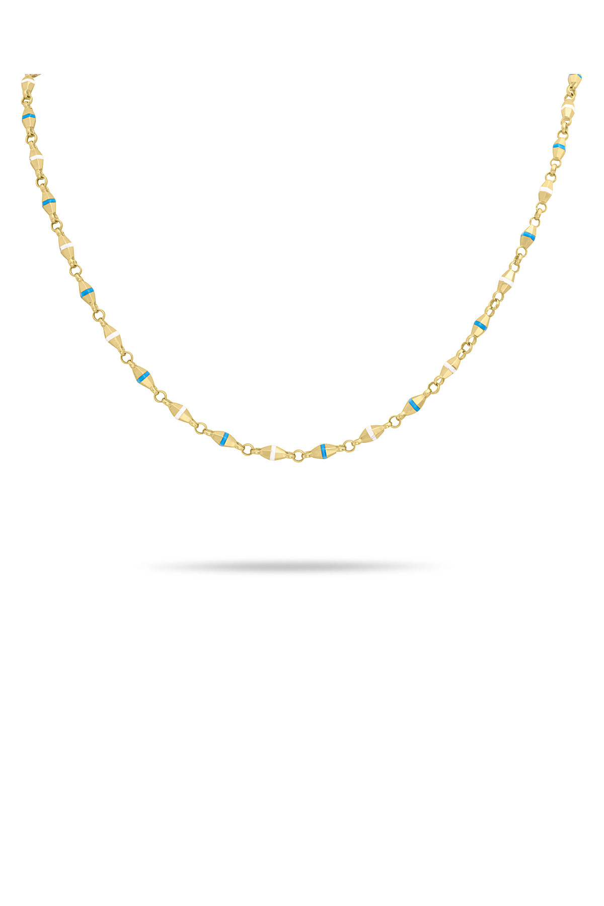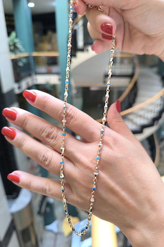 14 Ayar 50+2 cm unisex model şık ve modern tasarım günlük kullanıma uygun, mavi ve beyaz mine detaylı, taşsız ışıl ışıl özel trend tasarım 10.95 gram ağırlığında altın kolye.