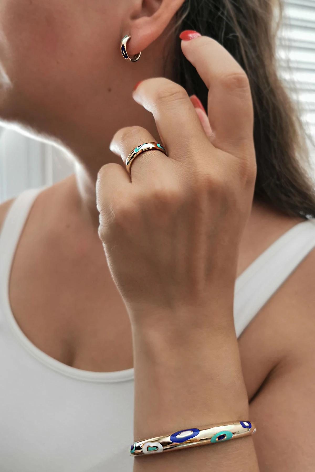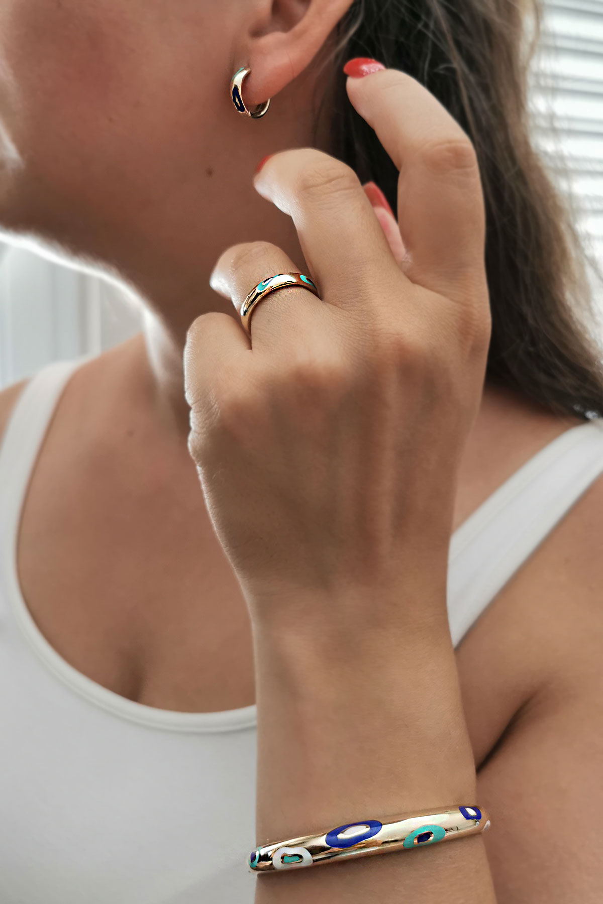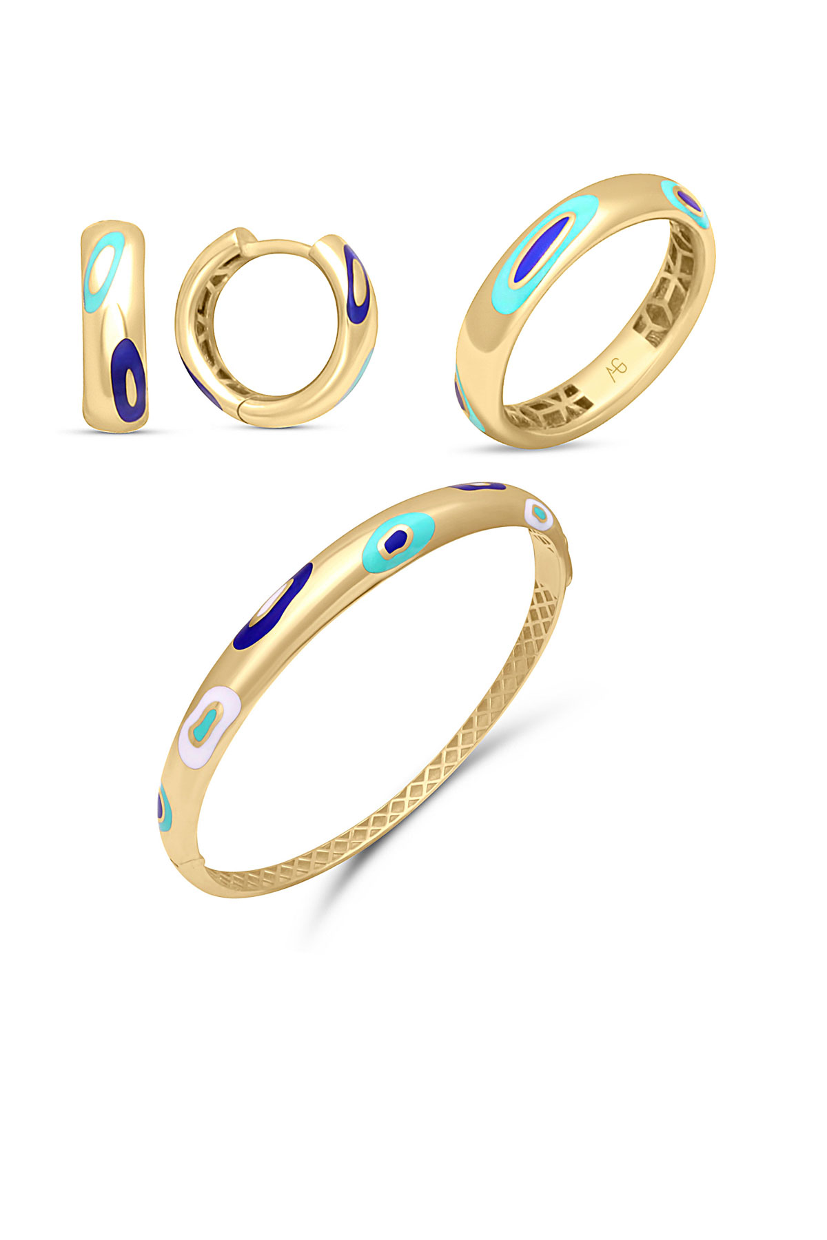14.90 Gram Ağırlığında Mineli Nazar Model 14 Ayar Altın Modern ve Spor Bir Havaya Sahip Kadın Taşsız Küpe Yüzük ve Bilezikten Oluşan Üçlü Takım.