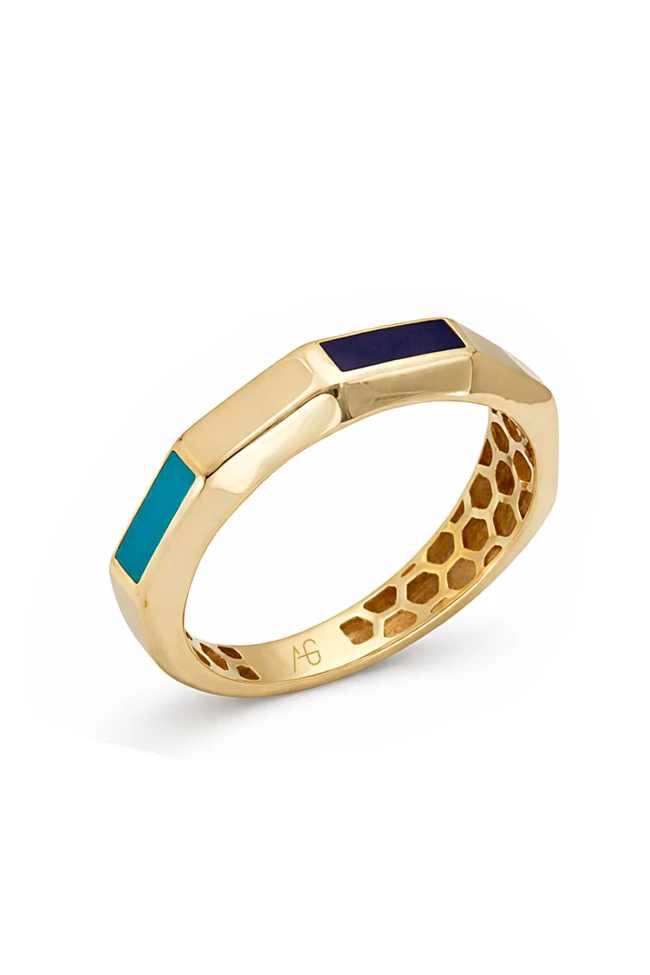 14 Ayar Altın Köşeli Zarif Ve Şık Lacivert Ve Turkuaz Mineli Kadın Yüzük.