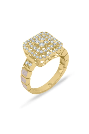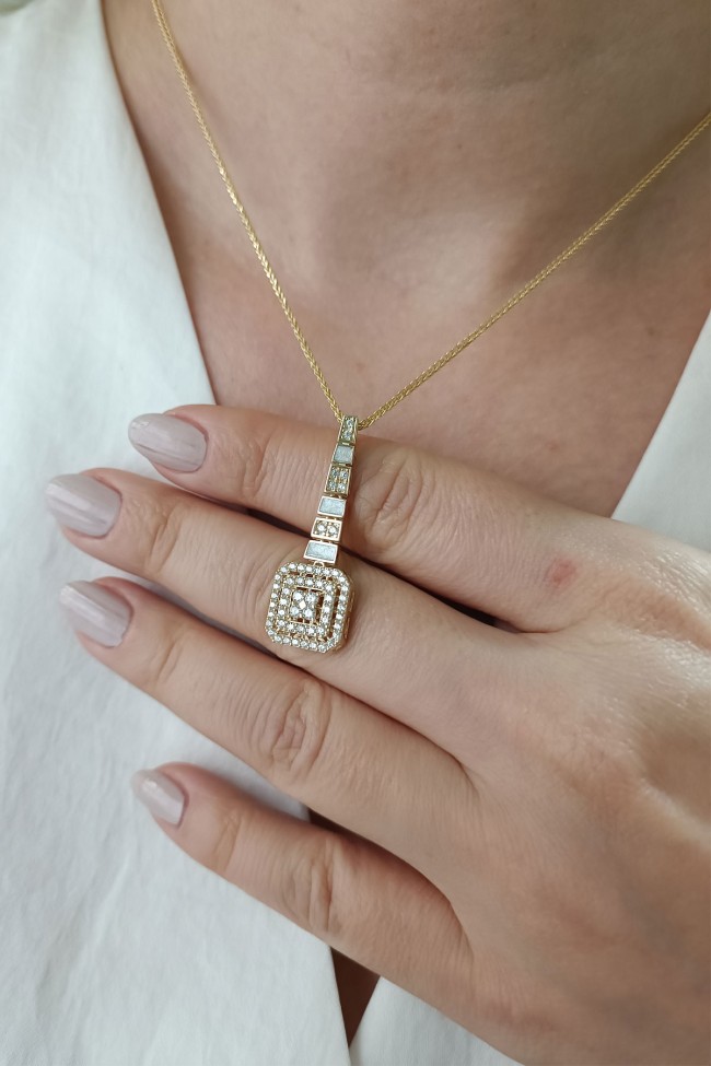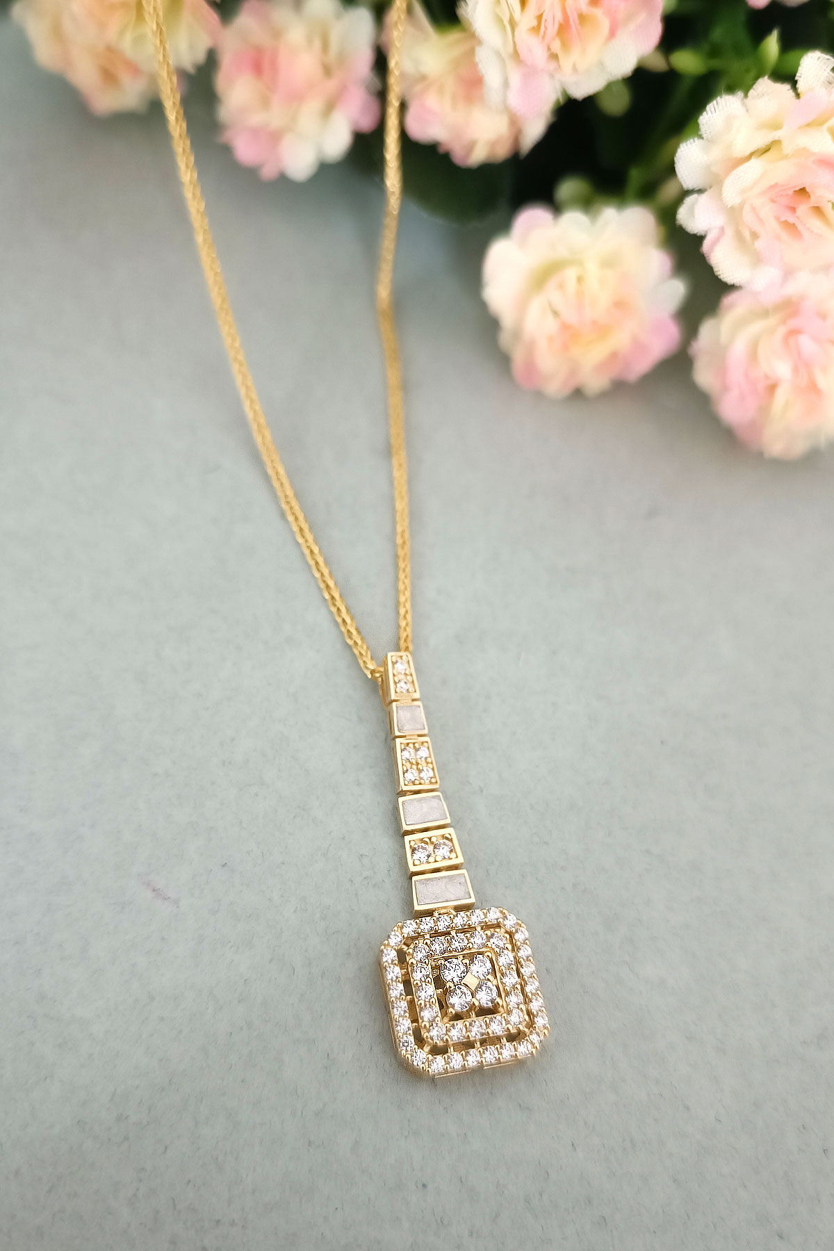 Zirkon taş detaylı model ışıl ışıl 14 ayar 4.50 gr ağırlığında harika bir duruşa sahip modern tasarım altın beyaz mineli kare tasarım kadın kolye.