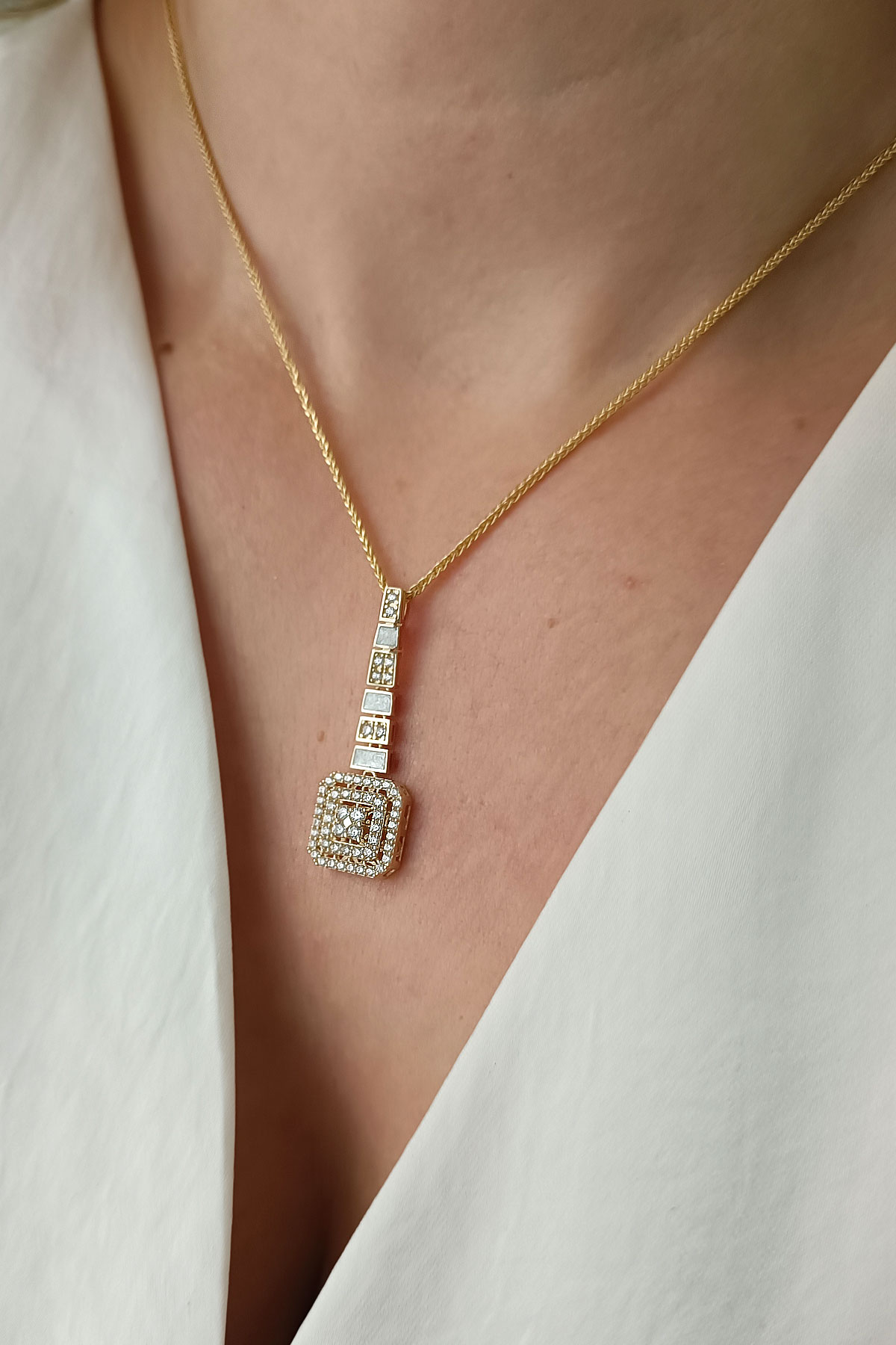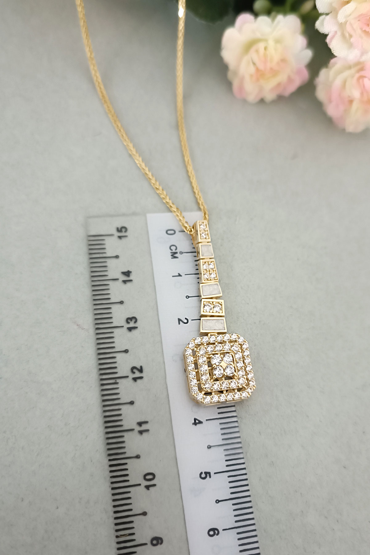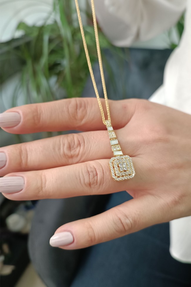 Zirkon taş detaylı model ışıl ışıl 14 ayar 2.70 gr ağırlığında harika bir duruşa sahip modern tasarım altın beyaz mineli kare tasarım kadın kolye ucu.