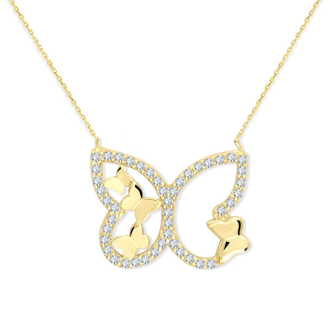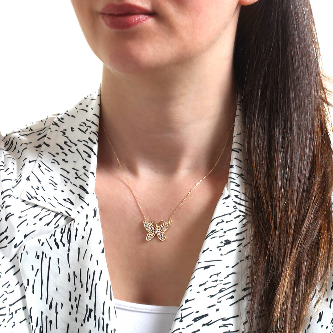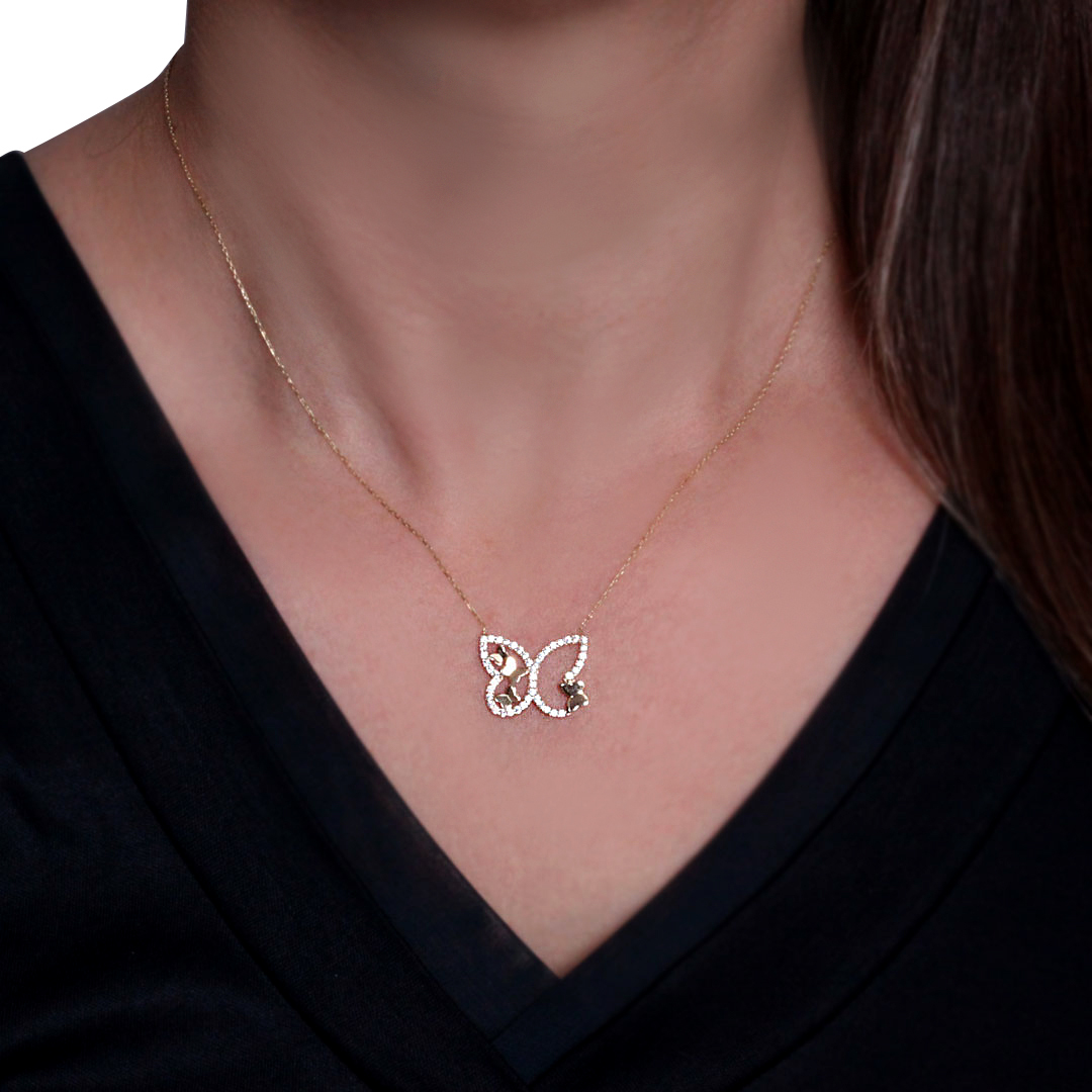 Zirkon taşlarının enerji dolu kombinasyonu ile oldukça şık ve havalı bir duruşa sahip altın kelebek kolyeyle günlük stiline ışıltı katmaya hazır mısın?