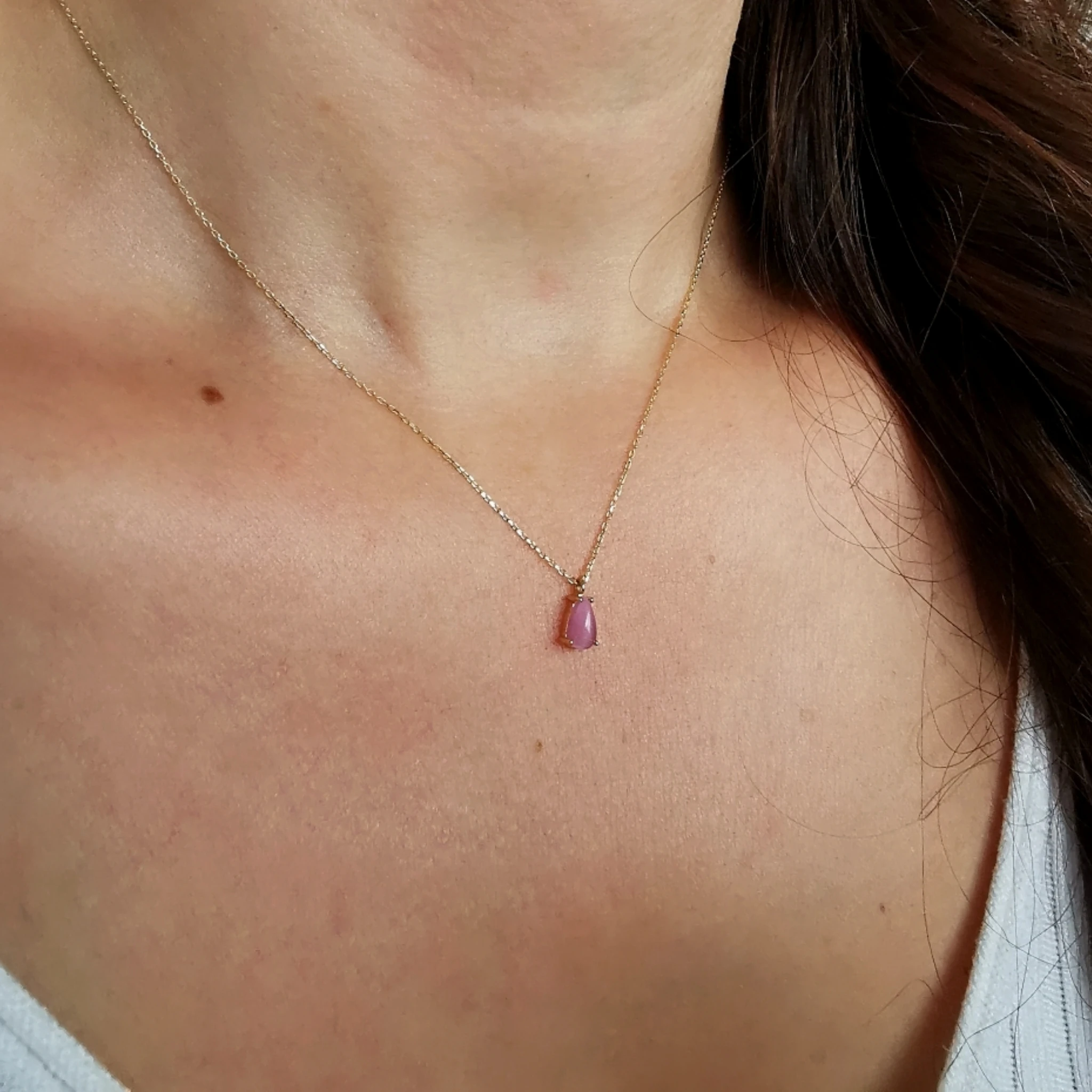 14 Ayar 1.35 gram ağırlığında minimal tasarımıyla gece gündüz boynunuzdan çıkarmak istemeyeceğiniz pembe taşlı altın su damlası kolye.