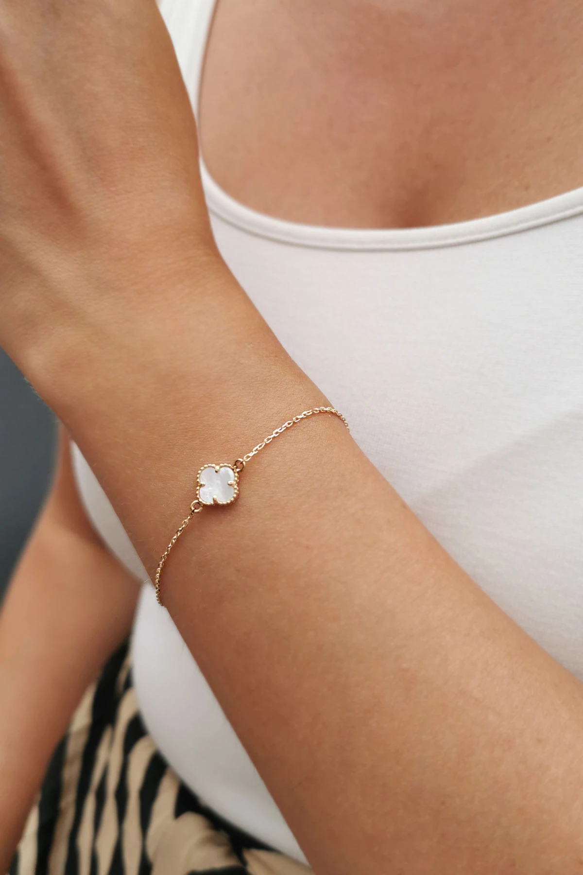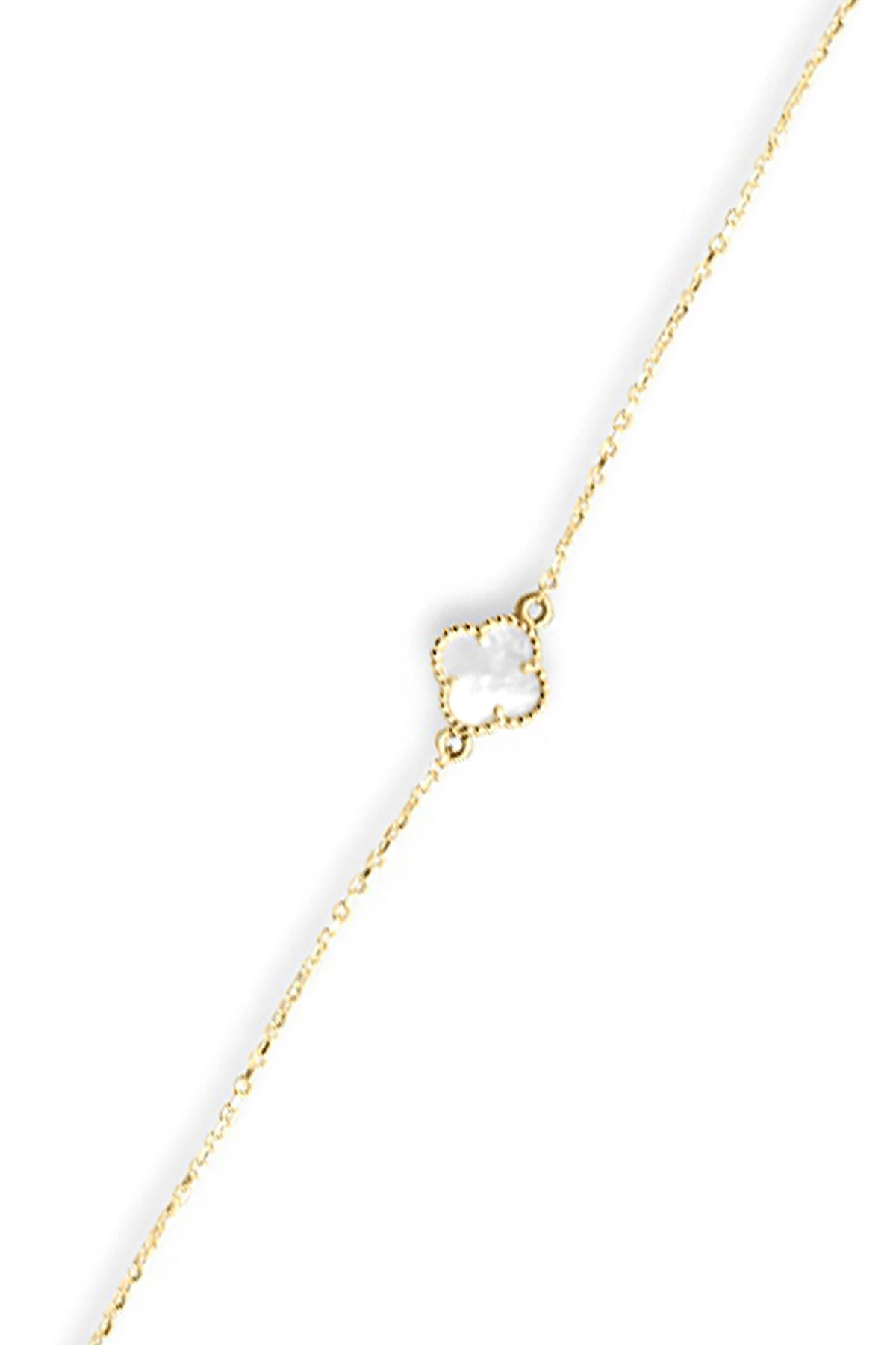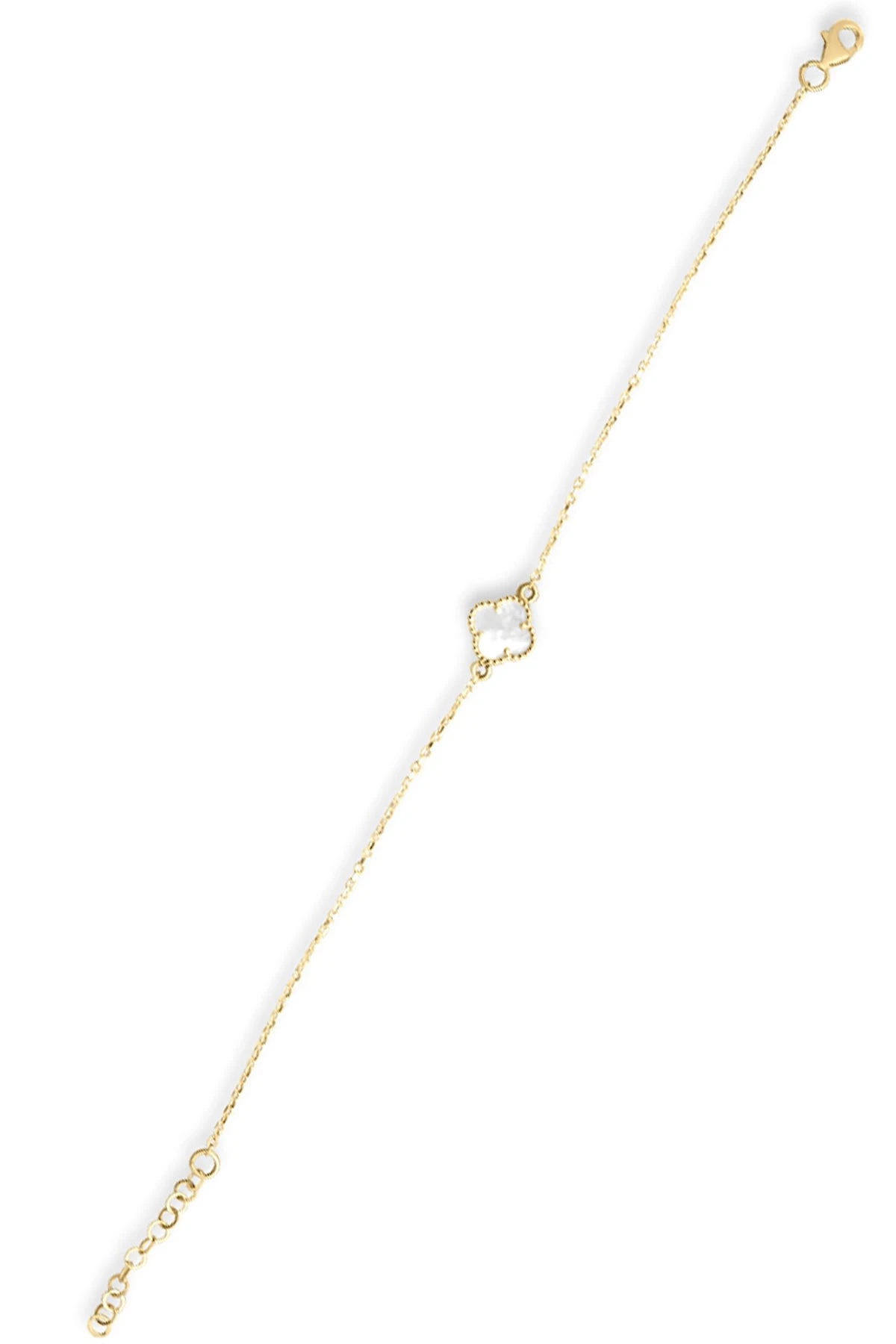 14 Ayar şık ve sade duruşa sahip günlük kullanıma uygun 1.75 gram ağırlığında 19 Cm boyunda altın sedef taş detaylı tekli yonca minimal bileklik.