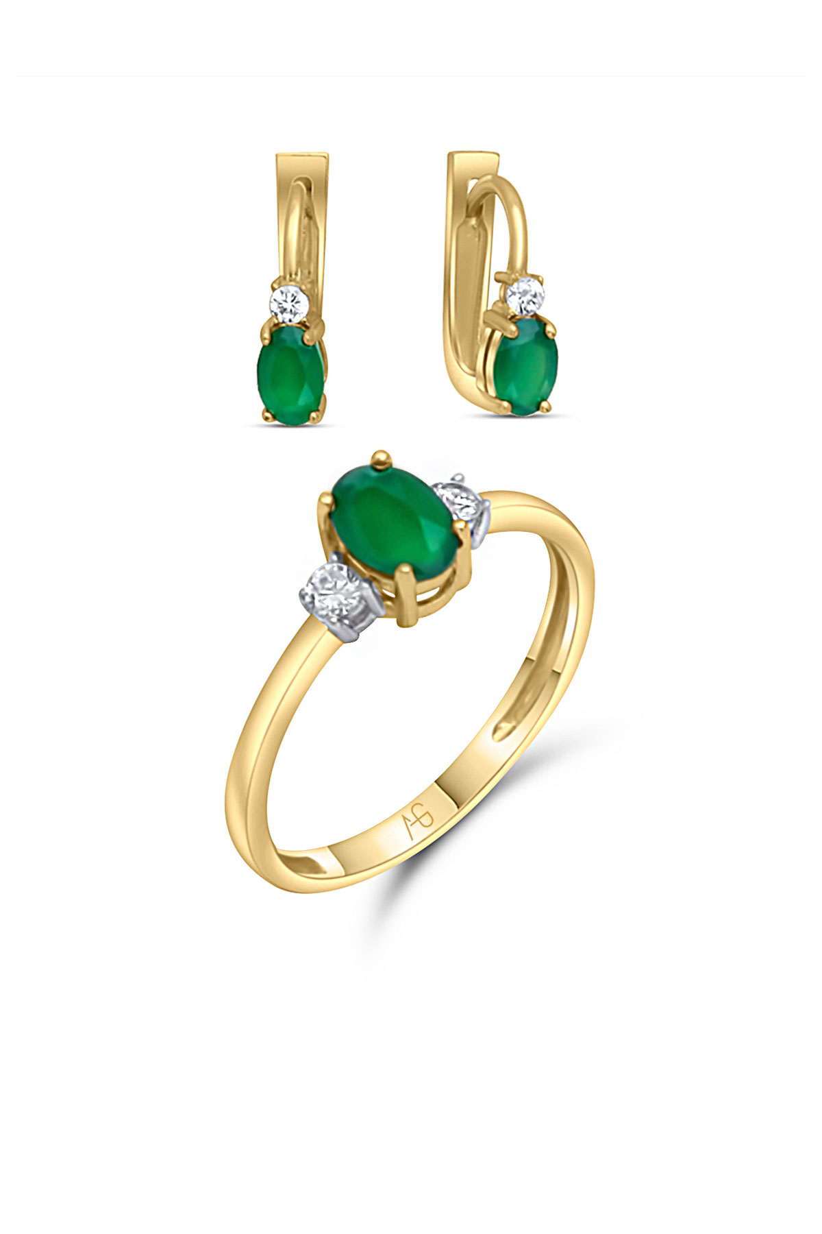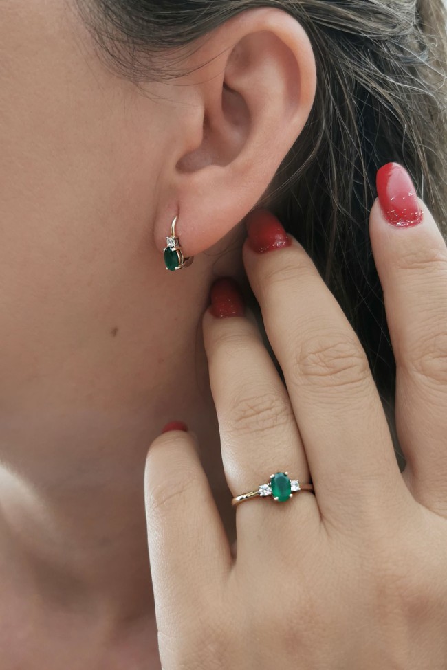 3.70 Gram Modern ve Minimal Zarif Tasarım 14 Ayar Altın Oval Zirkon Zümrüt Taşlı Kadın Günlük Küpe Yüzük Takım.
