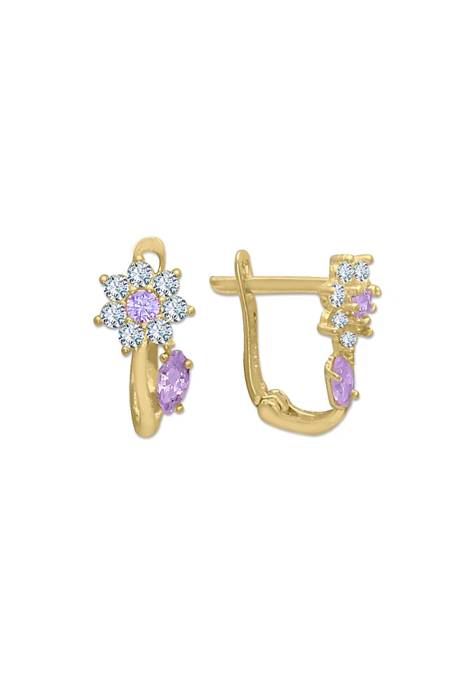 Minik prenseslere özel 1.2 Cm boyunda zirkon pembe beyaz taşlı model günlük olarak kullanıma uygun 14 ayar altın klipsli çiçek model çocuk küpesi.
