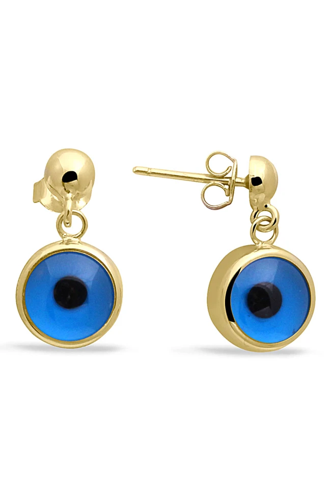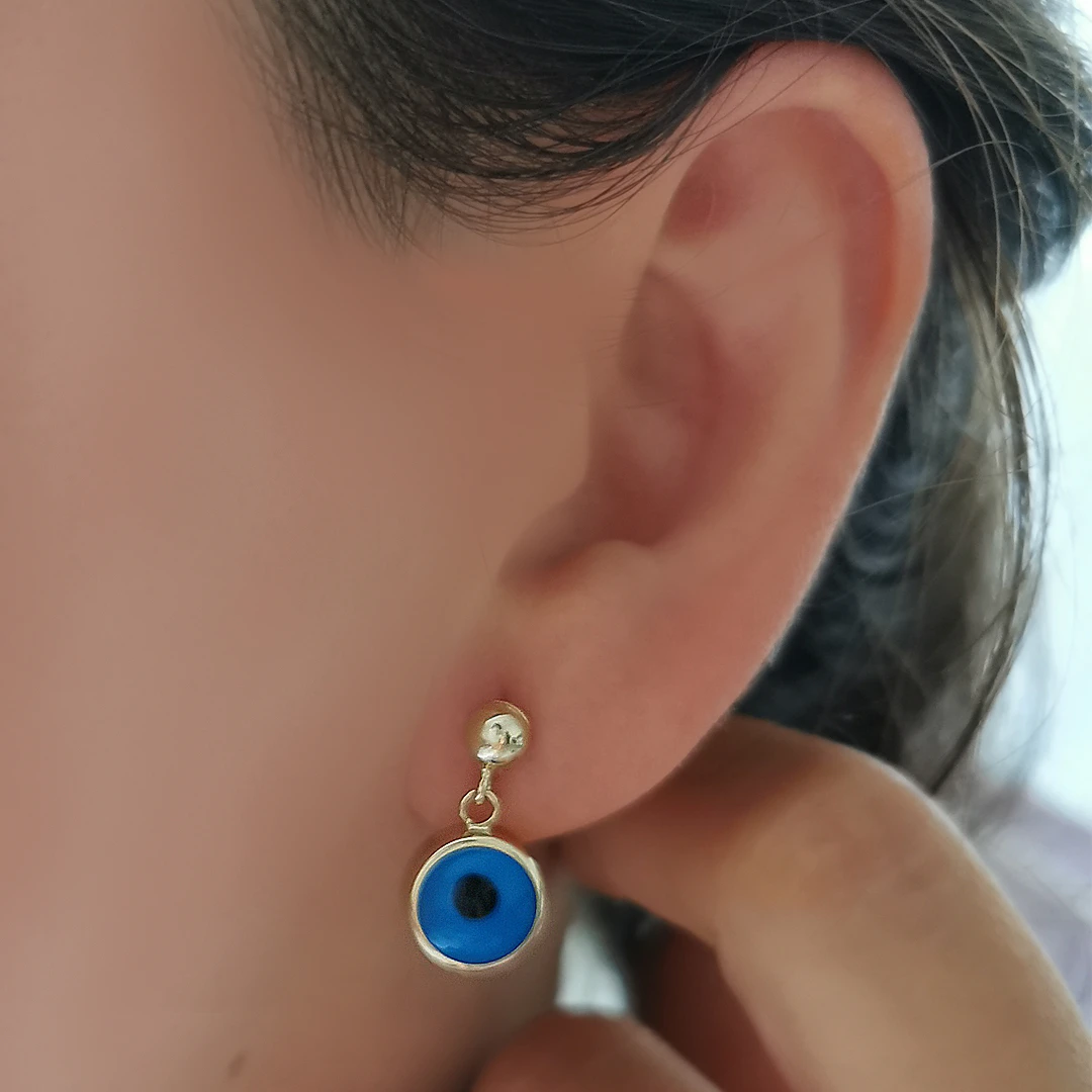 3.30 gr. 14 ayar 2 cm boyutunda nazar boncuklu model minimal 14 ayar altın küpe.