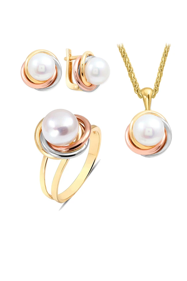 10.5 Gram Ağırlığında 14 Ayar Üç Renkli Olimpiyat Altın İnci Kolye, Küpe Ve Yüzükten Oluşan Üçlü Takım.