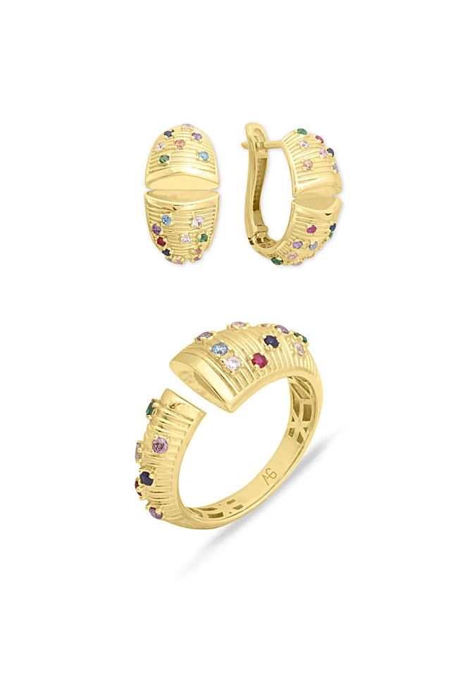 14 Ayar şık otantik modeliyle oldukça zarif ve aynı zamanda havalı duruşa sahip 8.50 gram ağırlığında modern tasarım  altın renkli taşlı kadın yüzük küpe takım.