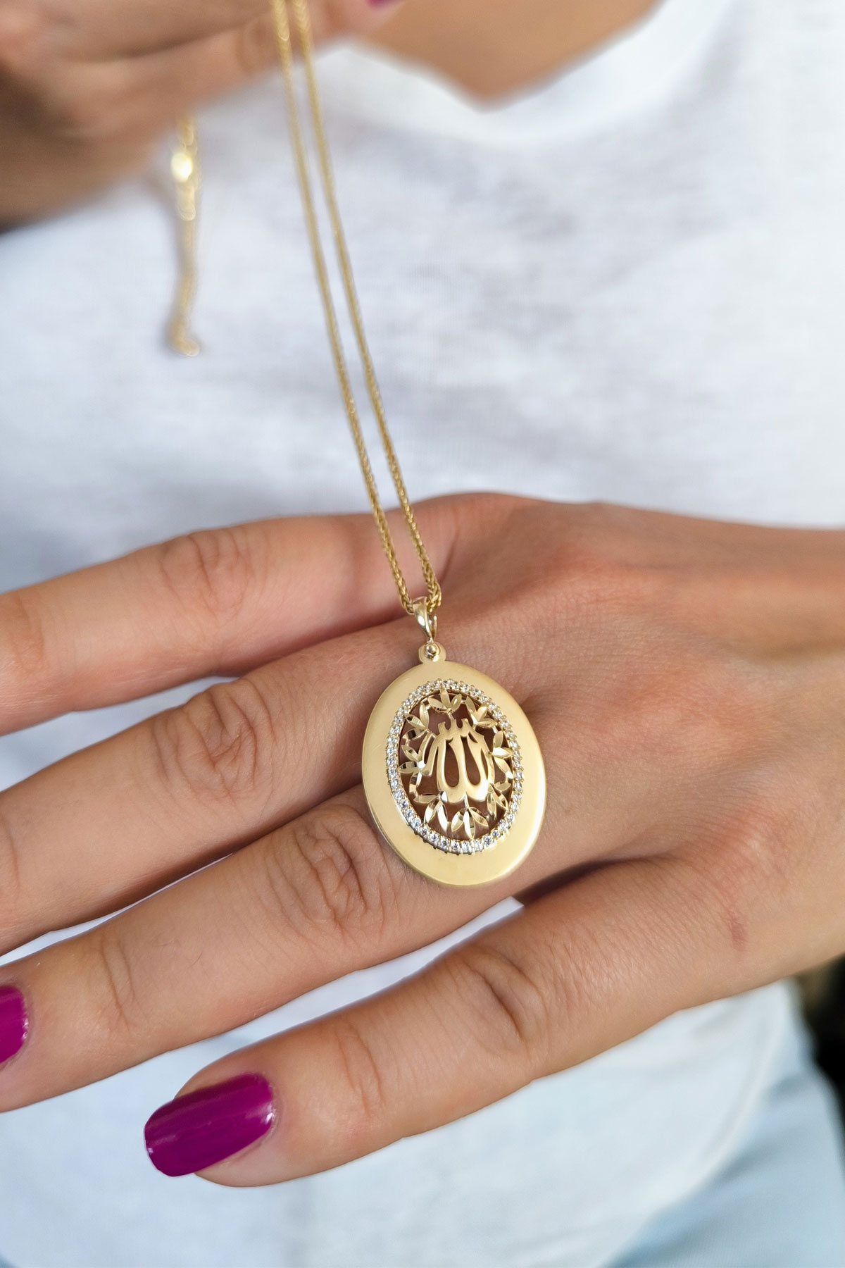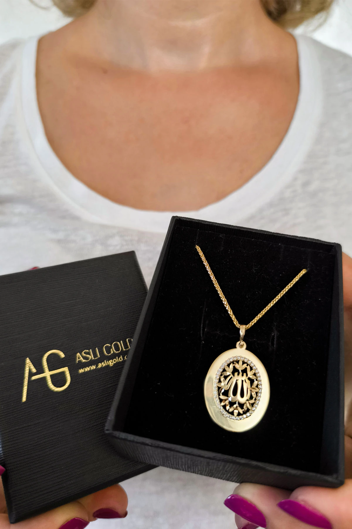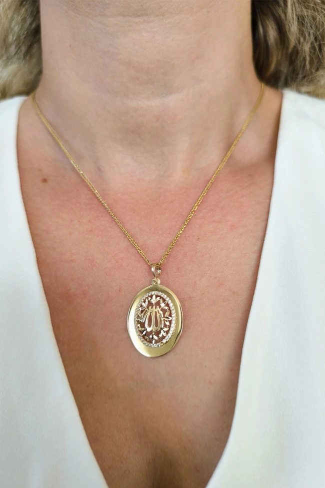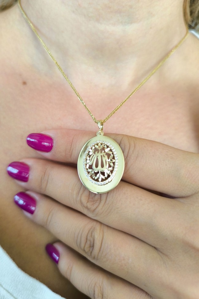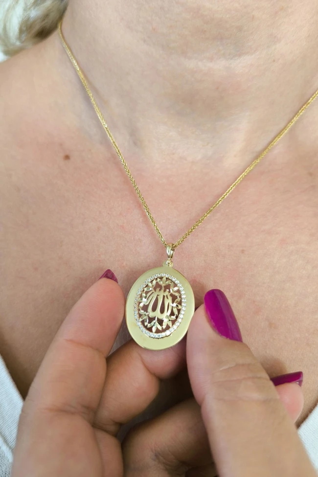 Dua tasarımı ile günlük olarak da kullanabileceğiniz, özel günlerinde sevdiklerinize şık bir hediye seçeneği olacak 3.5 cm boyutunda 4.5 gr. ağırlığında 14 ayar altın oval dualı kolye