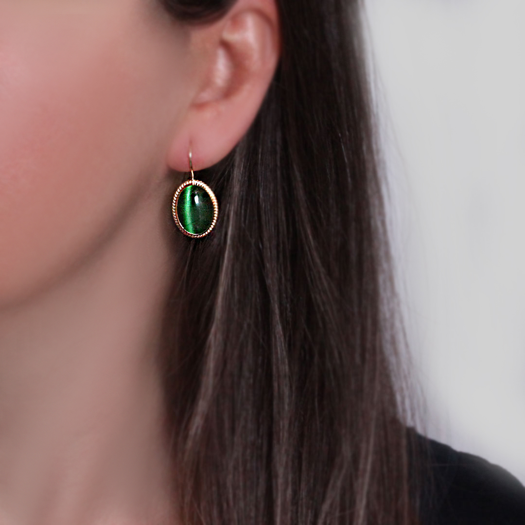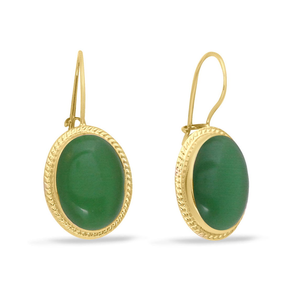 14 Ayar nostalji tasarımına eşlik eden büyük oval boy yeşil taş detaylı şık ve ışıltılı tasarımlara düşkün kadınların severek kullanacakları elegan duruşa sahip günlük kullanıma uygun 4.65 gram ağırlığında altın küpe.