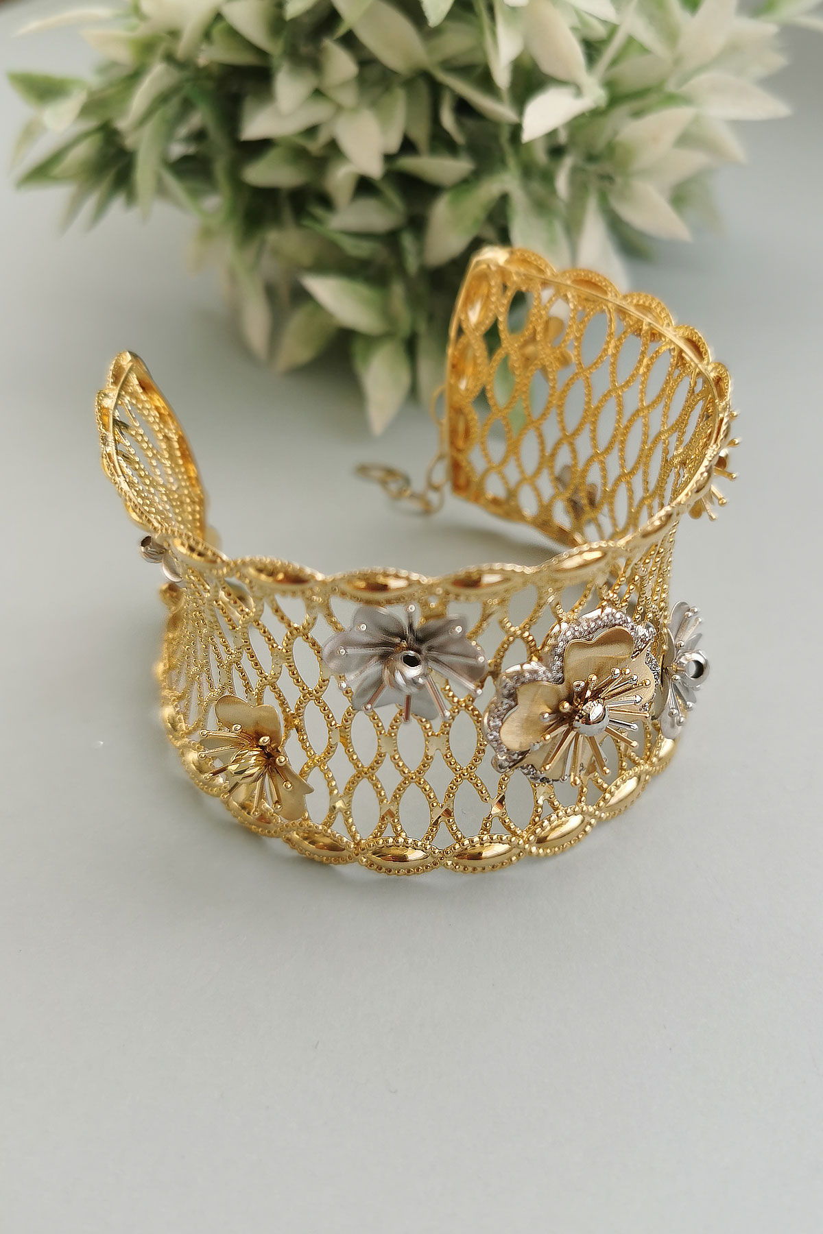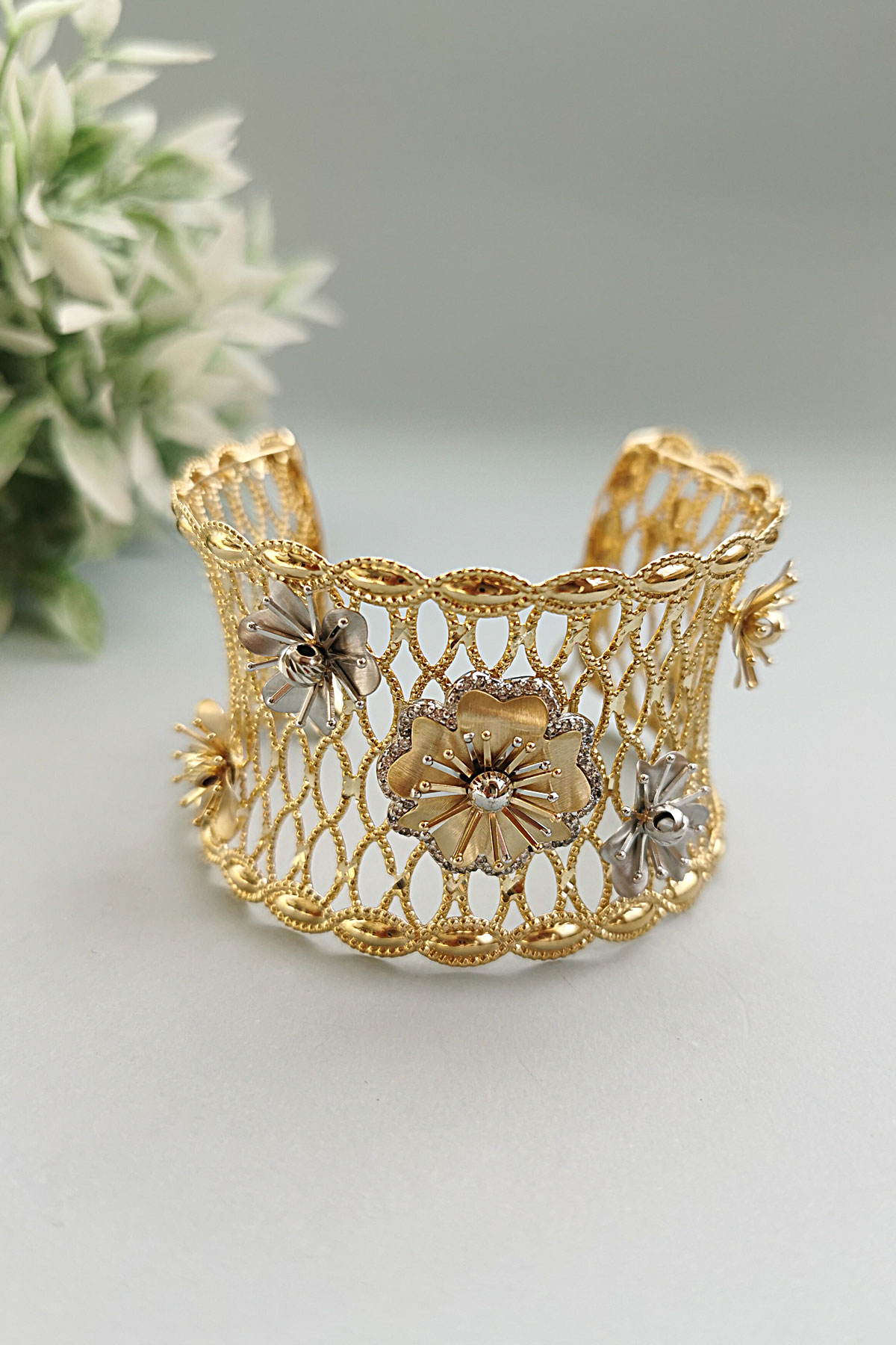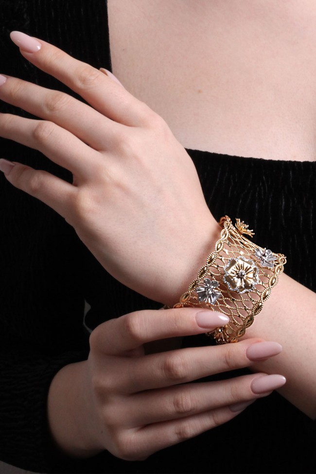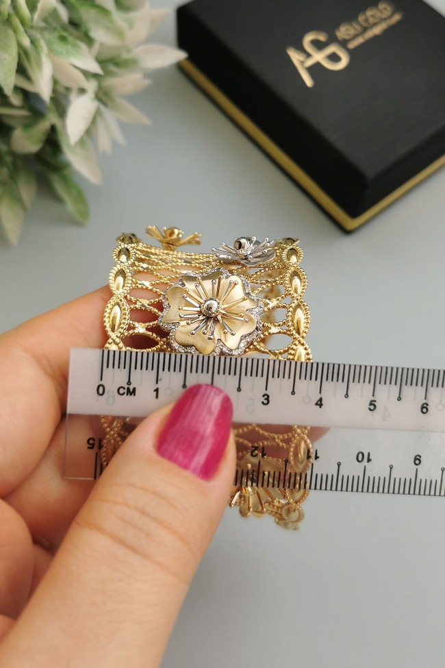 25.00 Gram Ağırlığında Çok Özel Tasarımı Olan Şahane Modele Sahip 14 Ayar Altın Kadın Çiçek Bilezik.