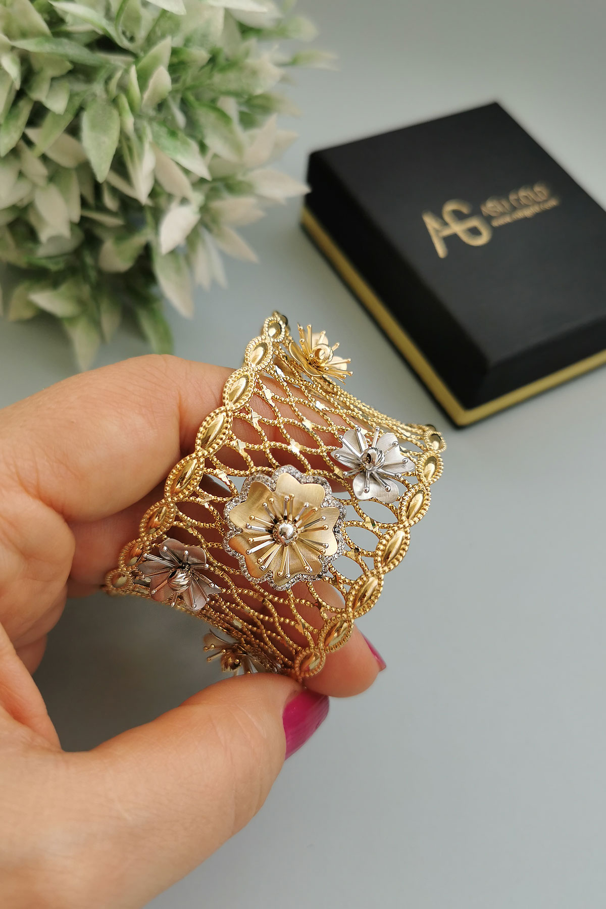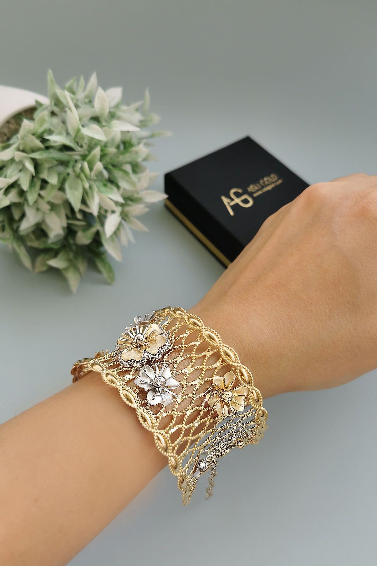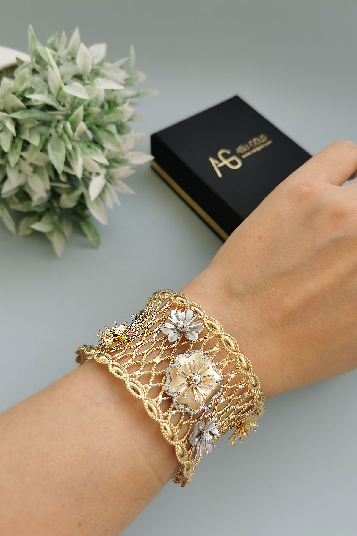 25.00 Gram Ağırlığında Çok Özel Tasarımı Olan Şahane Modele Sahip 14 Ayar Altın Kadın Çiçek Bilezik.