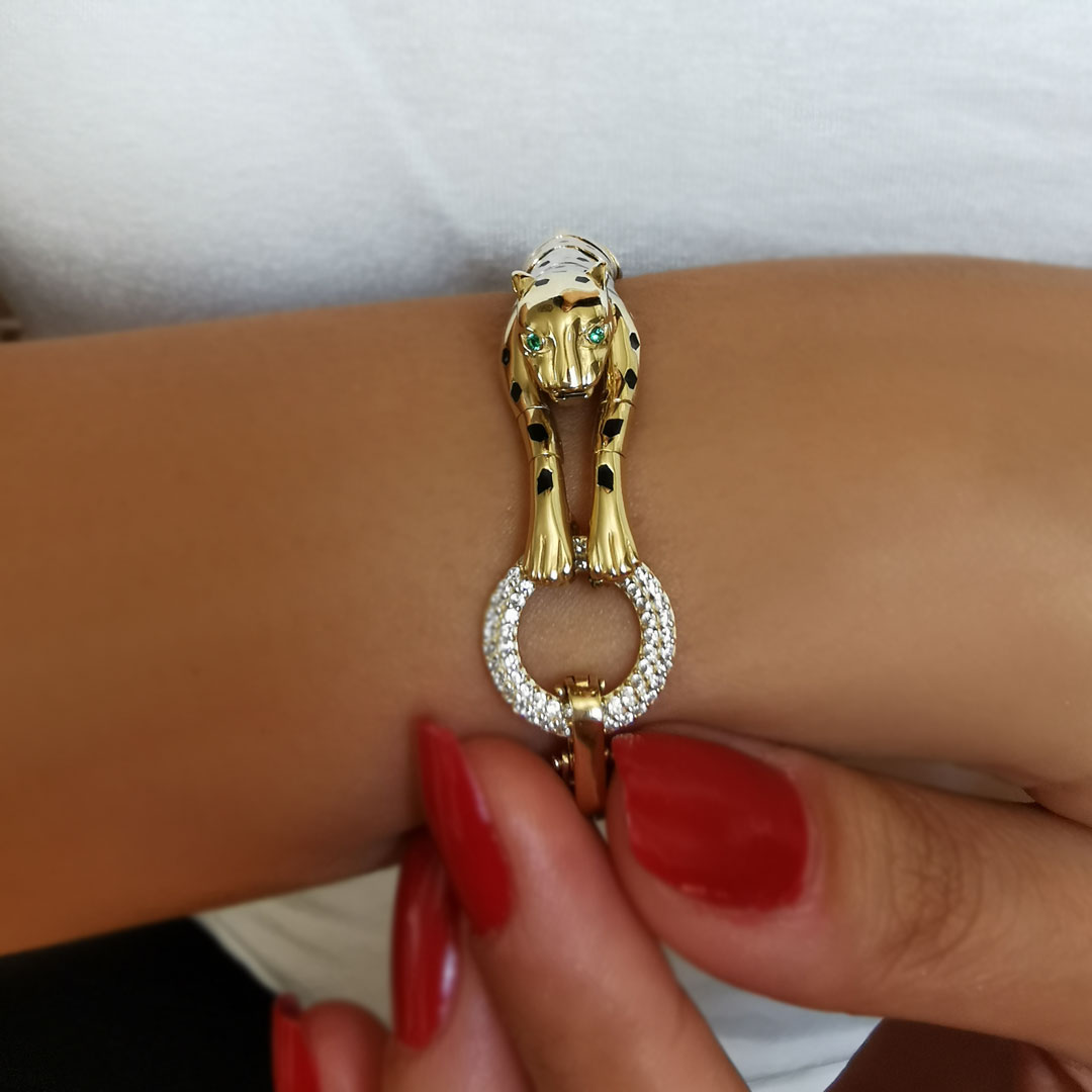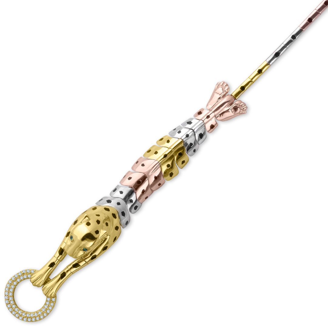 18 Cm boyunda 3 renkli altın geçişine sahip taş detaylı tasarımı ile günlük olarak da kullanabileceğiniz farklı bir havaya ve modele sahip 15.30 gr ağırlığında 14 ayar altın panter bileklik. *Ürünlerimiz faturalıdır güvenle satın alabilirsiniz, özel hediye kutusunda ücretsiz kargo ile gönderilecektir.