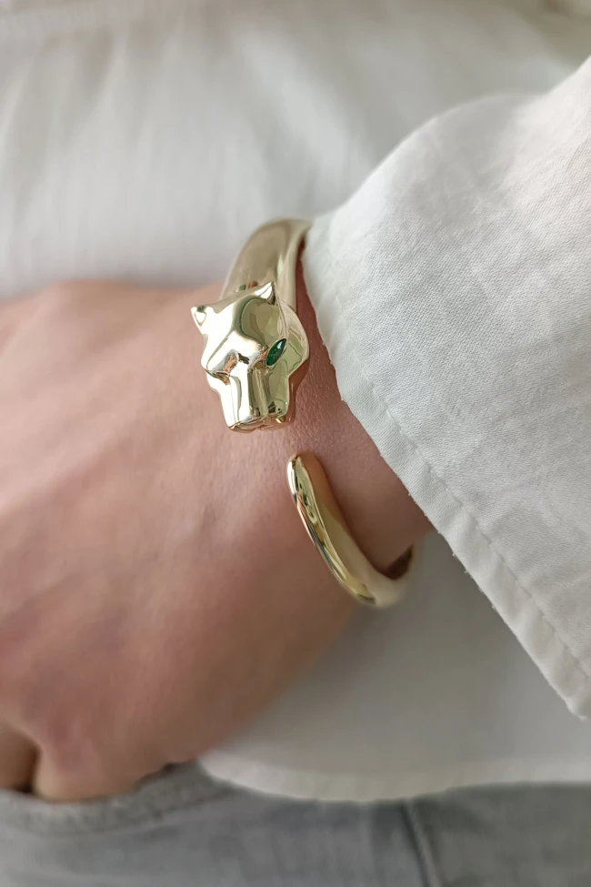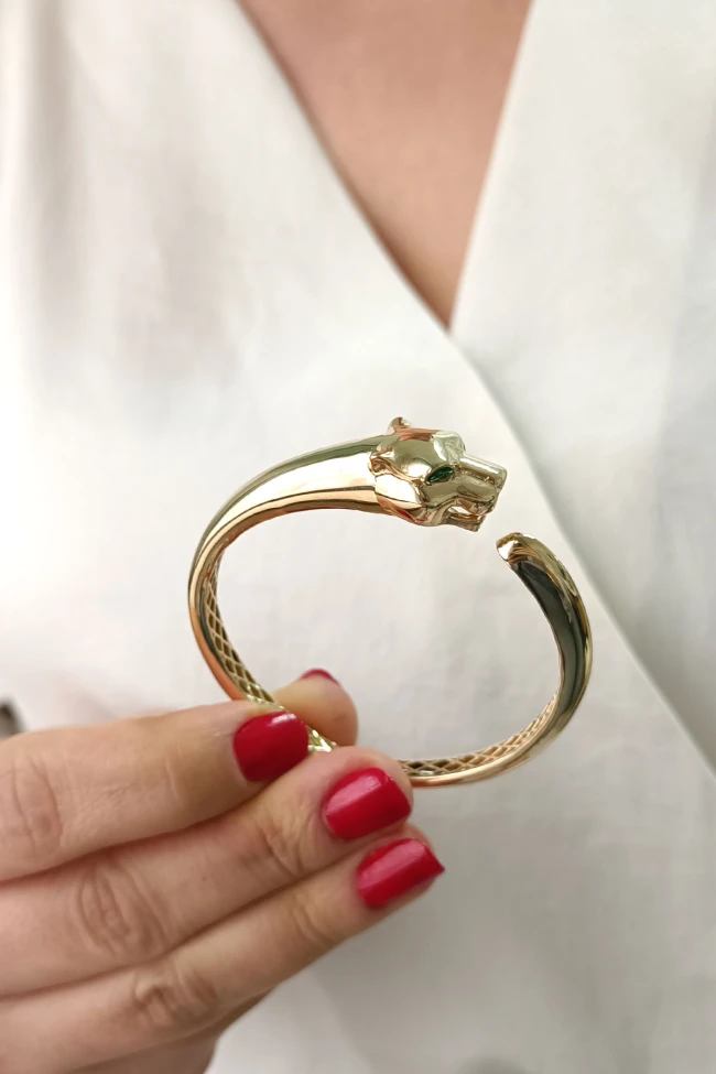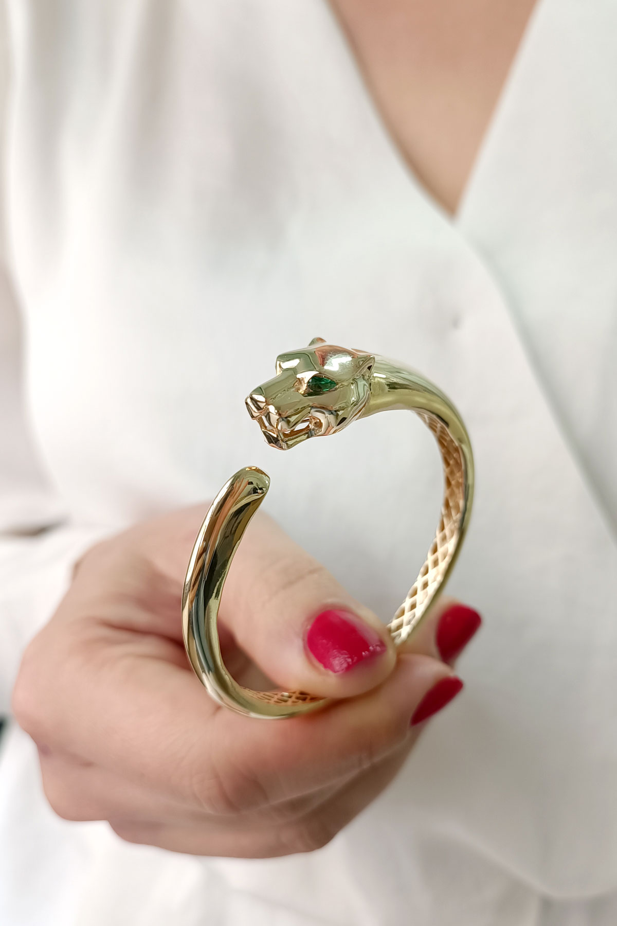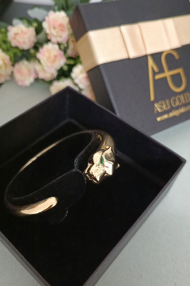 14 Ayar gözü yeşil taş detaylı petek tasarımı ile gösterişli ve şık duruşa sahip günlük kullanıma uygun 11.40 gram ağırlığında Panter cartier altın bilezik.