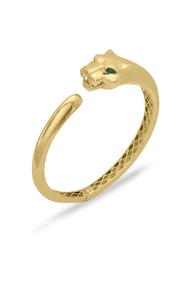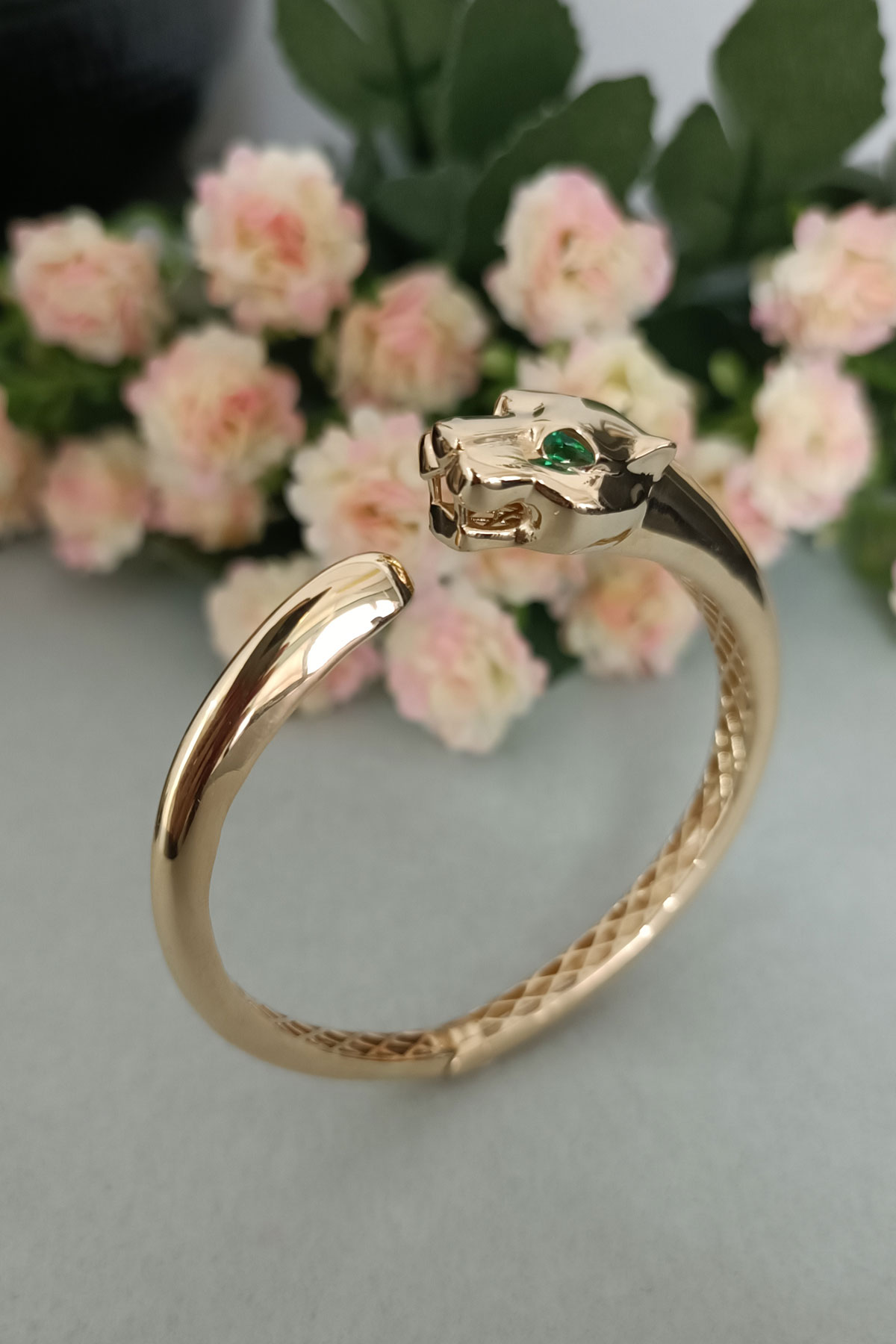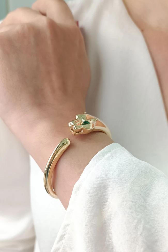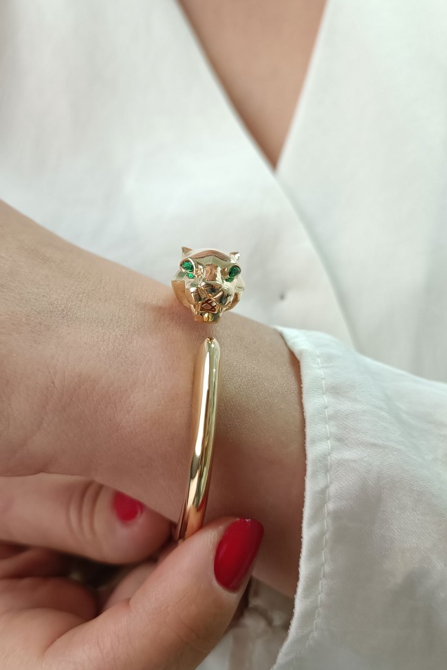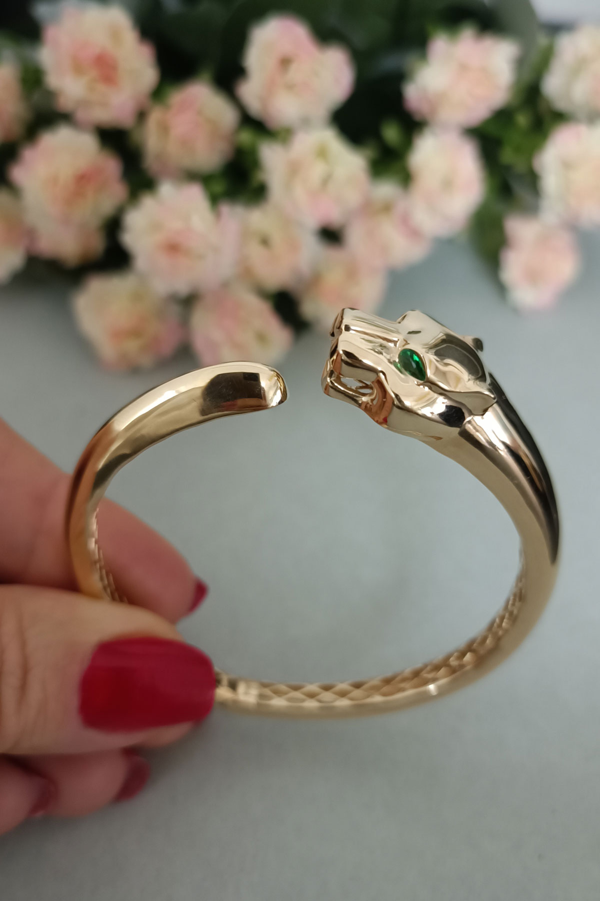 14 Ayar gözü yeşil taş detaylı petek tasarımı ile gösterişli ve şık duruşa sahip günlük kullanıma uygun 11.40 gram ağırlığında Panter cartier altın bilezik.
