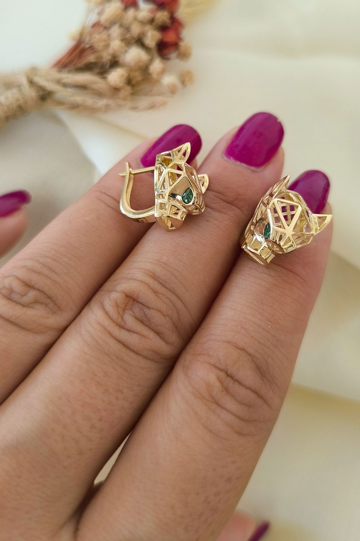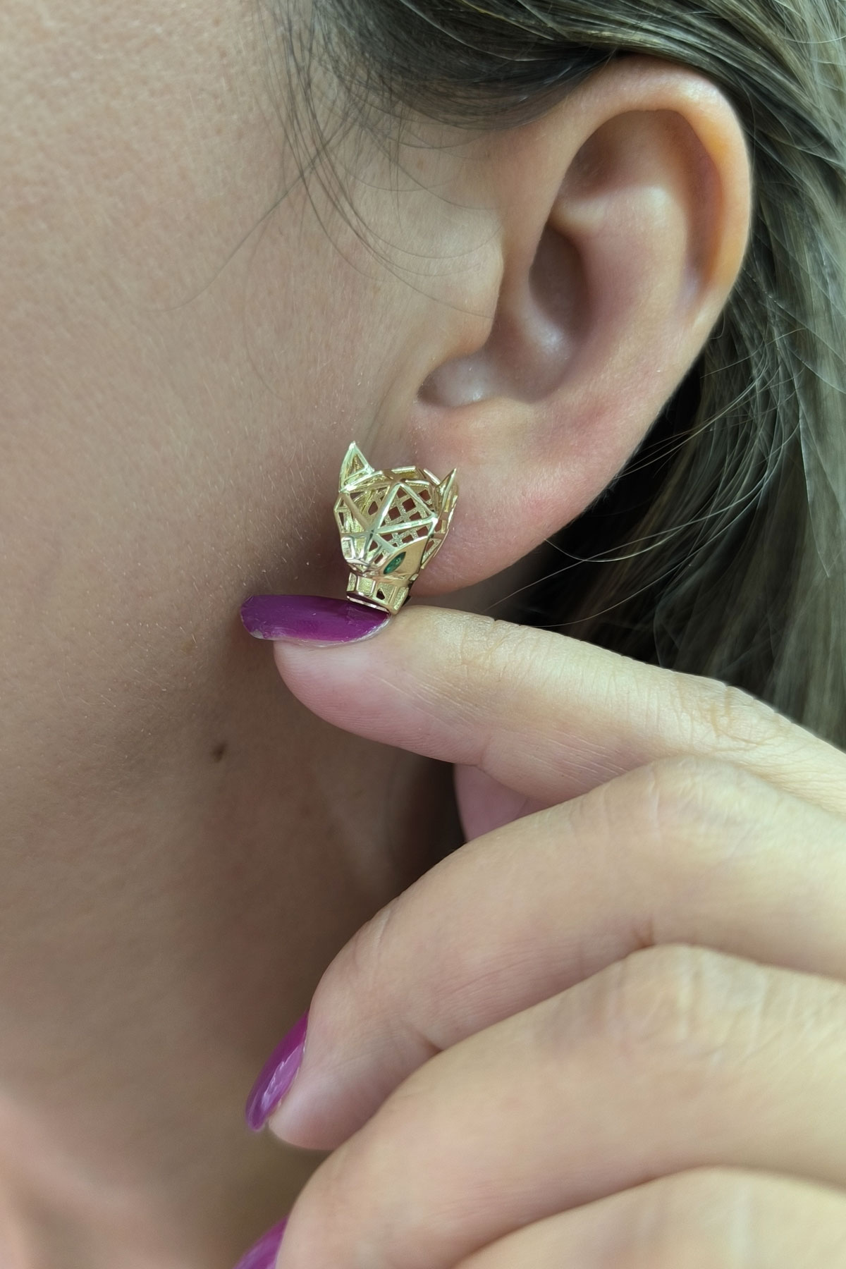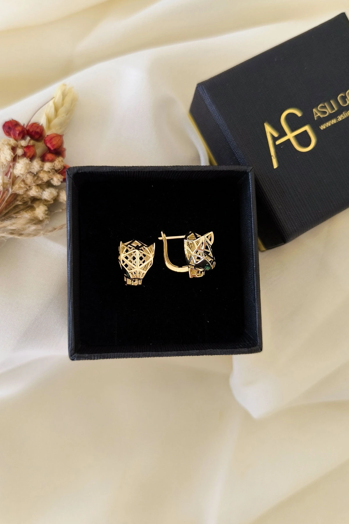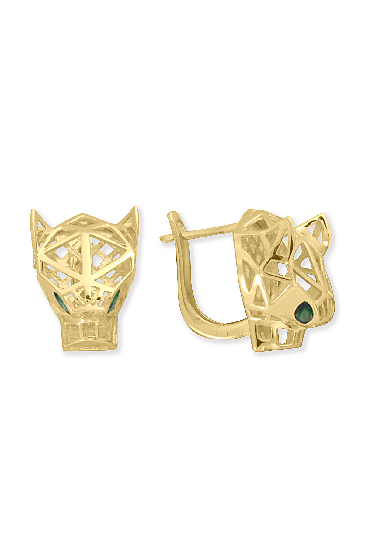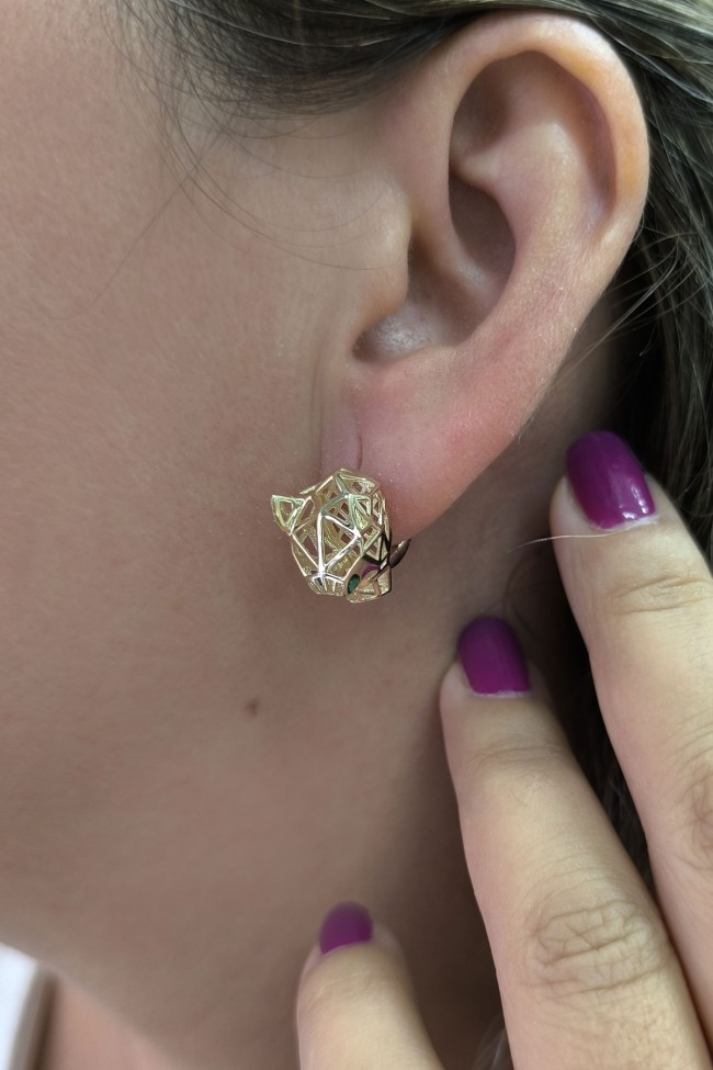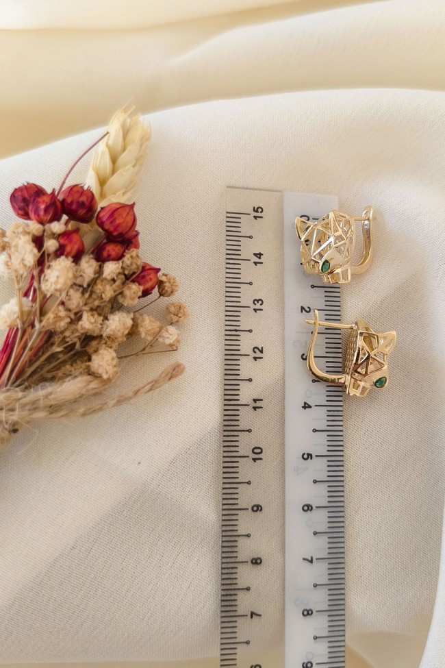 4.50 gram 14 ayar panter model yeşil göz detaylarıyla oldukça farklı ve şık tasarım altın küpe.