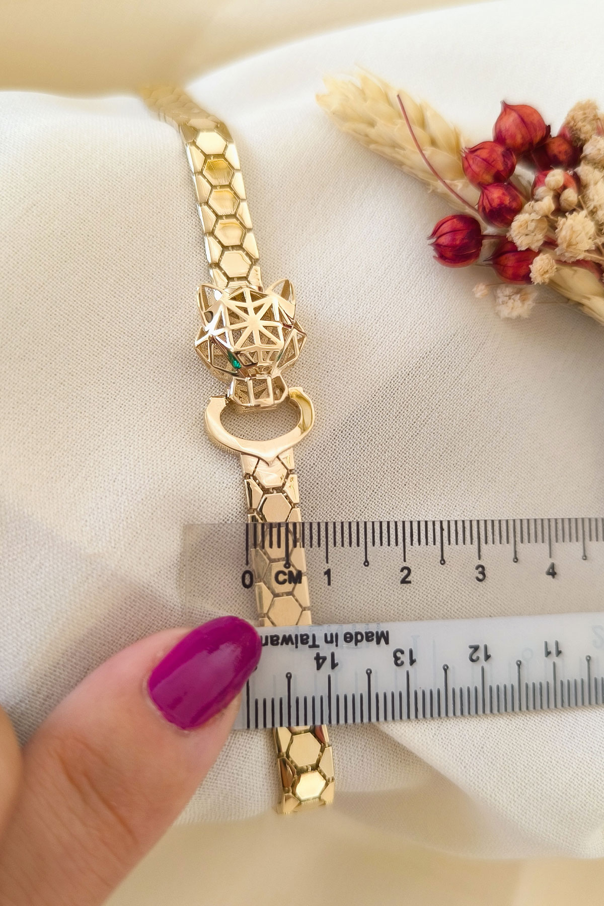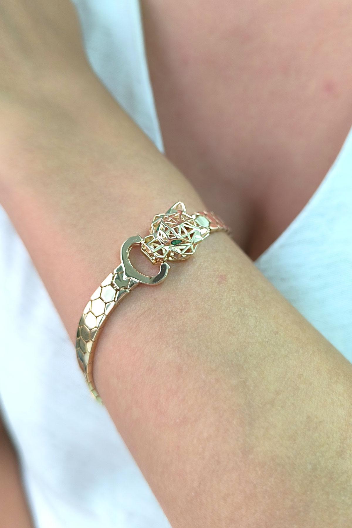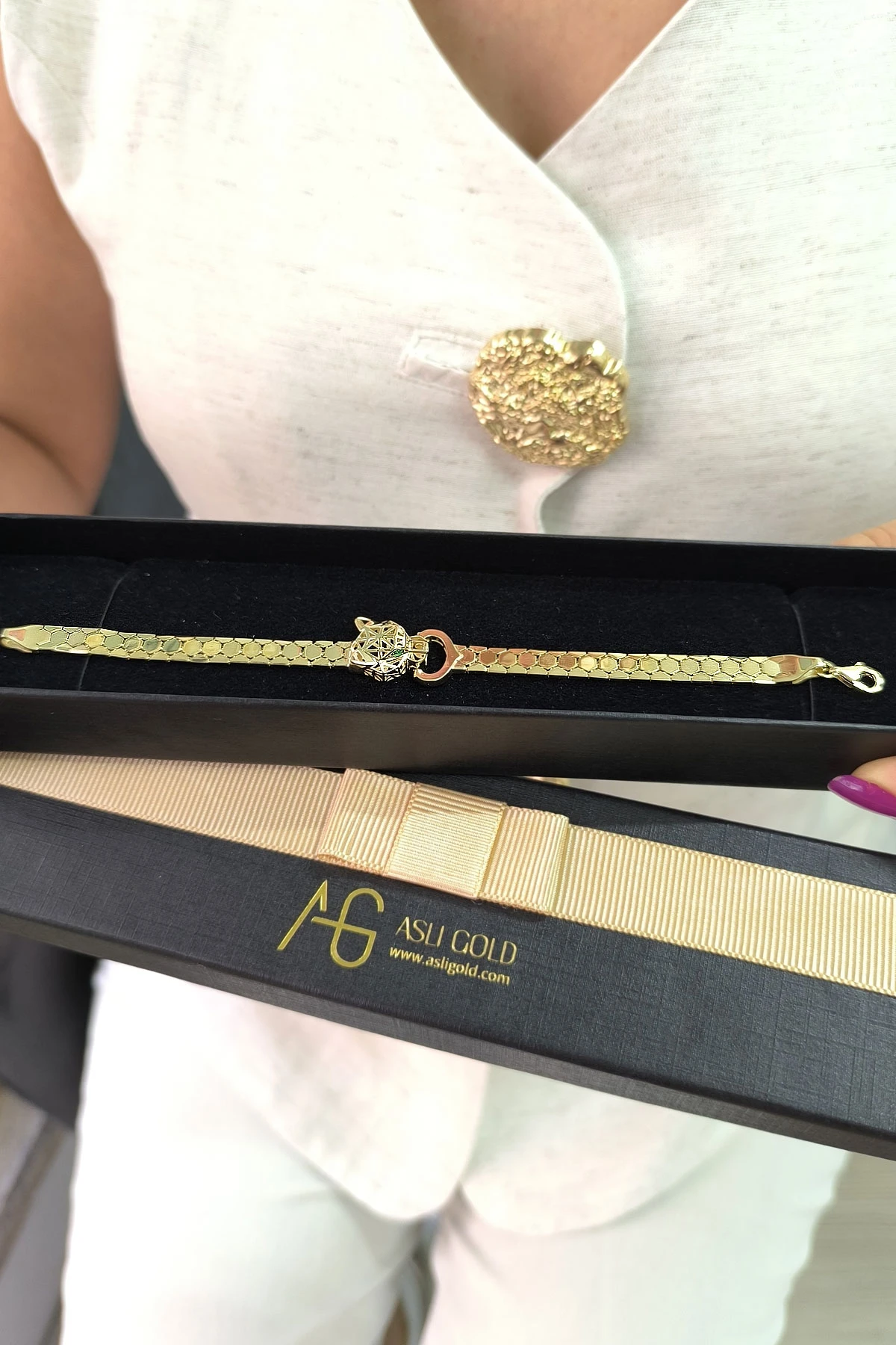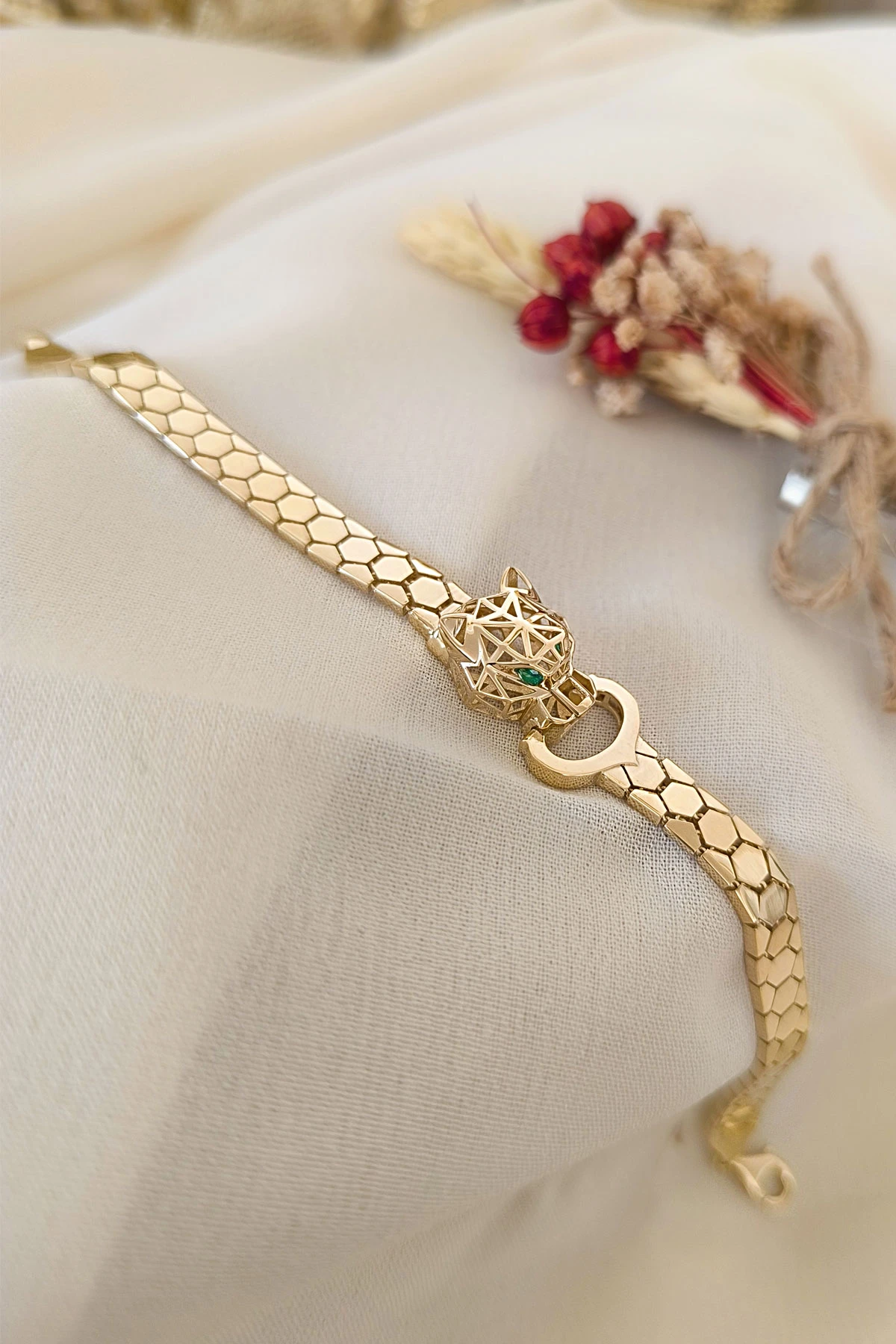 14 Ayar şık ve gösterişli petek tasarım ışıl ışıl 6 mm genişliğinde, 9.50 gram ağırlığında altın füzyon panter bileklik.