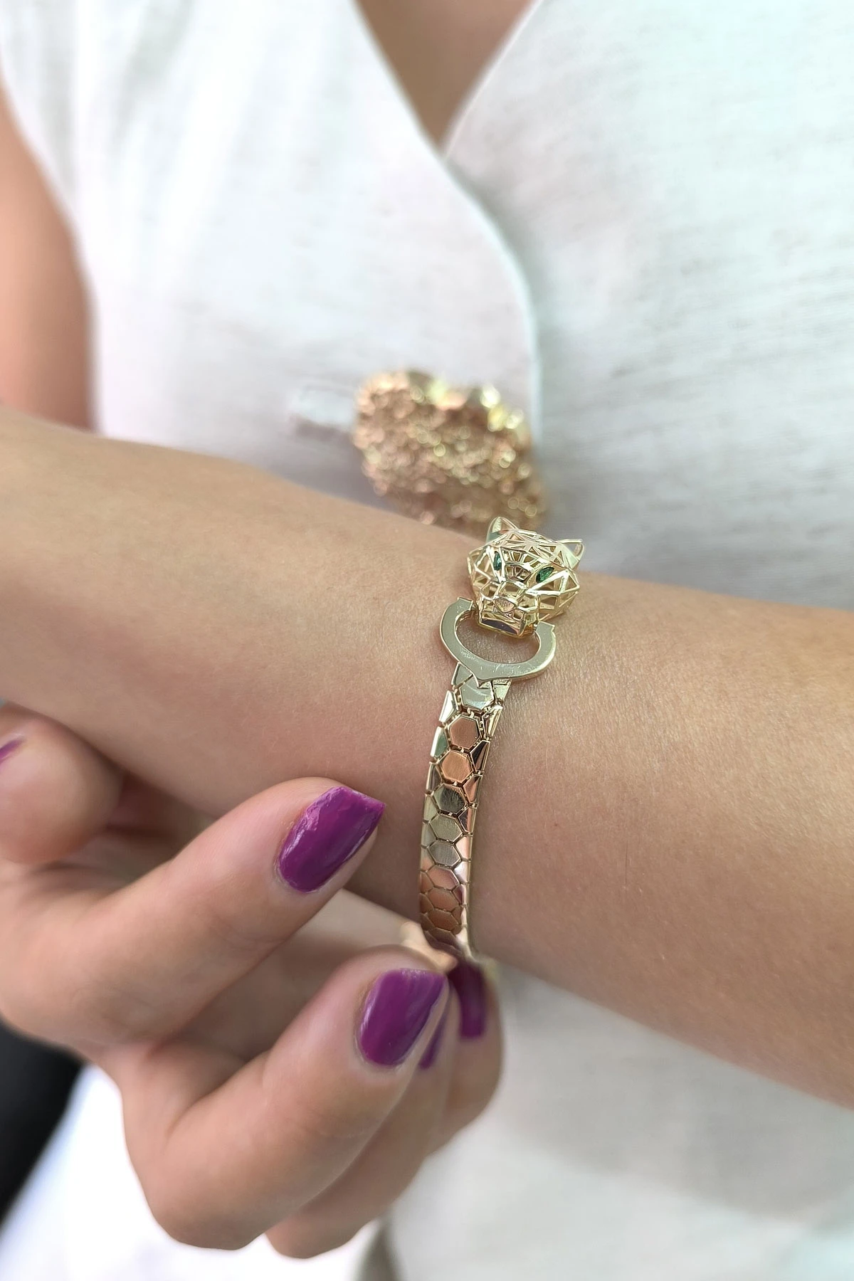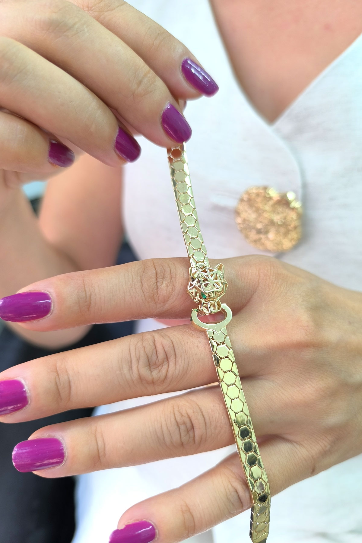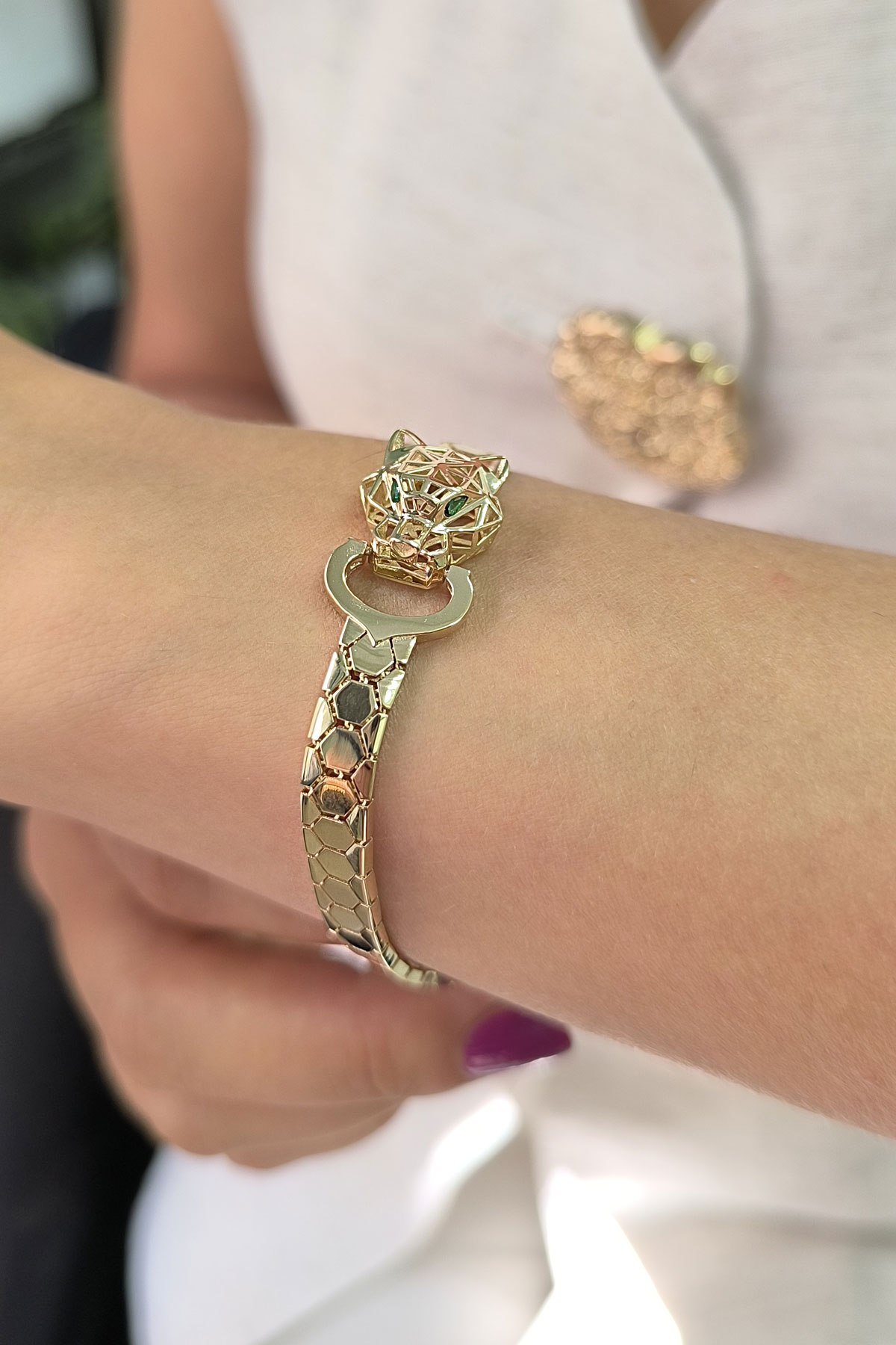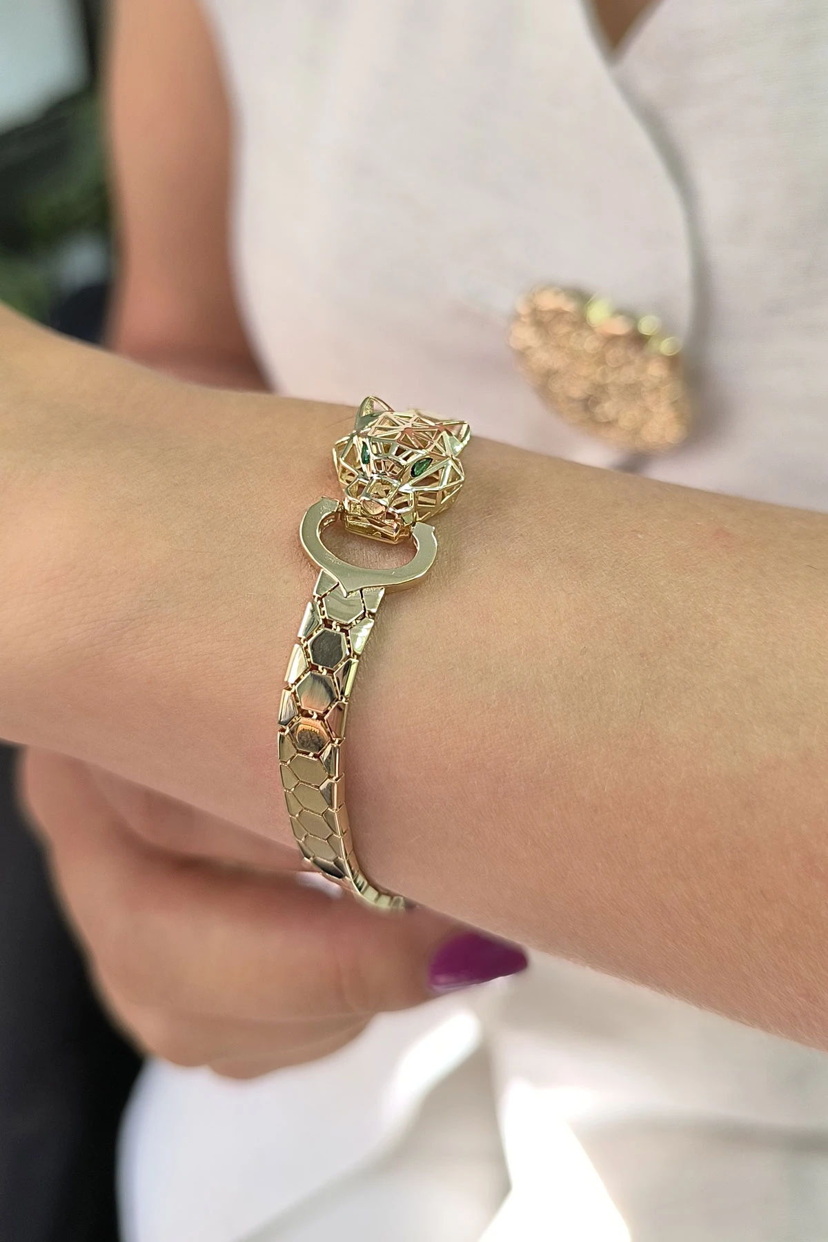 14 Ayar şık ve gösterişli petek tasarım ışıl ışıl 6 mm genişliğinde, 9.50 gram ağırlığında altın füzyon panter bileklik.