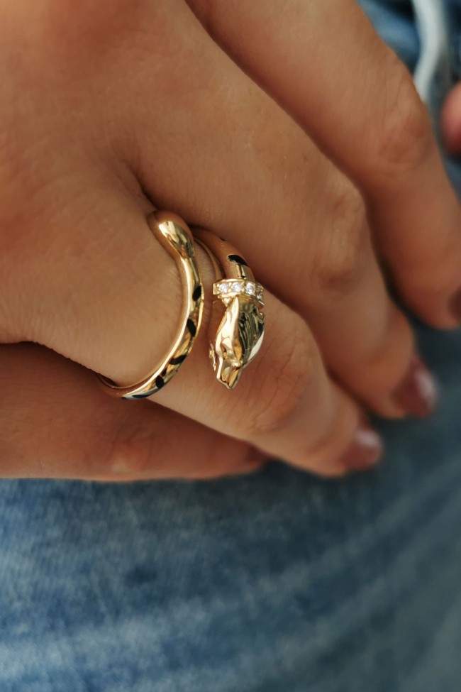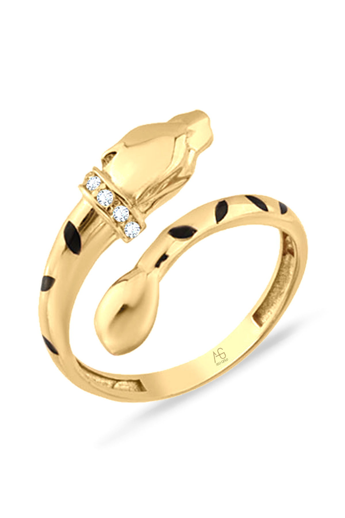 Gücü sembolize eden 14 ayar sarı altın tasarımıyla günlük kullanıma uygun 2.60 gram ağırlığında mineli panter yüzük.
