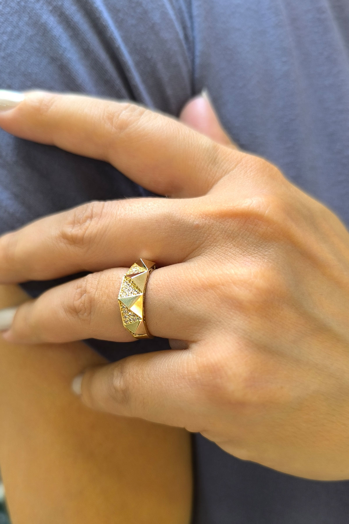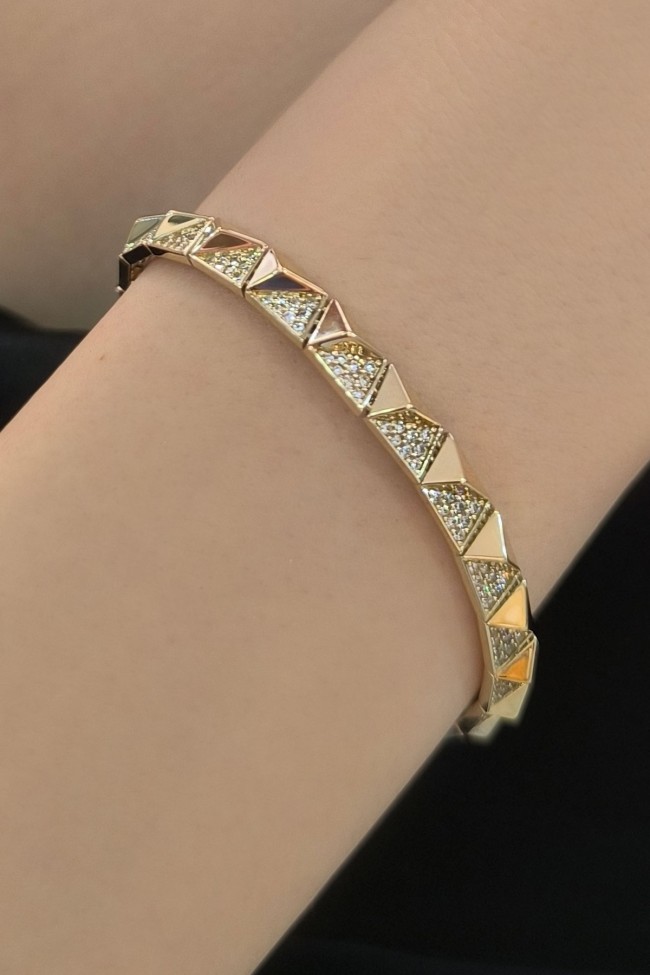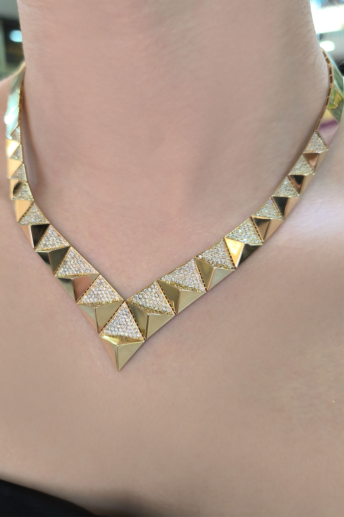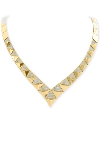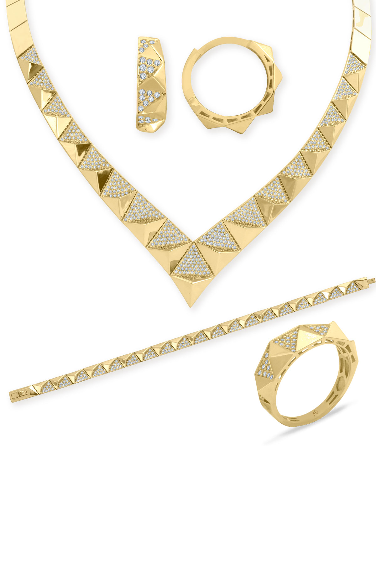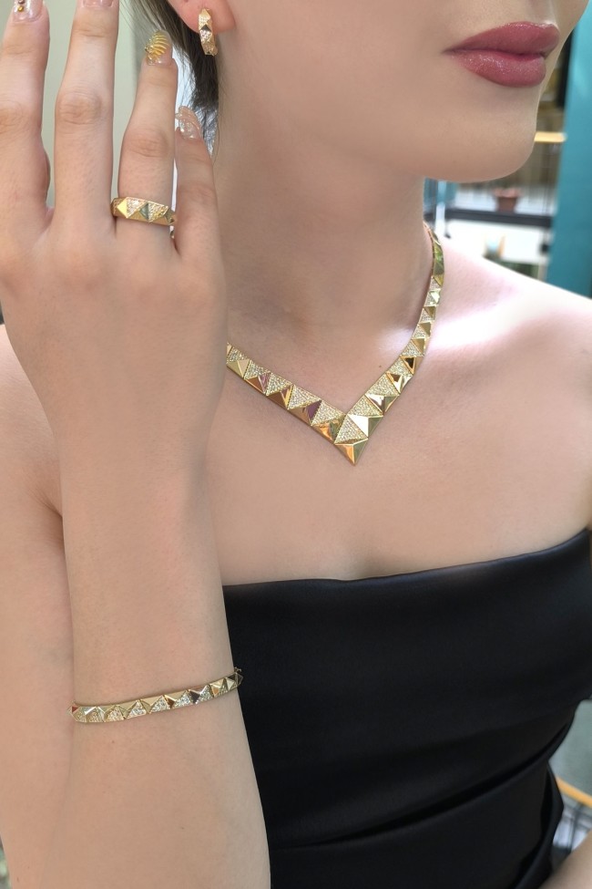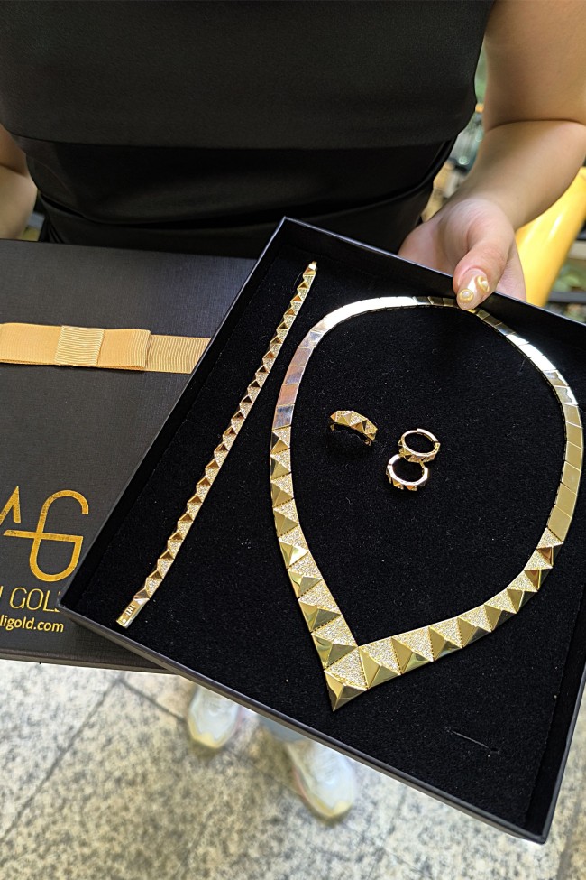 14 Ayar şık ve modern tasarım günlük kullanıma uygun taşsız ışıl ışıl piramit taşlı tasarım 47.20 gram ağırlığında altın gerdanlık, bileklik, küpe ve yüzükten oluşan dört parçalı düğün nişan takı seti.