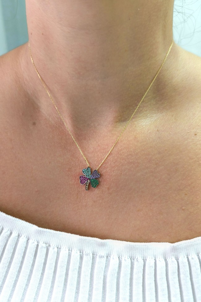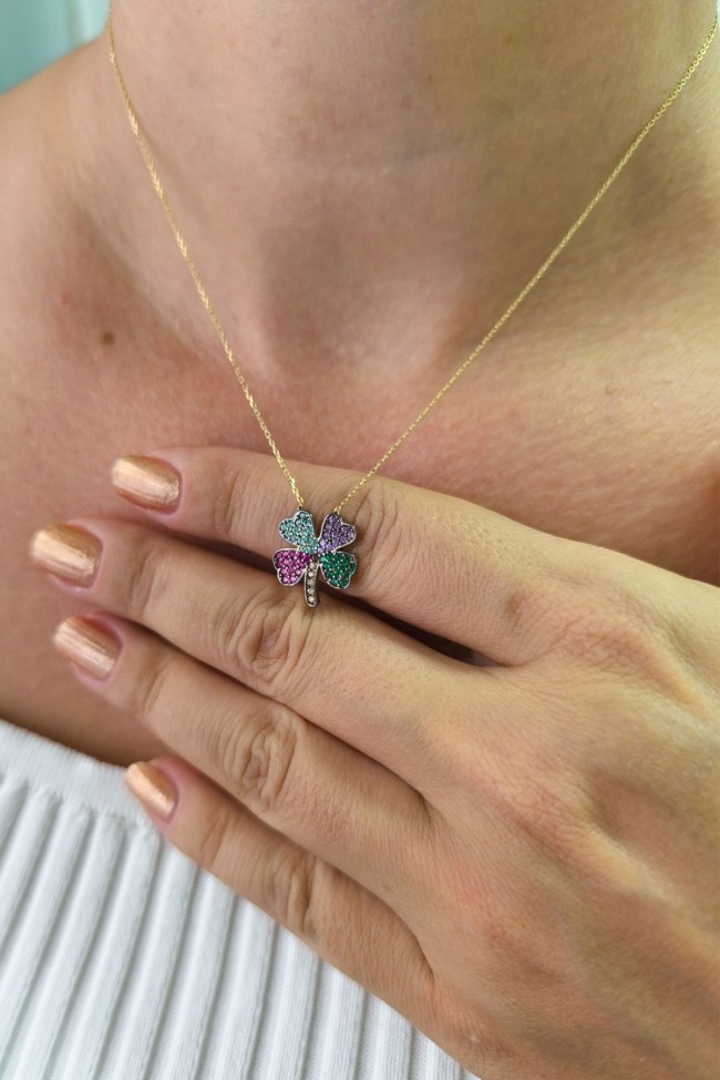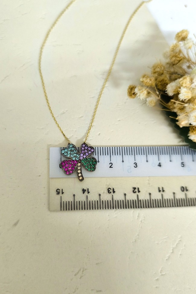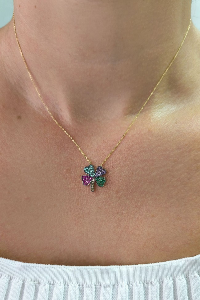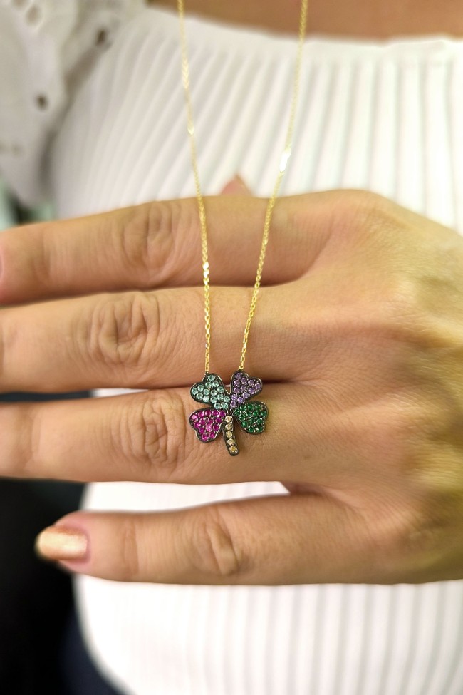45 Cm Zincirli 14 Ayar Renki Taş Detaylı Işıl Işıl Zirkon Taşlı 2.40 Gr. Ağırlığında Altın 4 Yapraklı Yonca Kolye.
