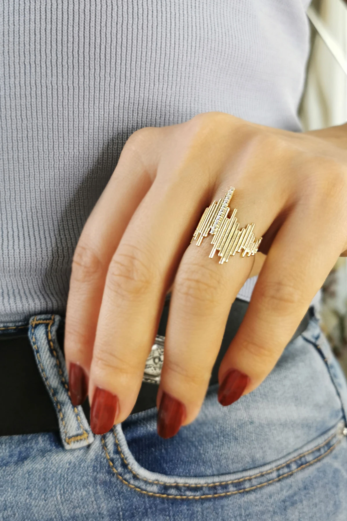 14 ayar sarı altın trend tasarımıyla günlük kullanıma uygun parmağınızda stilinize hava katacak 4.30 gram ağırlığında az taşlı Ritim yüzük.