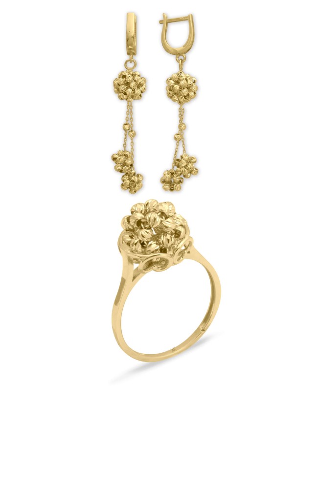 14 Ayar ışıl ışıl modern, top tasarımlı şık bir model günlük olarak da kullanıma uygun 6 Cm boyunda küpesi ve yüzüğü ile 11.00 gram ağırlığında altın dorika ikili takım set.
