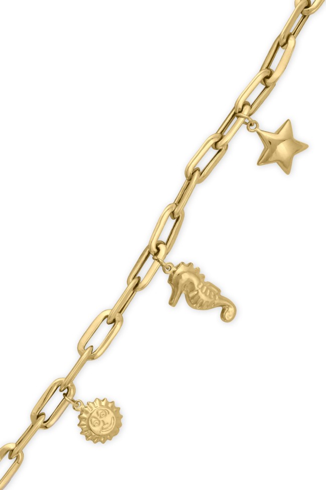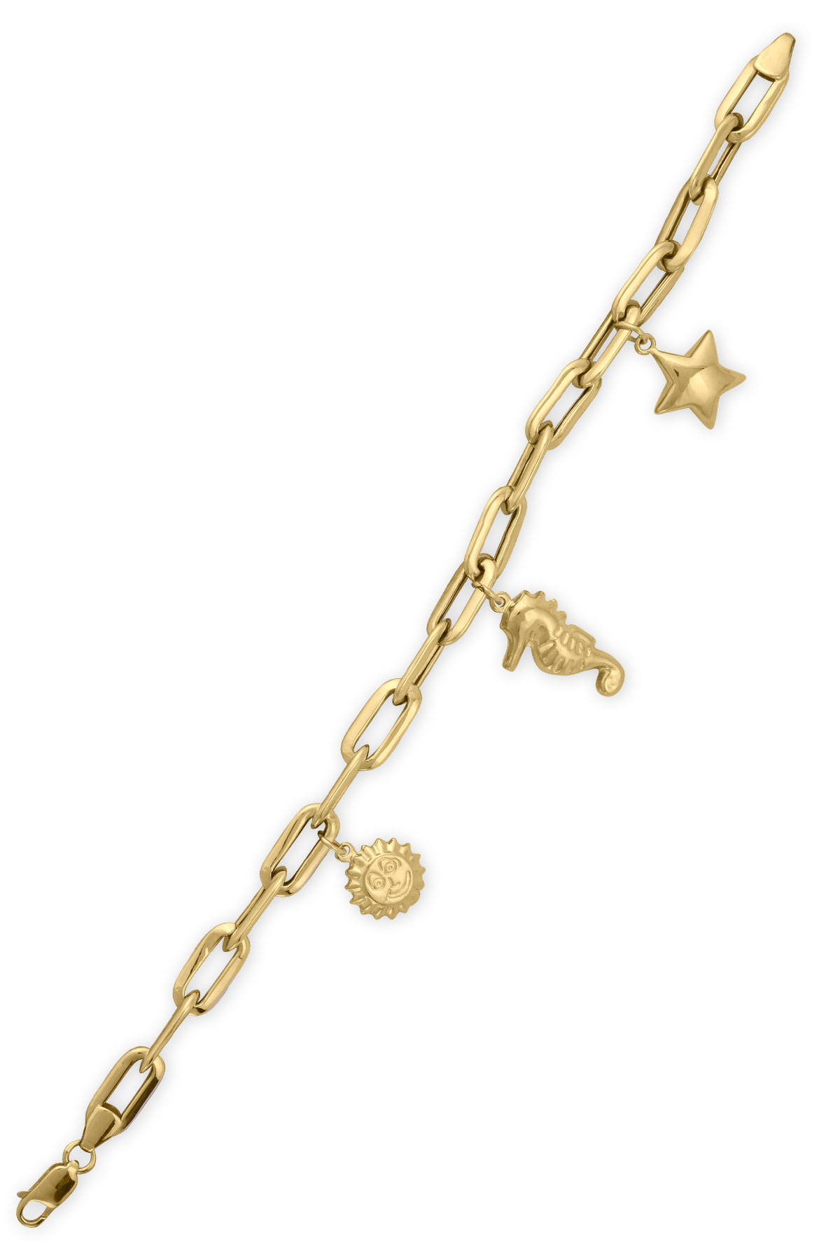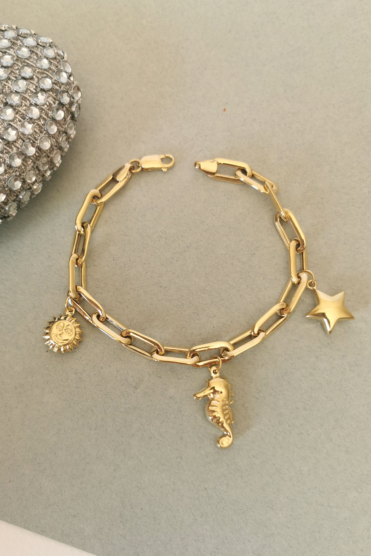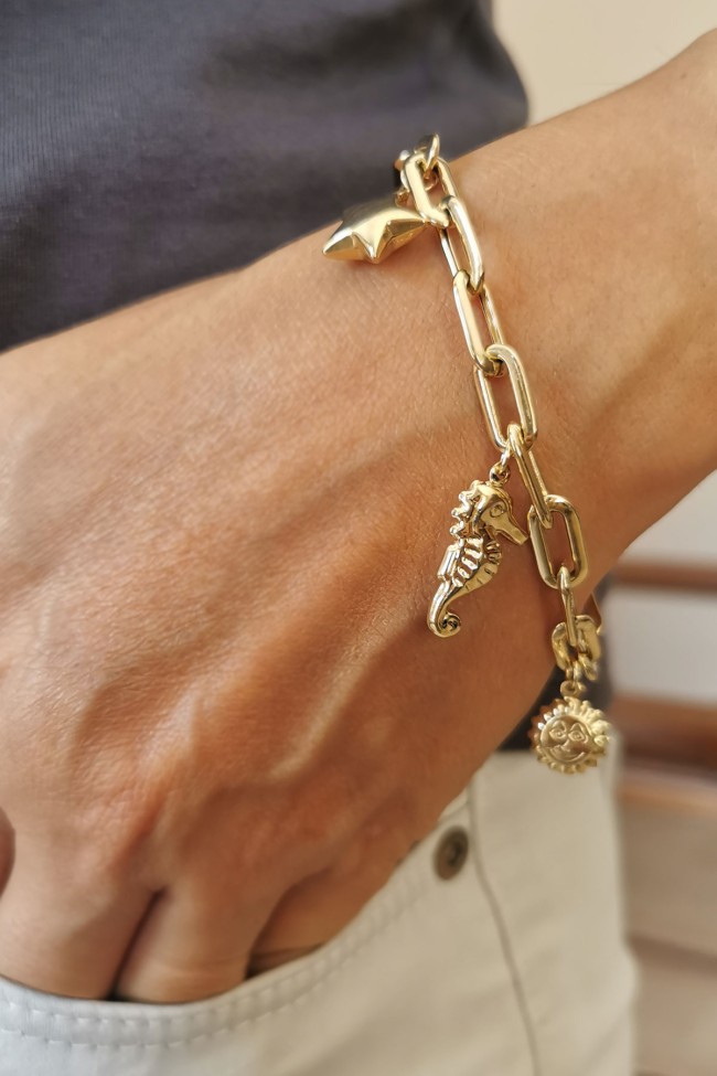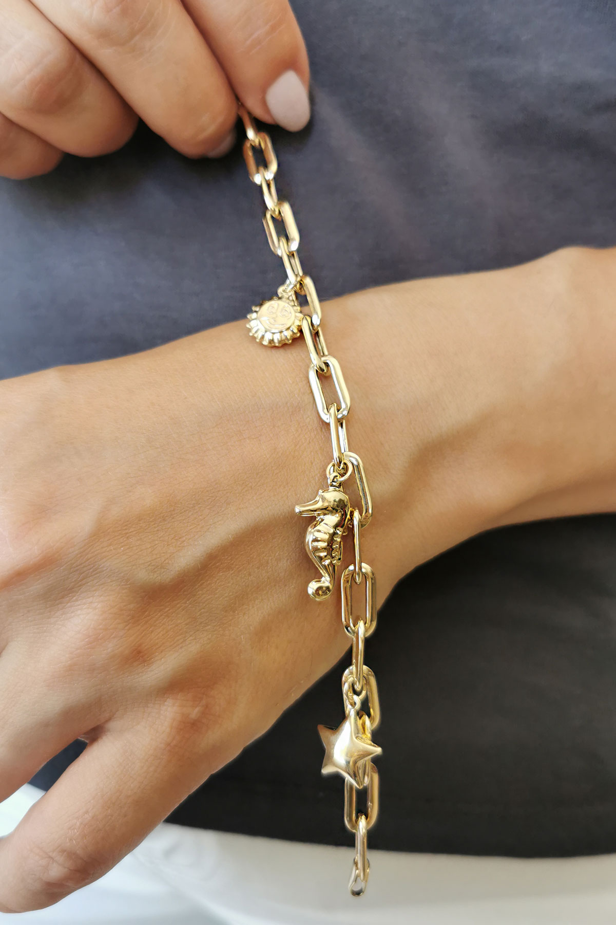 14 Ayar Spor Tüm Giyim Tarzlarınıza Hava Katacak 7.60 Gr Deniz atı, Yıldız Ve Güneş Detaylı Günlün Kullanıma Uygun Ataç Model Şans Bileklik.