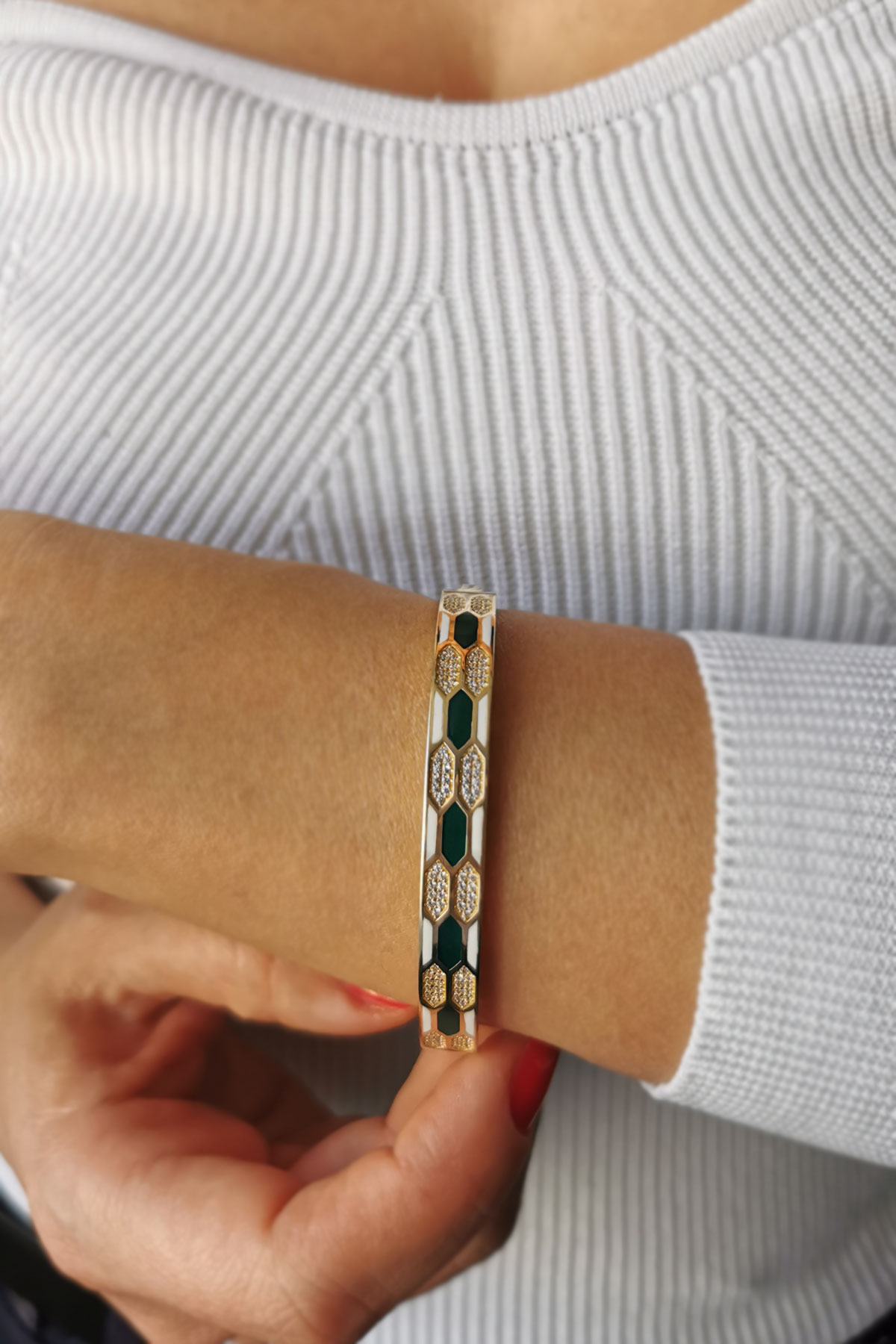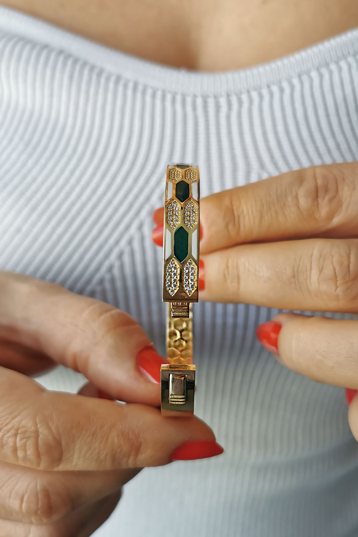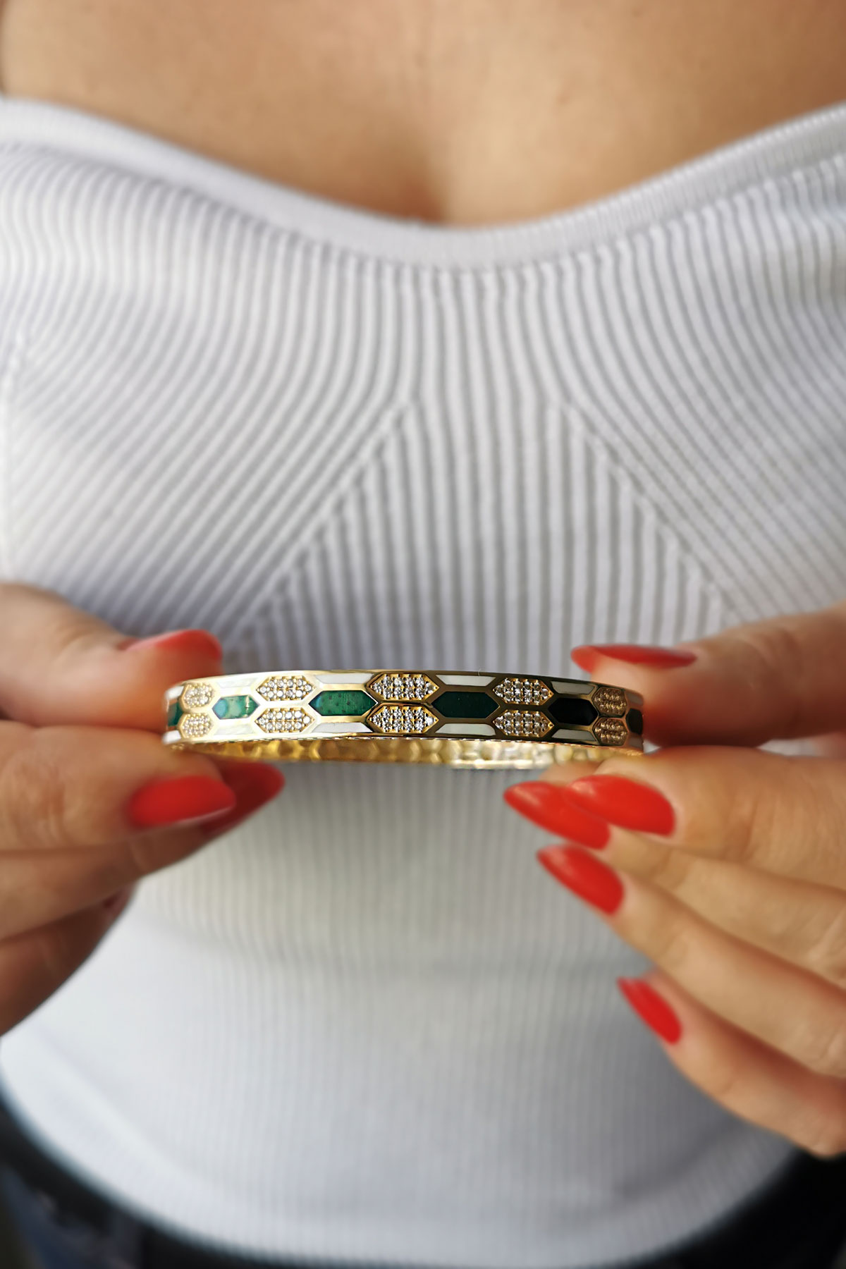 13.00 Gram Ağırlığında 7.2 Mm Genişliğinde 14 Ayar Füzyon Model Üzeri Mine Ve Sedef İşi El İşçiliği İle Özel Olarak Üretilen Kelepçe Bilezik.