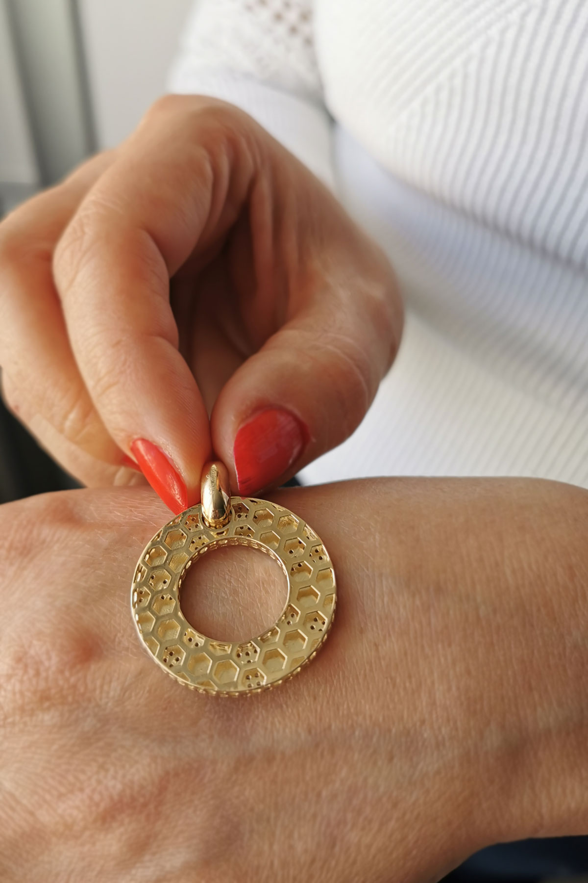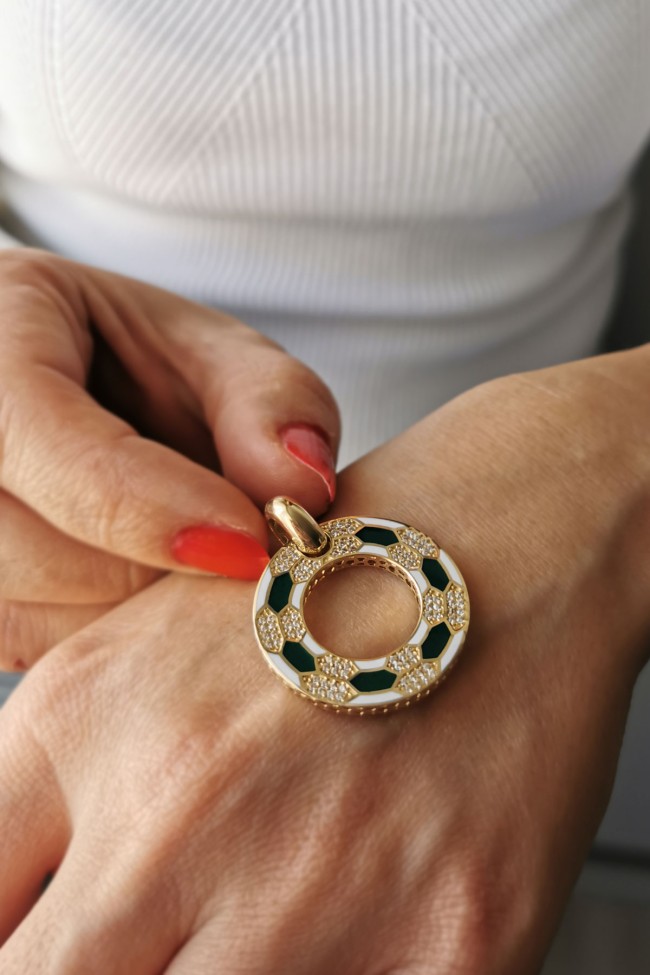 6.80 Gram Ağırlığında 3 Cm Çapında 14 Ayar Füzyon Model Üzeri Mine Ve Sedef İşi El İşçiliği İle Özel Olarak Üretilen Madalyon Çember Kolye Ucu.