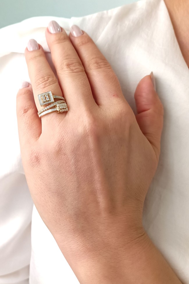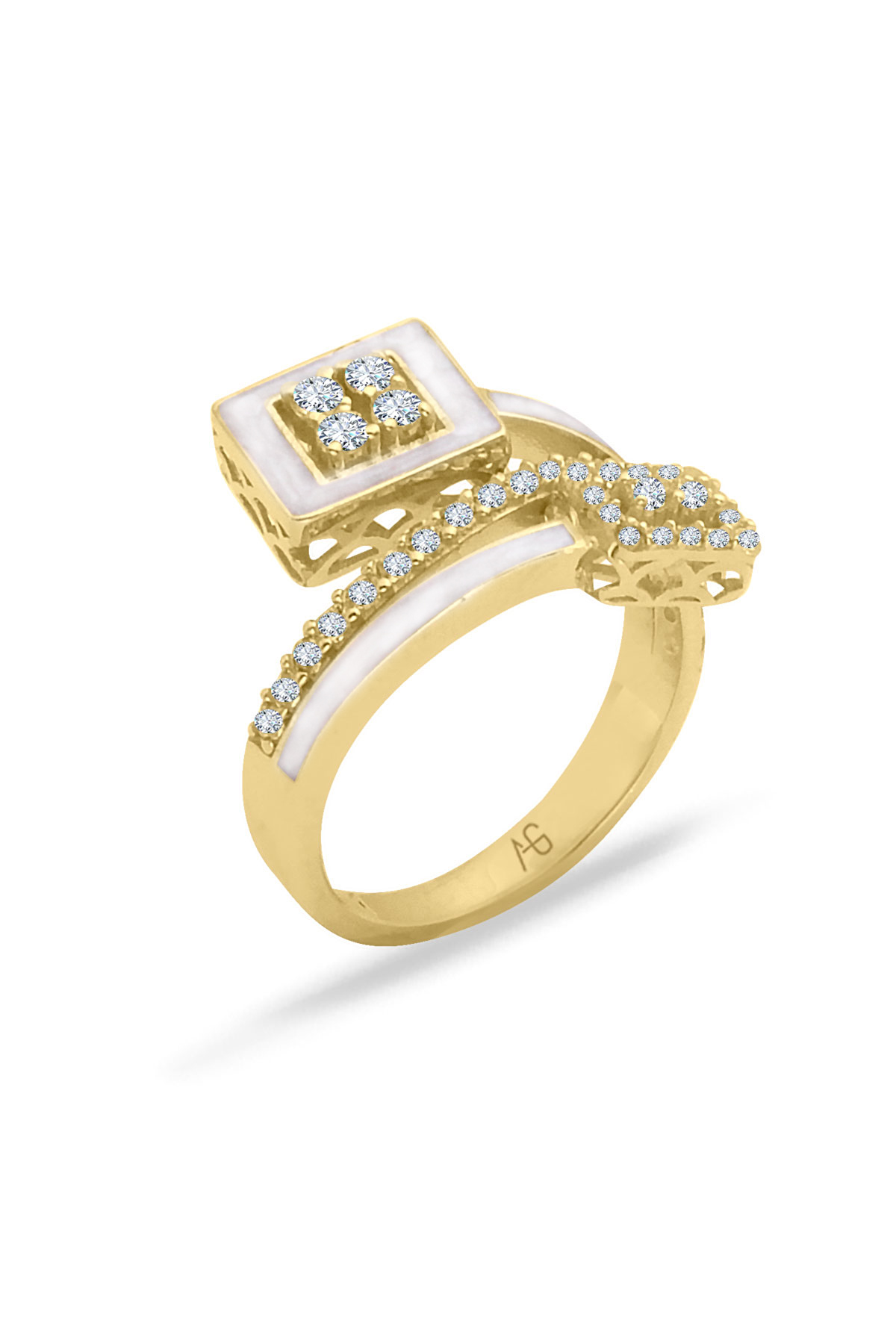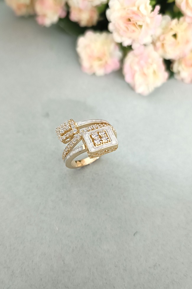 Zirkon taş detaylı model ışıl ışıl 14 ayar 4.60 gr ağırlığında harika bir duruşa sahip modern tasarım altın sedef beyaz mineli baget yüzük.
