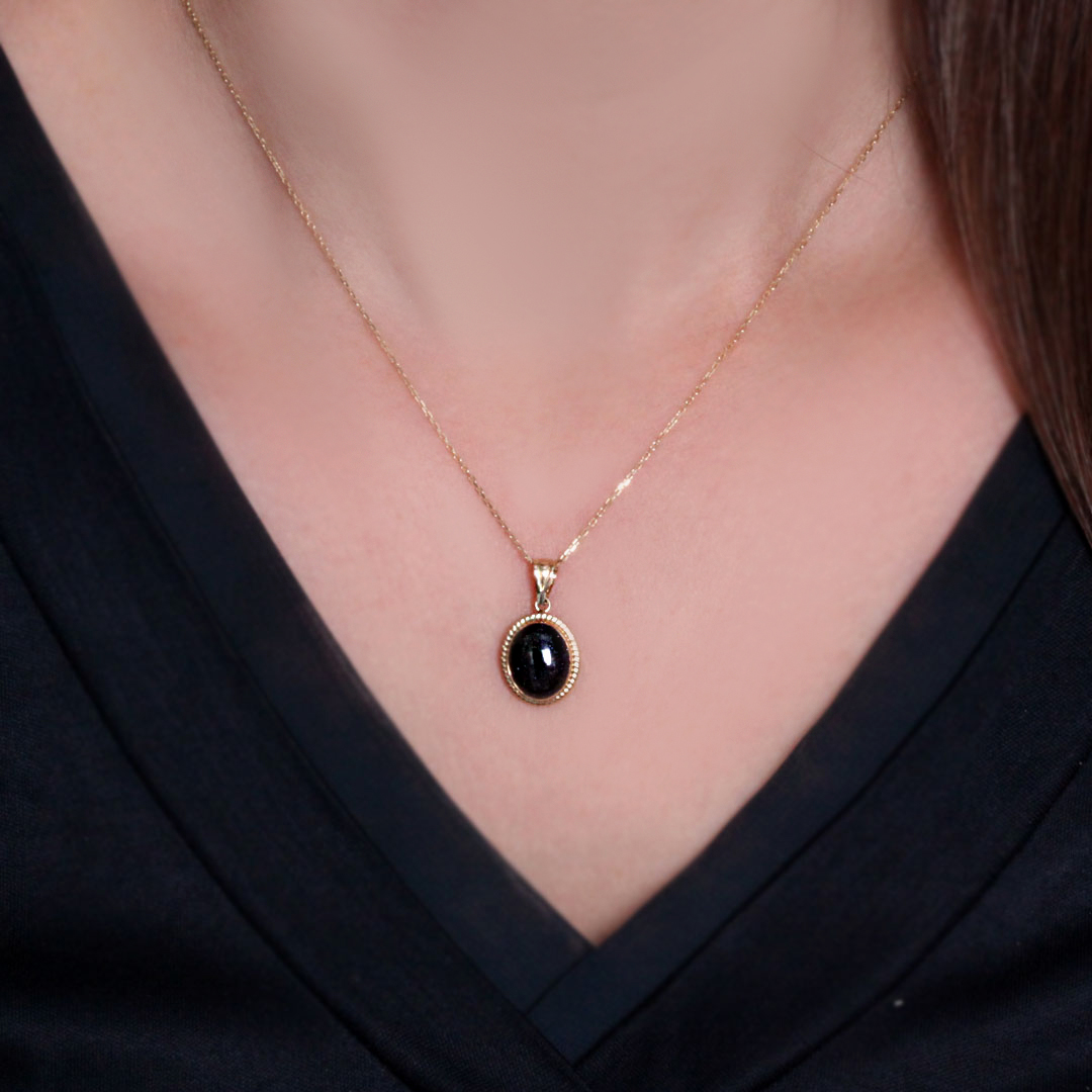 14 Ayar nostalji tasarımına eşlik eden simli onix taş detaylı şık ve ışıltılı tasarımlara düşkün kadınların severek kullanacakları elegan duruşa sahip günlük kullanıma uygun 2.90 gram ağırlığında altın kolye.