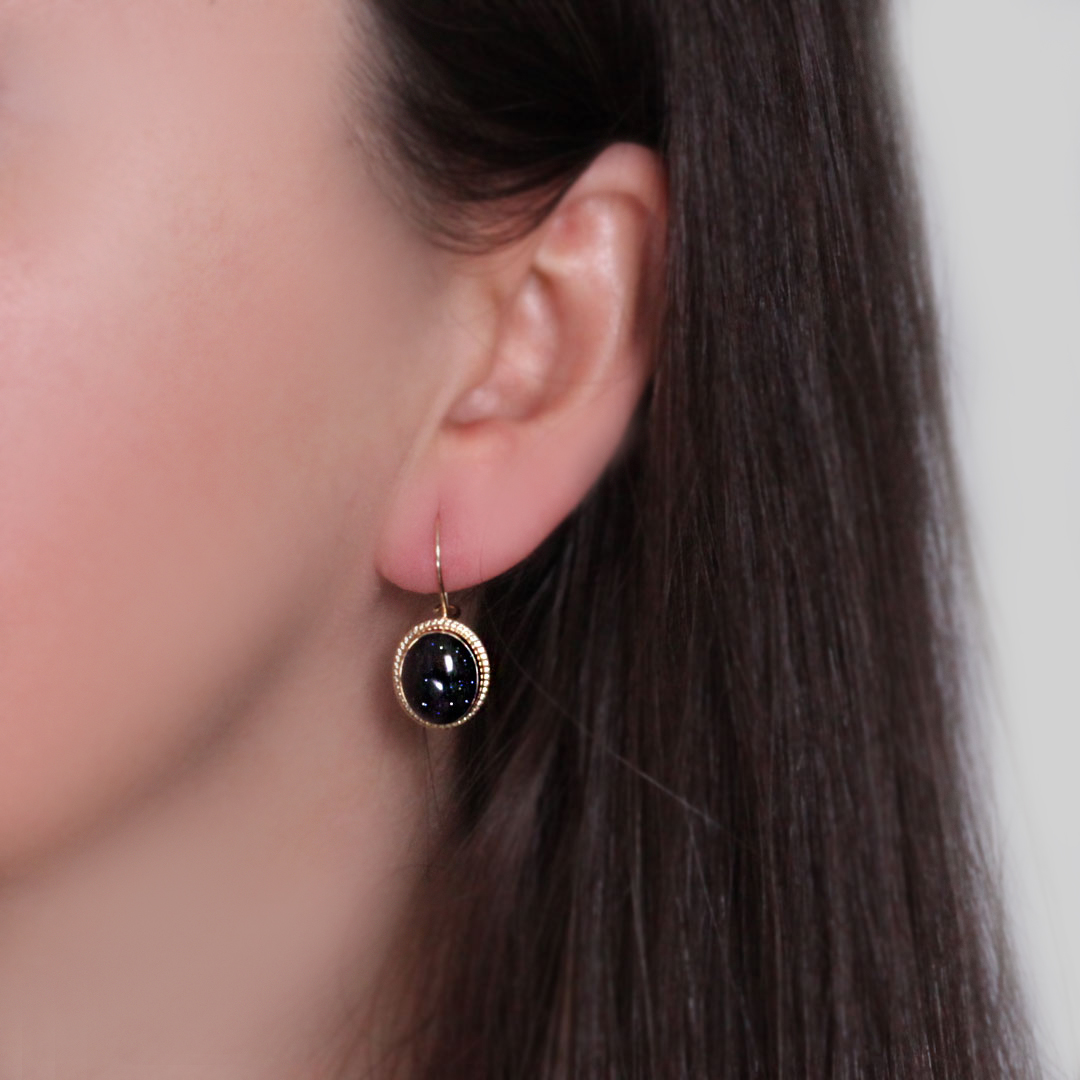 14 Ayar nostalji tasarımına eşlik eden simli siyah onyx taş detaylı şık ve ışıltılı tasarımlara düşkün kadınların severek kullanacakları elegan duruşa sahip günlük kullanıma uygun 3.15 gram ağırlığında altın nostalji küpe.