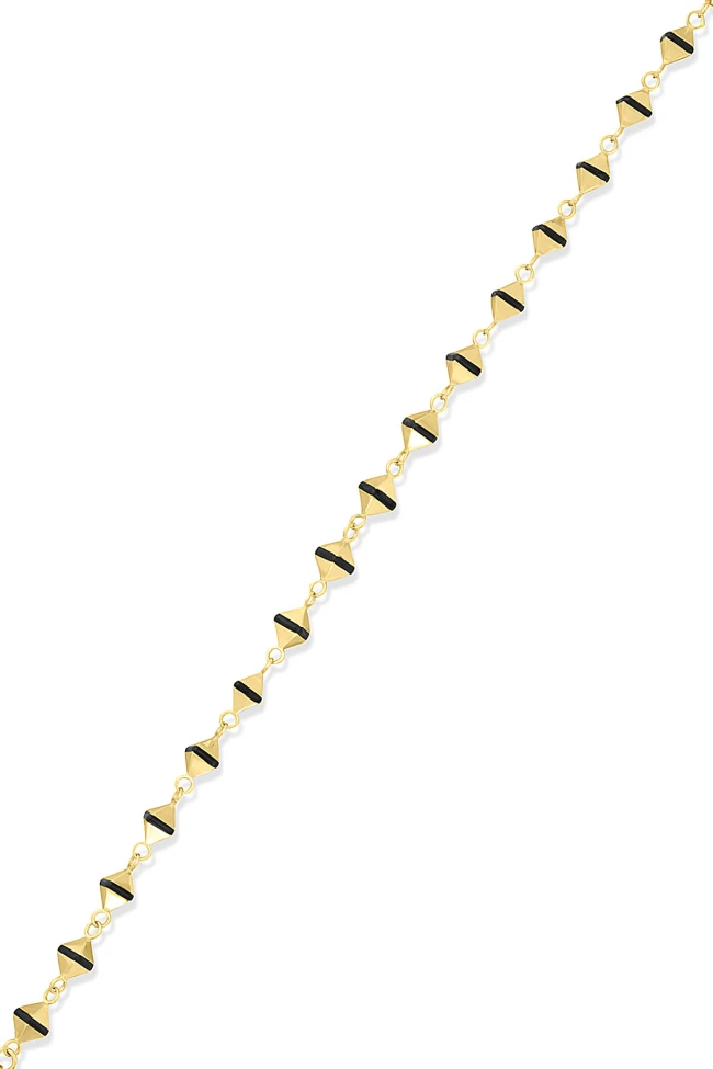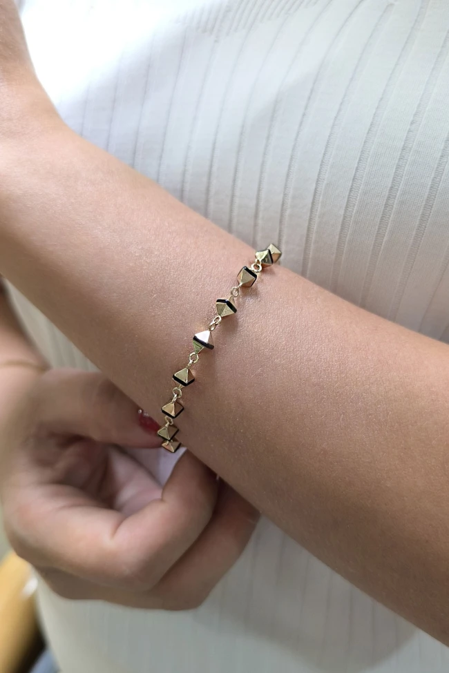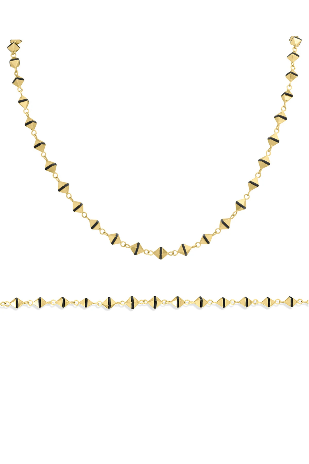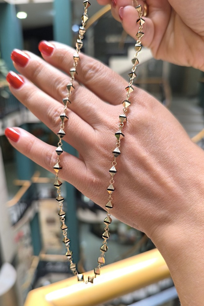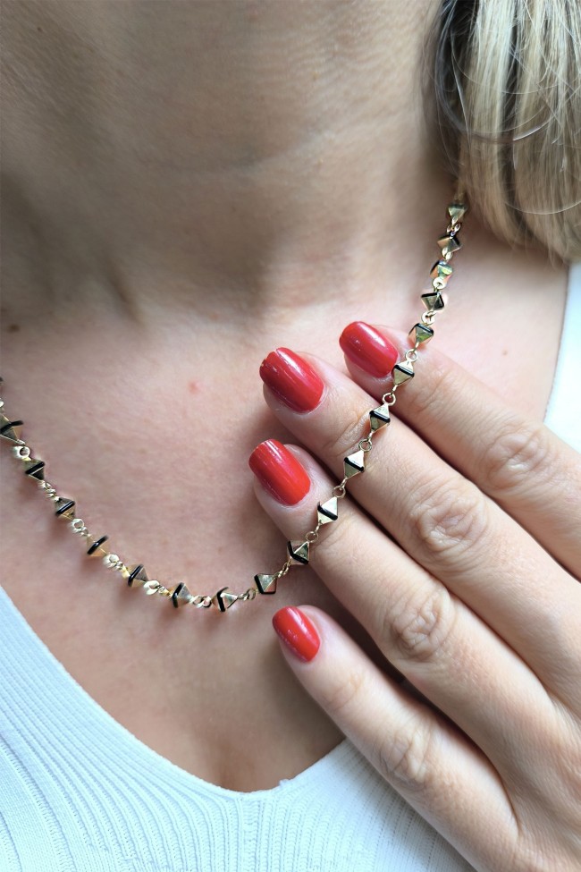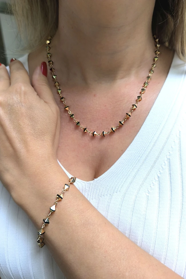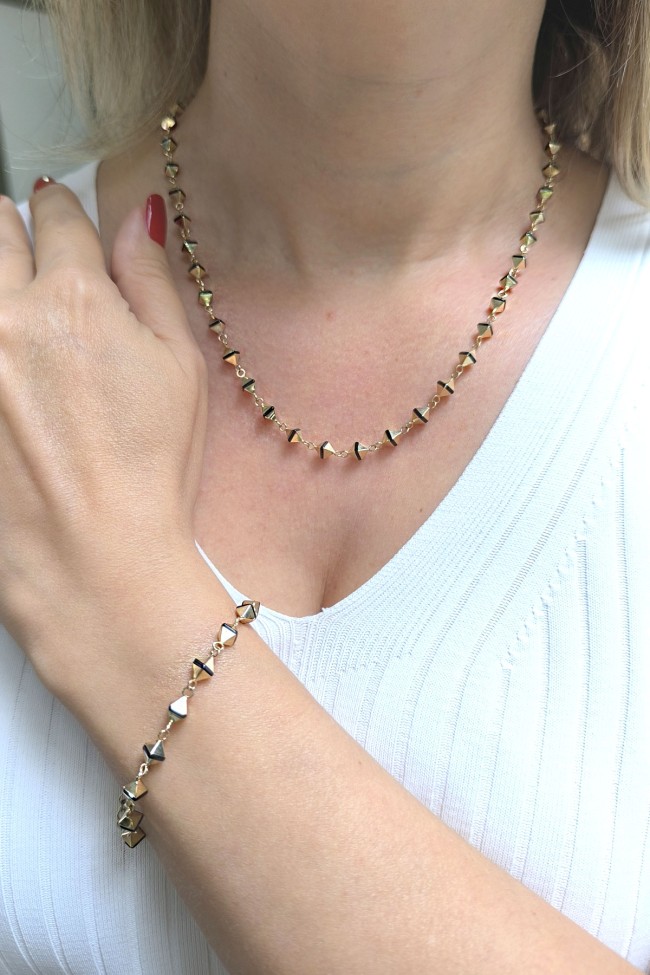 Spor tarz 19+2 Cm Boyunda Bileklik, 50+2 Cm Boyunda Kolyesi Olan Model 17.95 Gr. Ağırlığında 14 Ayar Altın, Piramit Tasarım, Siyah Mineli Unisex Bileklik Kolye Set.