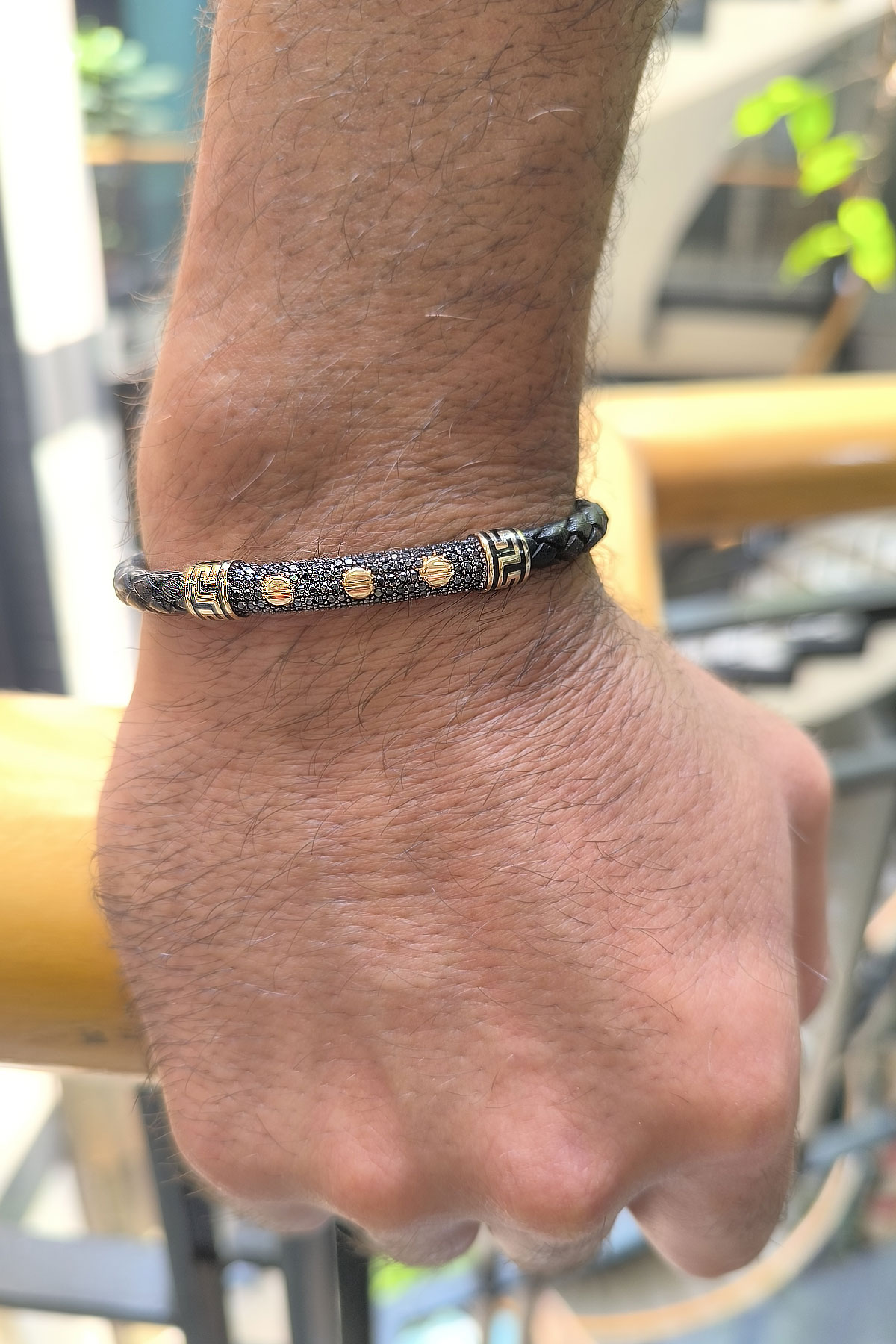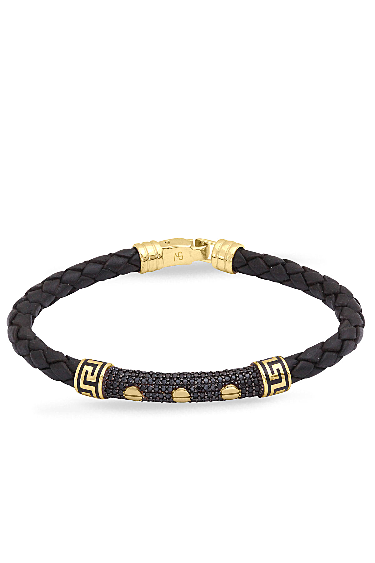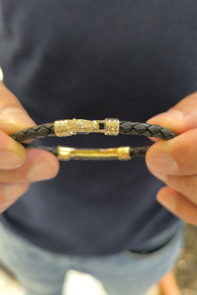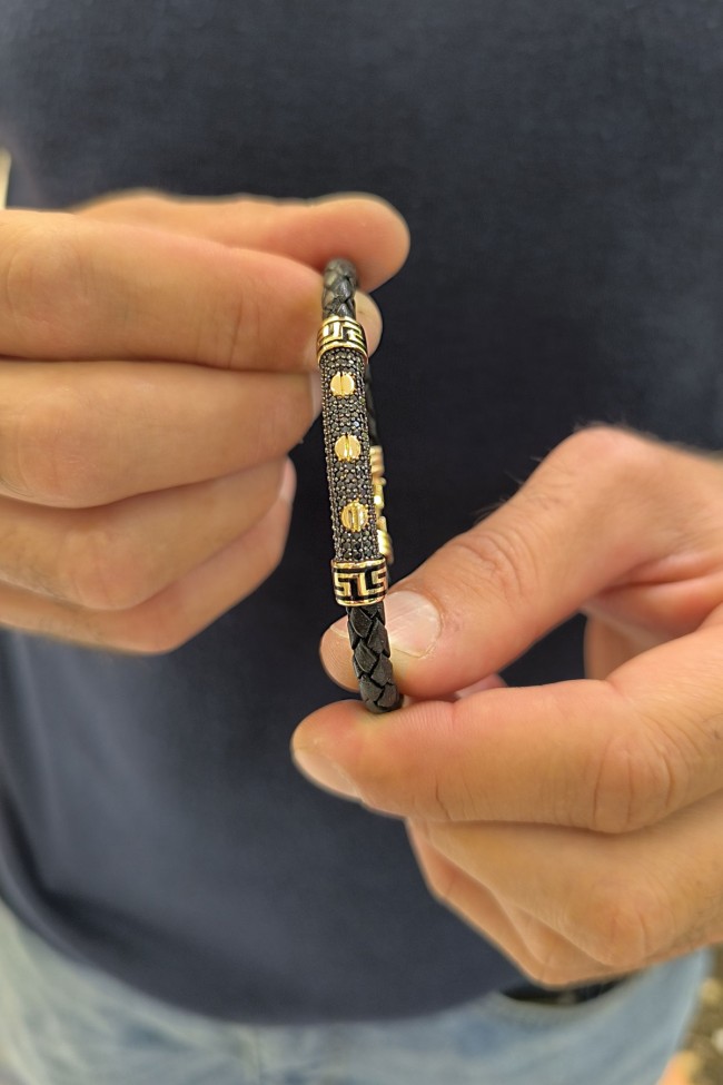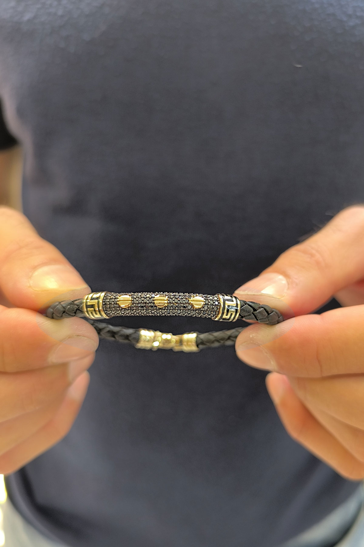 Prestij Ve Tarz Sahibi Beylerin Severek Kullanacağı 14 Ayar Siyah Taş Ve Çivi Başı Model Detaylı Günlük Kullanıma Uygun Deri Spor Altın Erkek Bileklik.