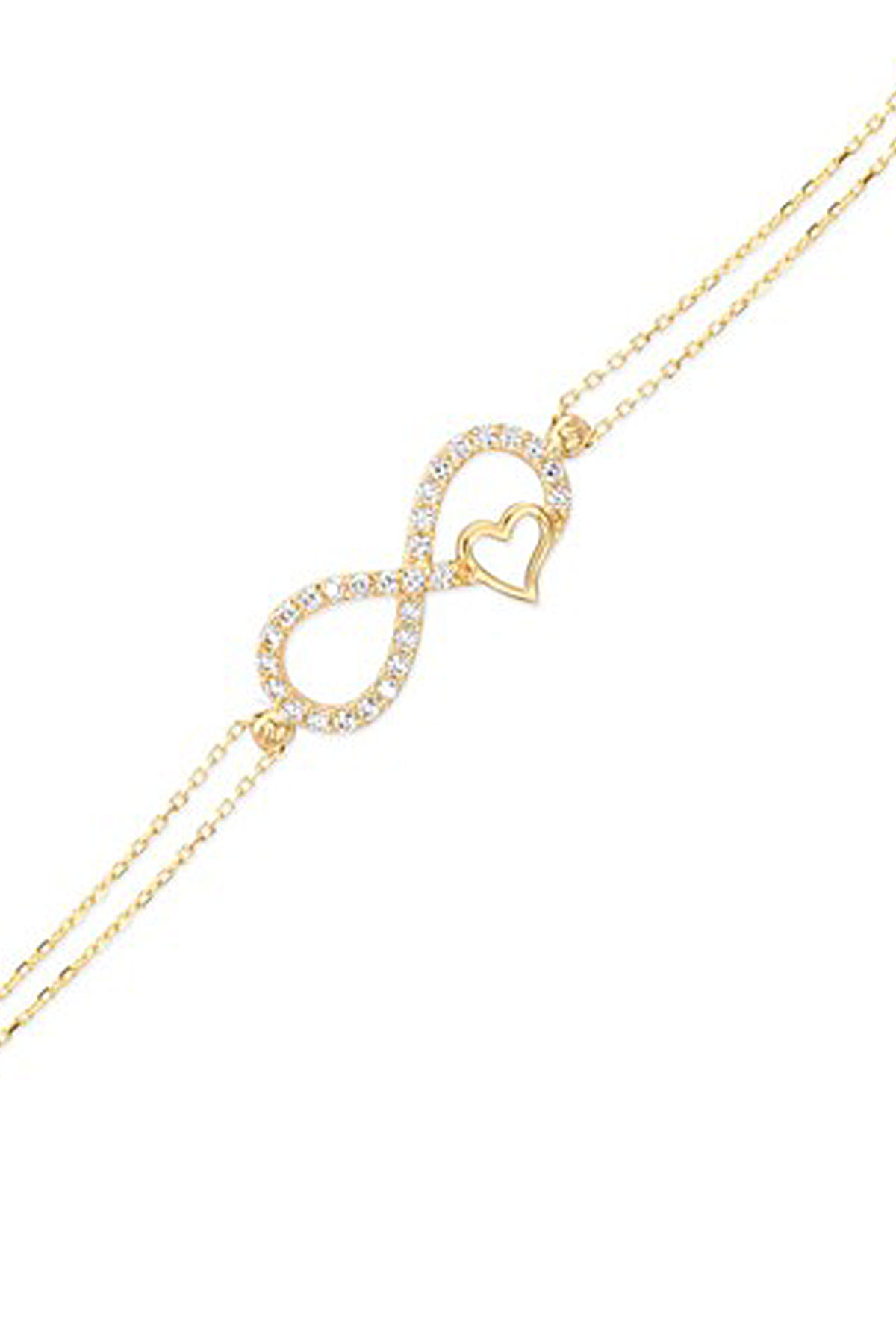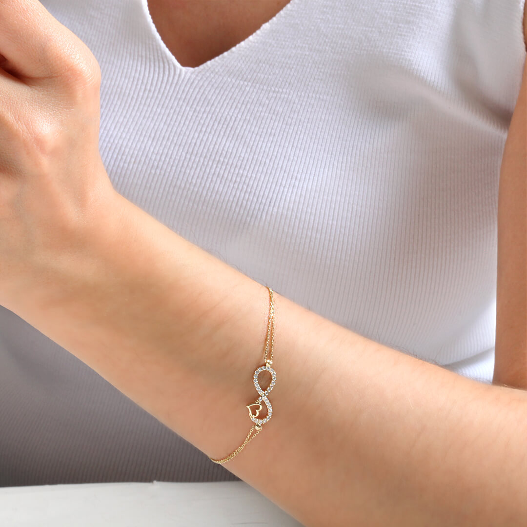 Altın Sonsuzluk ve kalp detaylı sevdiklerinize özel günlerinde armağan edebileceğiniz 1.80 gram ağırlığında 14 ayar hediyelik bileklik. Model günlük spor kullanıma uygundur.