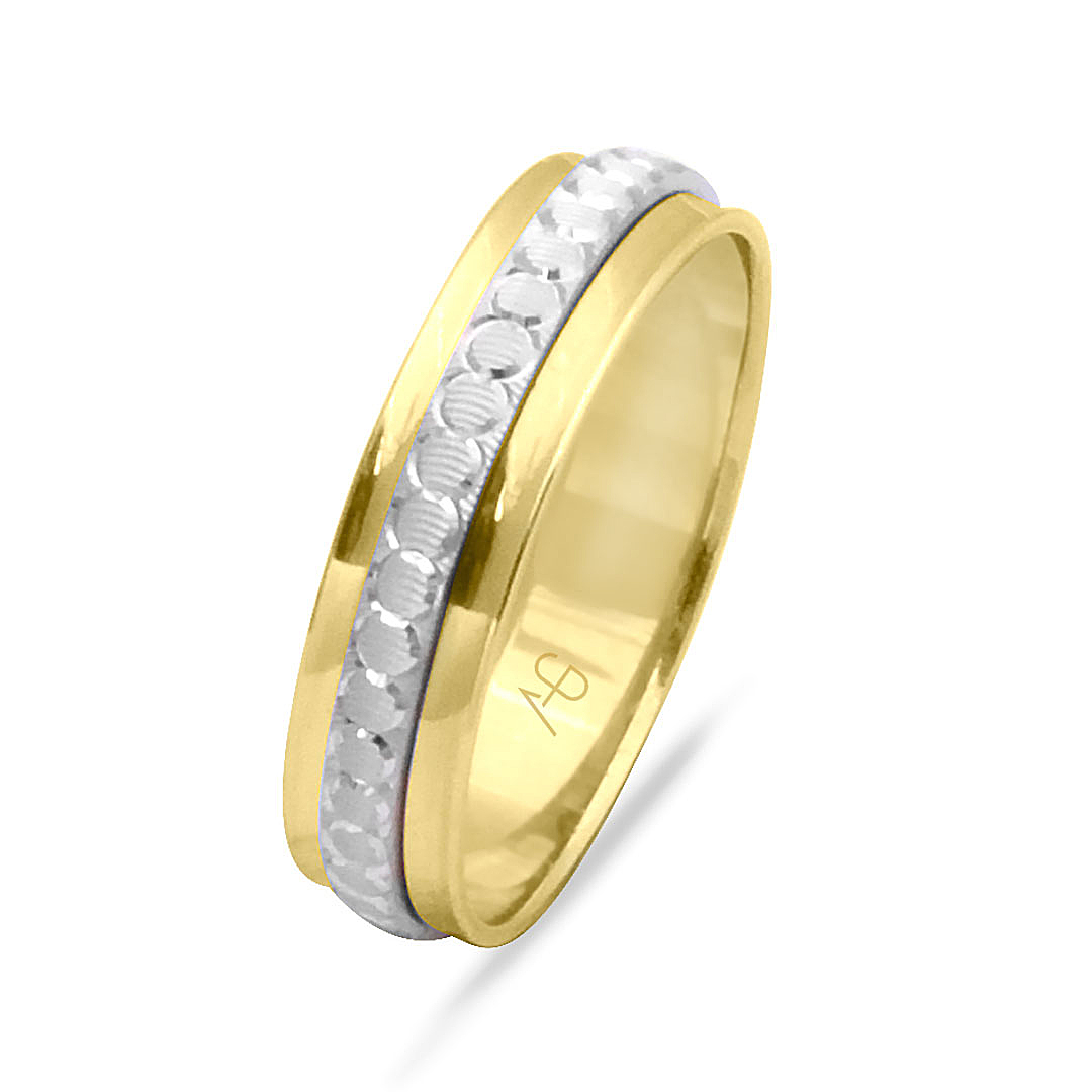 14 Ayar sarı-beyaz altın orta kısmı bombeli ve yuvarlak kalem işlemeli şık duruşa sahip günlük kullanıma uygun 3.00 gram ağırlığında taşsız hem kadın hem erkek kullanımına uygun söz nişan yüzüğü.