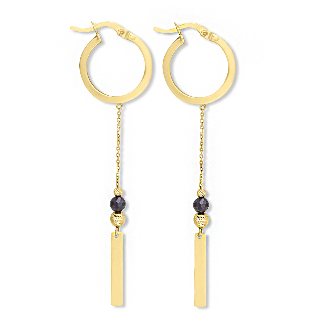 Çember tasarıma eşlik eden zincirli çubuk parça detayı ile ışıl ışıl bir modele sahip zirkon siyah mini taş detay 7 cm günlük olarak da severek kullanacağınız size çok yakışacak 2.70 gr ağırlığında 14 ayar altın küpe.