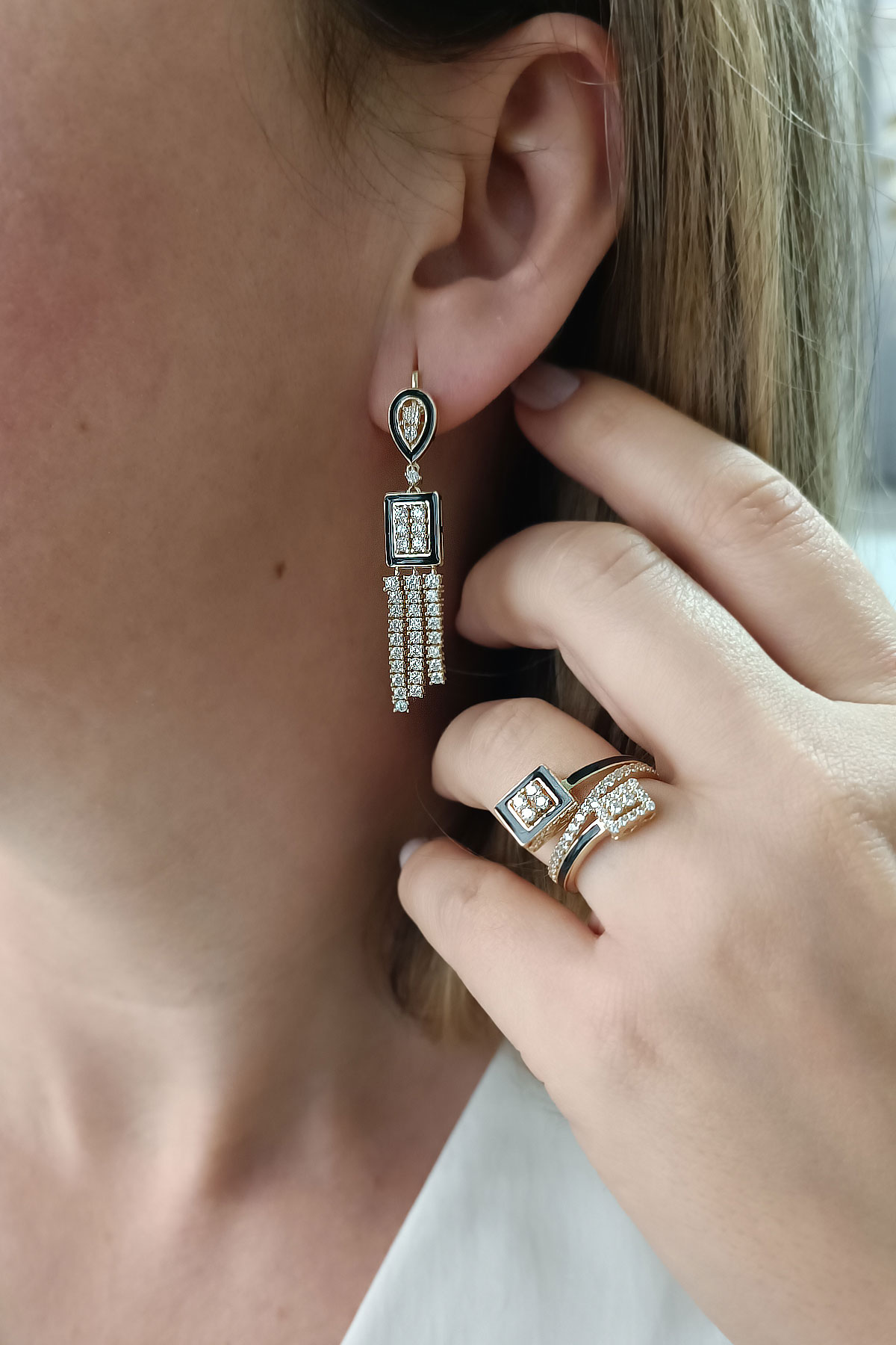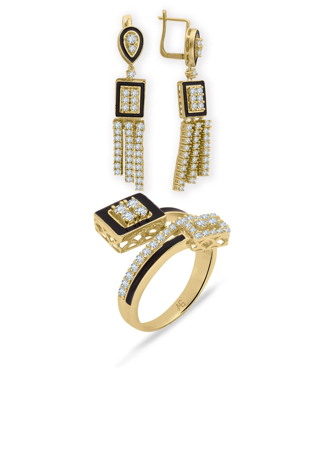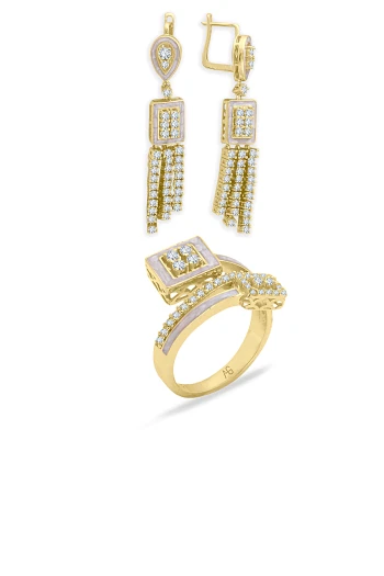 Zirkon taş detaylı model ışıl ışıl 14 ayar 14.45  gr ağırlığında 5 cm boyunda harika bir duruşa sahip modern tasarım altın sedef beyaz mineli su yolu yüzük küpe takım.