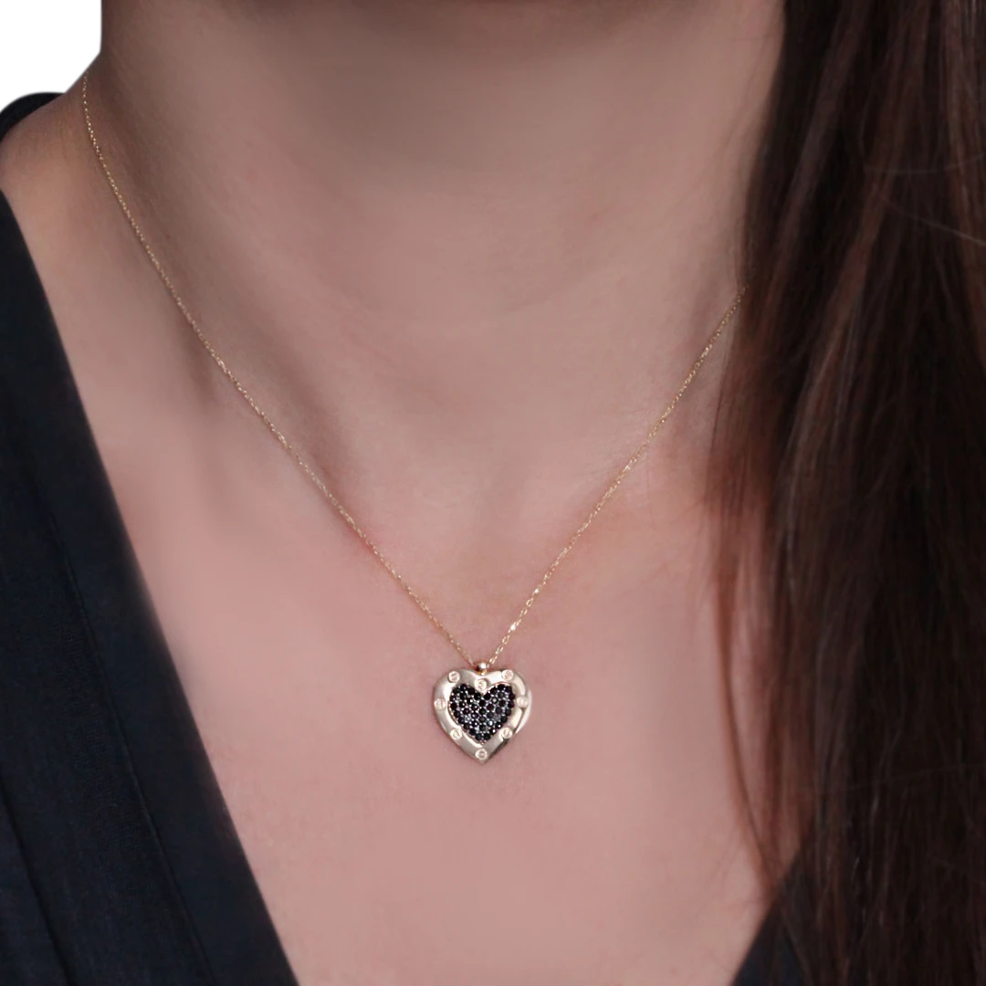 Siyah zirkon taşlarının enerji dolu kombinasyonu ile oldukça şık ve havalı bir duruşa sahip minimal altın kalp kolyeyle günlük stiline ışıltı katmaya hazır mısın? Tüm giyim kombinasyonlarınızla muhteşem uyum sağlayacak! Model boyutu 1.5 Cm'dir, 14 ayar altın kendinden zincirli kolyemiz 2,60 gram ağırlığındadır. *Ürünlerimiz faturalıdır güvenle satın alabilirsiniz, özel hediye kutusunda ücretsiz kargo ile gönderilecektir.
