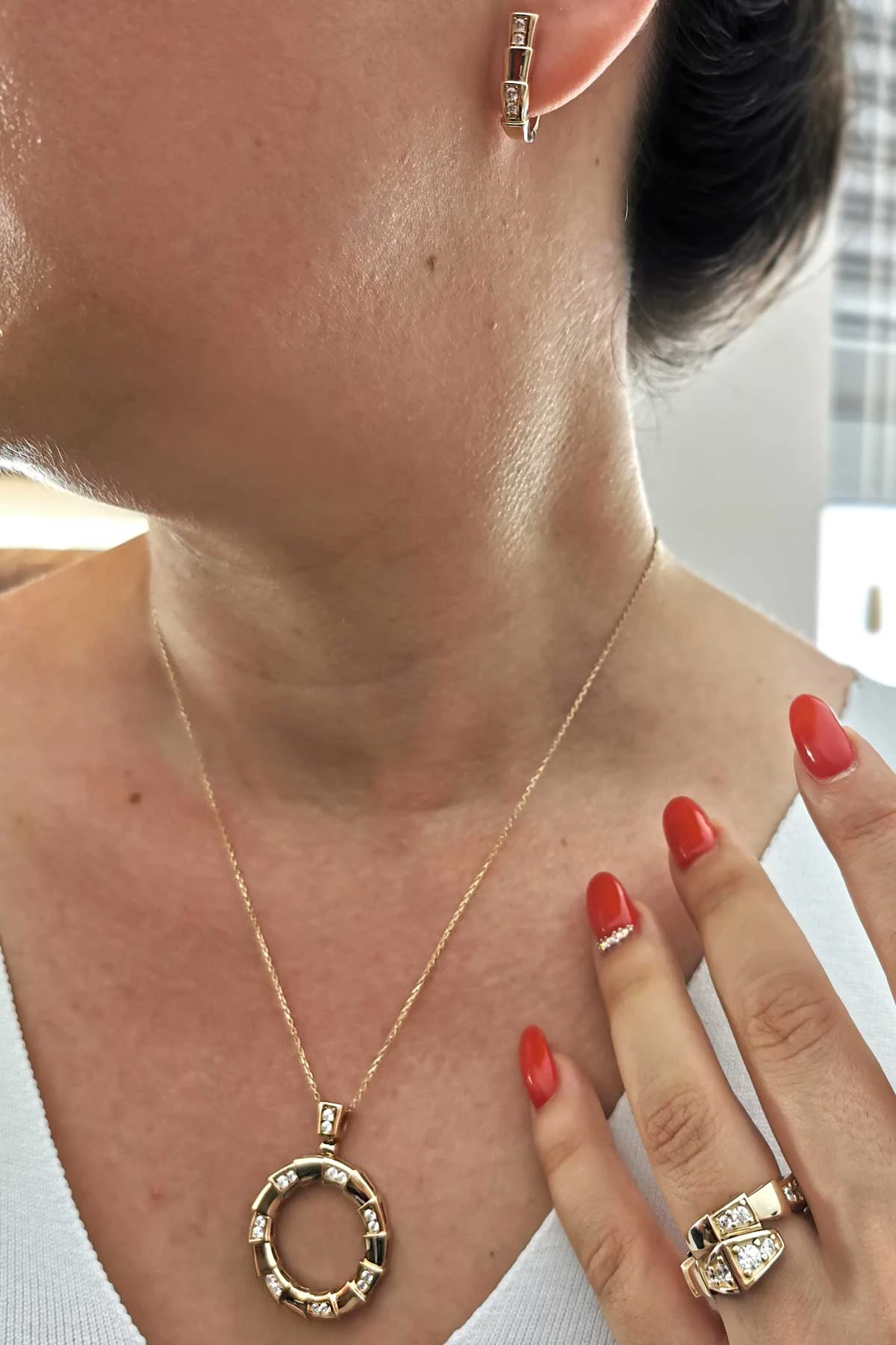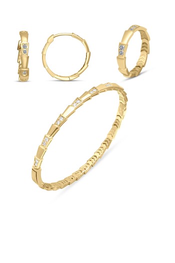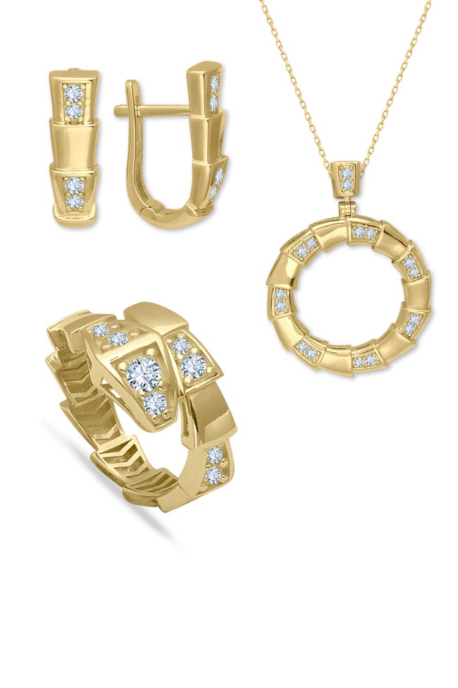 14 Ayar gösterişli ve şık tasarımı ile spor duruşa da sahip günlük kullanıma uygun 14.60 gram ağırlığında taş atlamalı model altın yüzük, kolye küpe takım..